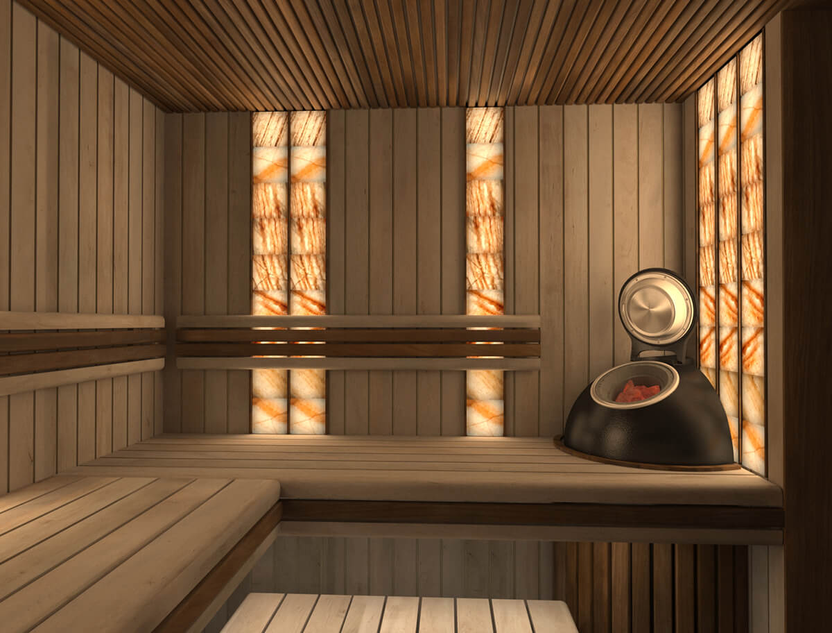 Стены декорированы гималайской солью с подсветкой. 9 плиток в столбце. 9 столбцов и, соответственно, 9 рядов. В раскладке спрятано число 999.