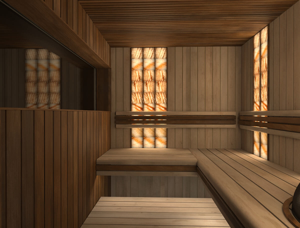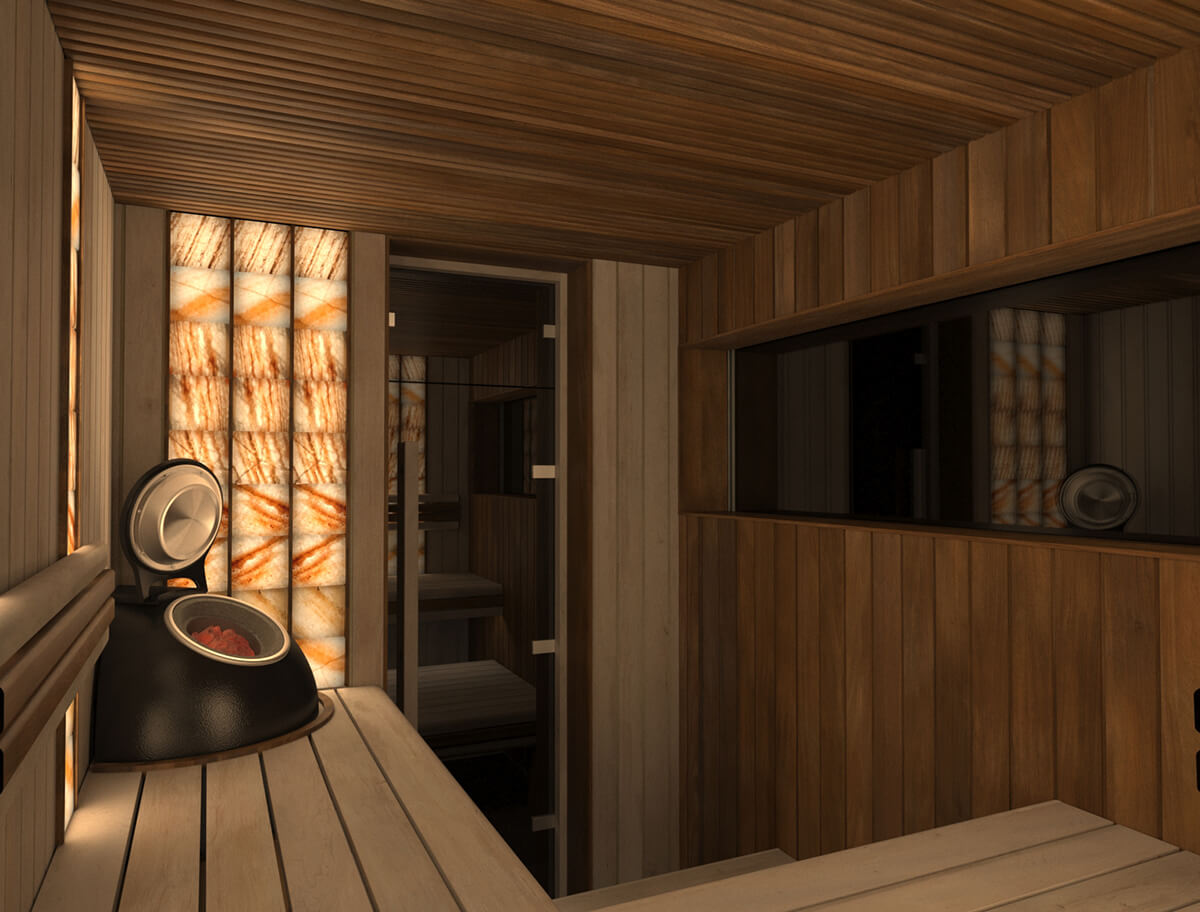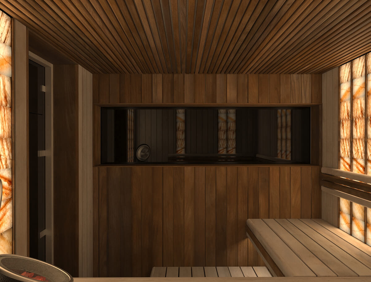 Пространство сауны раздвигается за счет панорамных окон, из которых открывается вид на залив. Потолок выполнен из уникальной реечной вагонки из термоабаша. На стенах — вагонка из ольхи и термоабаша.