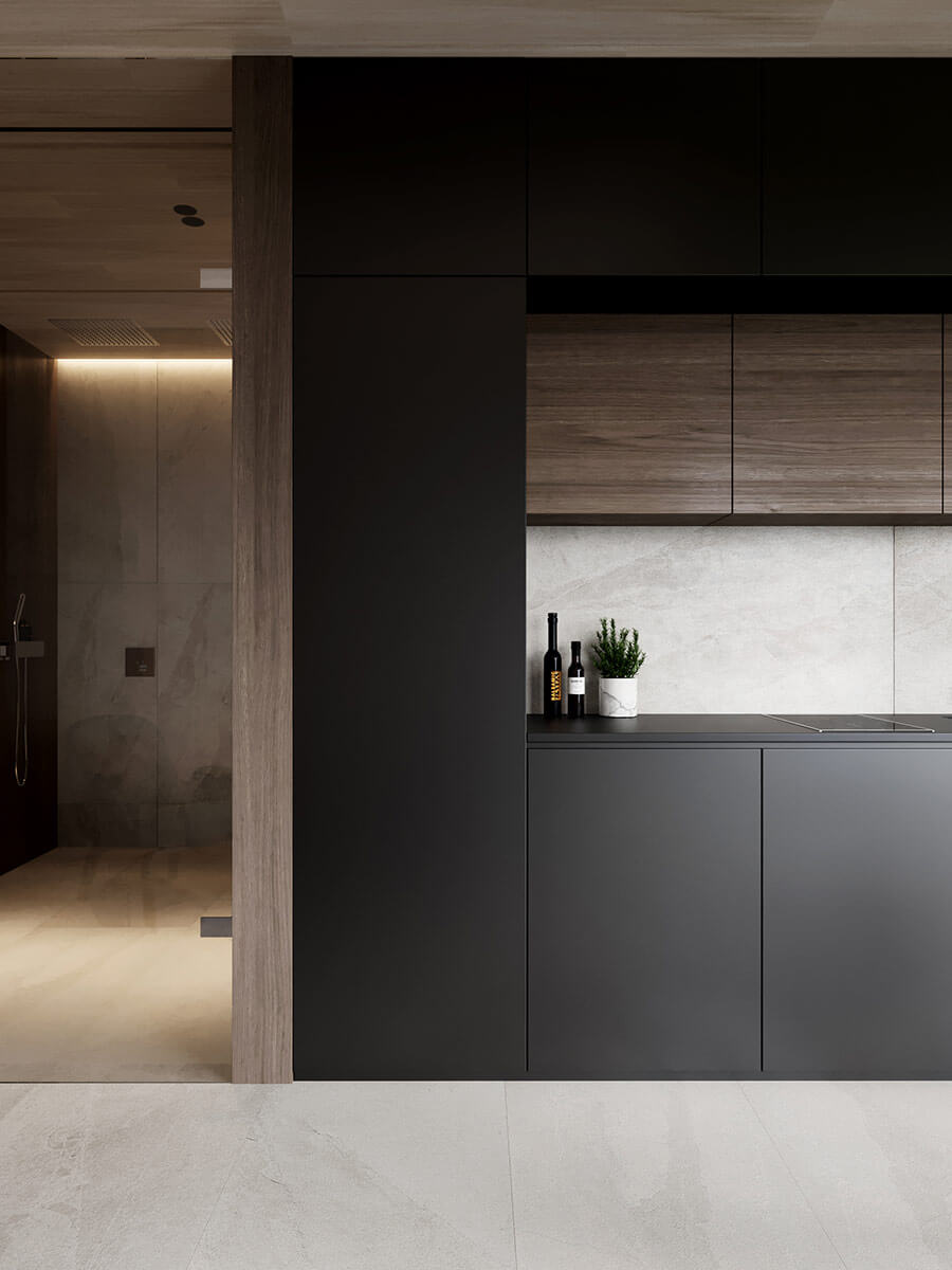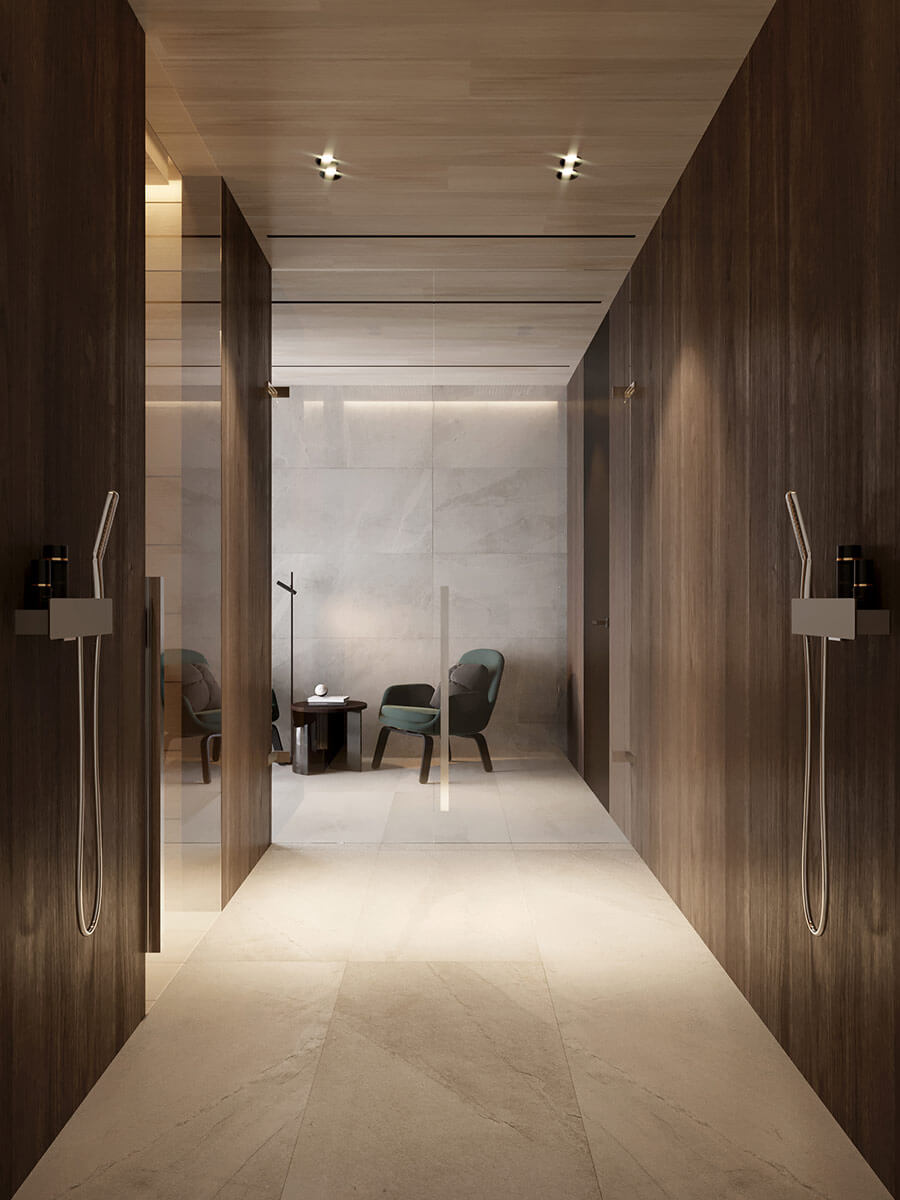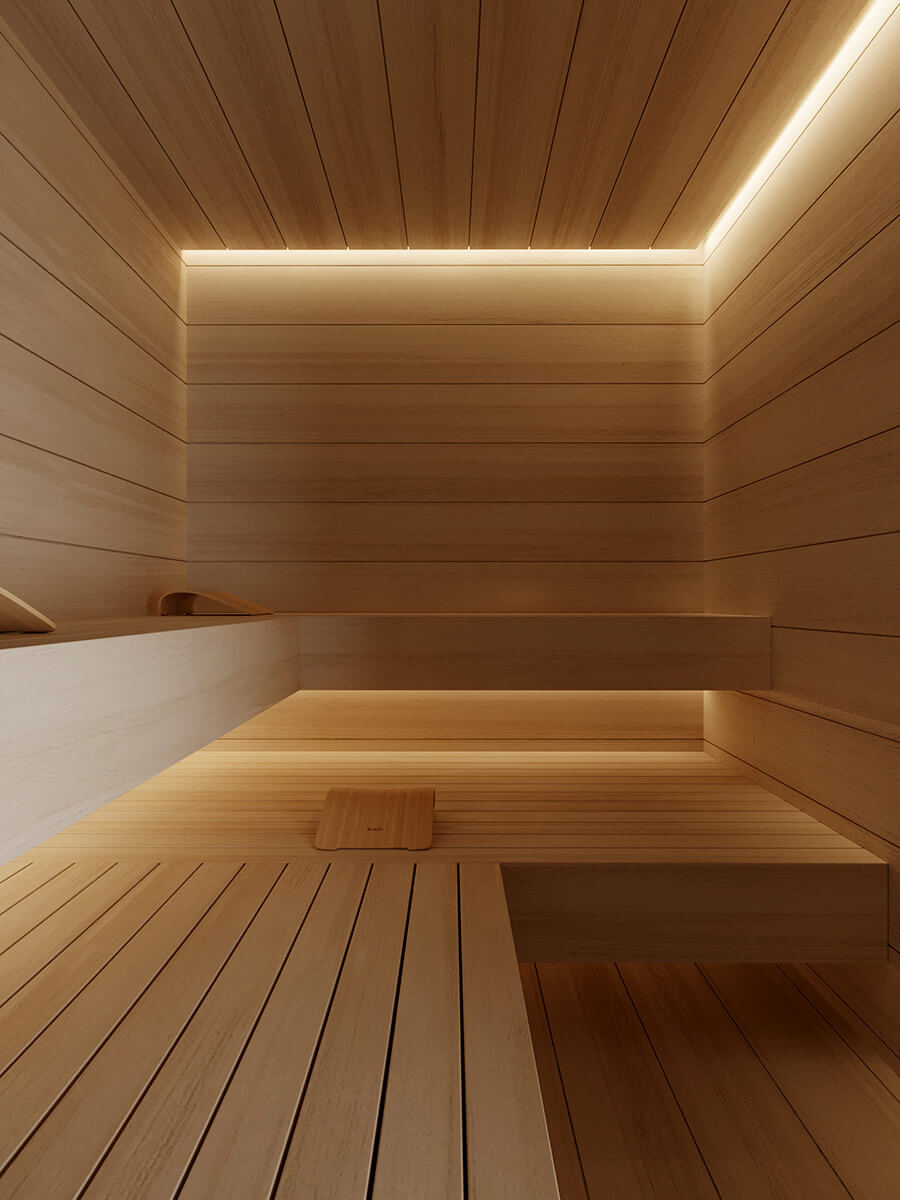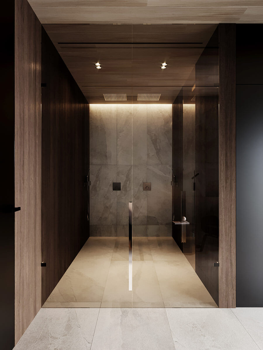 Предлагаем посмотреть и оценить проект бани, которую мы решили обустроить прямо внутри одного из наших многочисленных проектов современных вилл. Интерьер выглядит весьма просторным, но по факту для проектирования нам было отведено не так много полезной площади. Первое, на что хотелось бы обратить ваше внимание – озаренная светом обеденная зона, открывающая панораму на ландшафты природы. Здесь мы организовали стол на три посадочных места, журнальный стол в окружении уютных кресел и небольшой кухонный гарнитур, в отделке черным нанотехнологичным матовым материалом – Fenix. Минуя стеклянную перегородку, оказываешься в душевой. Она же является проходной зоной между кухней и баней. Парная отделана теплыми оттенками выгонки из липы и обладает эксклюзивной печью по авторским эскизам команды нашего бюро. Так же мы не забыли об организации вместительной гардеробной и санузла. Мы очень постарались, чтобы банные процедуры наших заказчиков были наполнены уютом