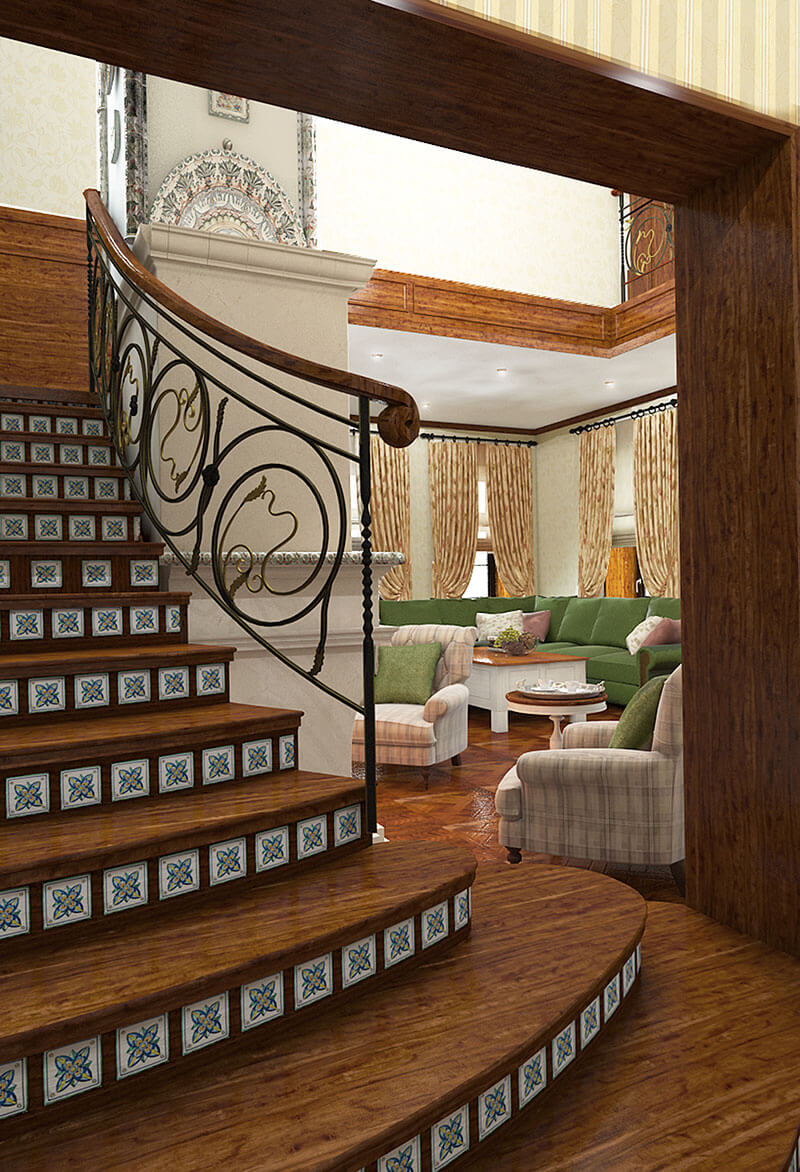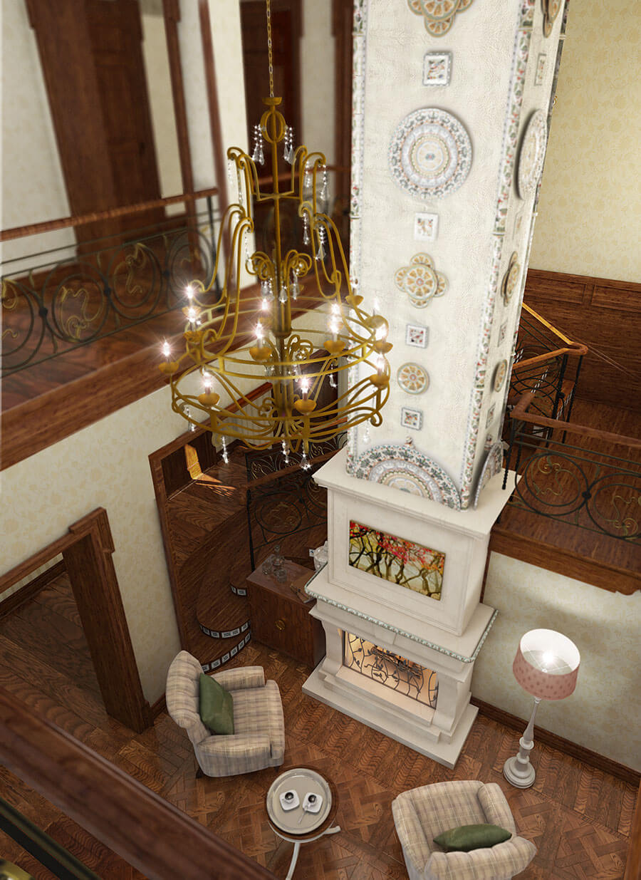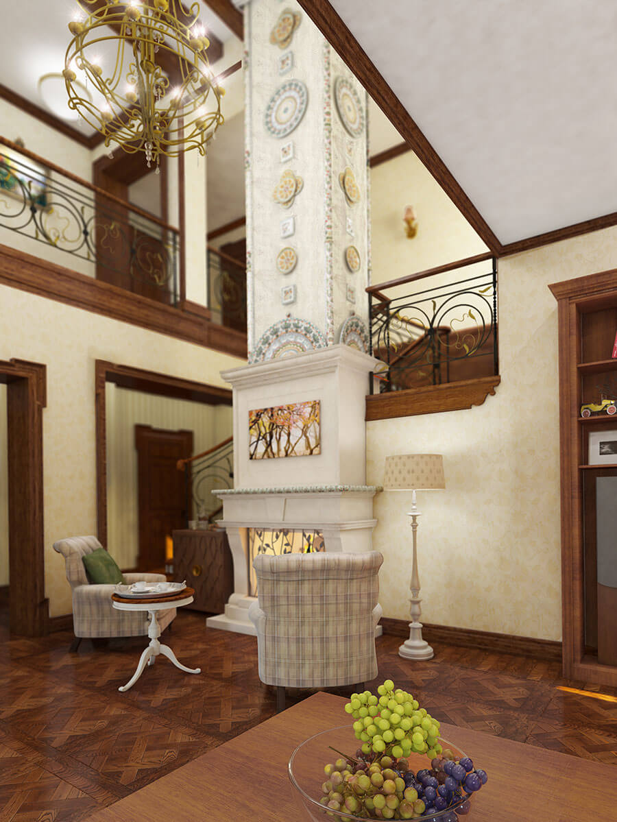 Камину в доме отведено особое место. Это сердце дома, он собирает всю семью вместе своим теплом и создает расслабляющую атмосферу. Камин находится в гостиной со вторым светом. Портал камина отделан травертином, топка — из огнеупорного кирпича, что придает камину натуральность, кованый экран камина выполнен по авторскому эскизу. Труба камина офомлена с помощью декоративной штукатурки с большим количеством разнообразных керамических изразцов ручной работы.