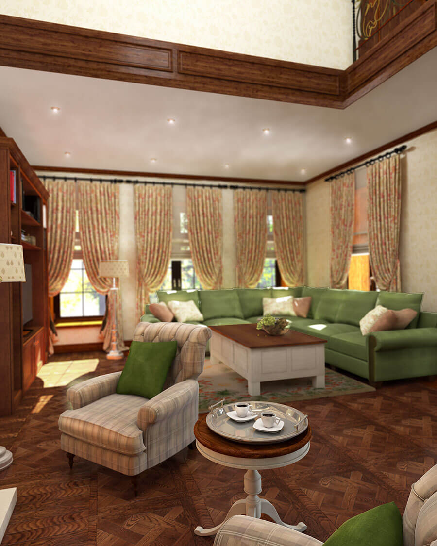 Любовь заказчиков к празднику Октоберфест — фольклорному фестивалю, который проходит в Баварии, в г. Мюнхене, вдохновляла автора этого проекта. Фасады дома выполнены с элементами фахверка. В интерьере много натуральных материалов, ковки, использован керамогранит с характерным тематическим рисунком, особое внимание уделено текстилю с принтами в клетку, полоску. В дизайне преобладают естественные, природные цвета и сочетания. При оформлении лестницы, камина и интерьера кухни были использованы изразцы.