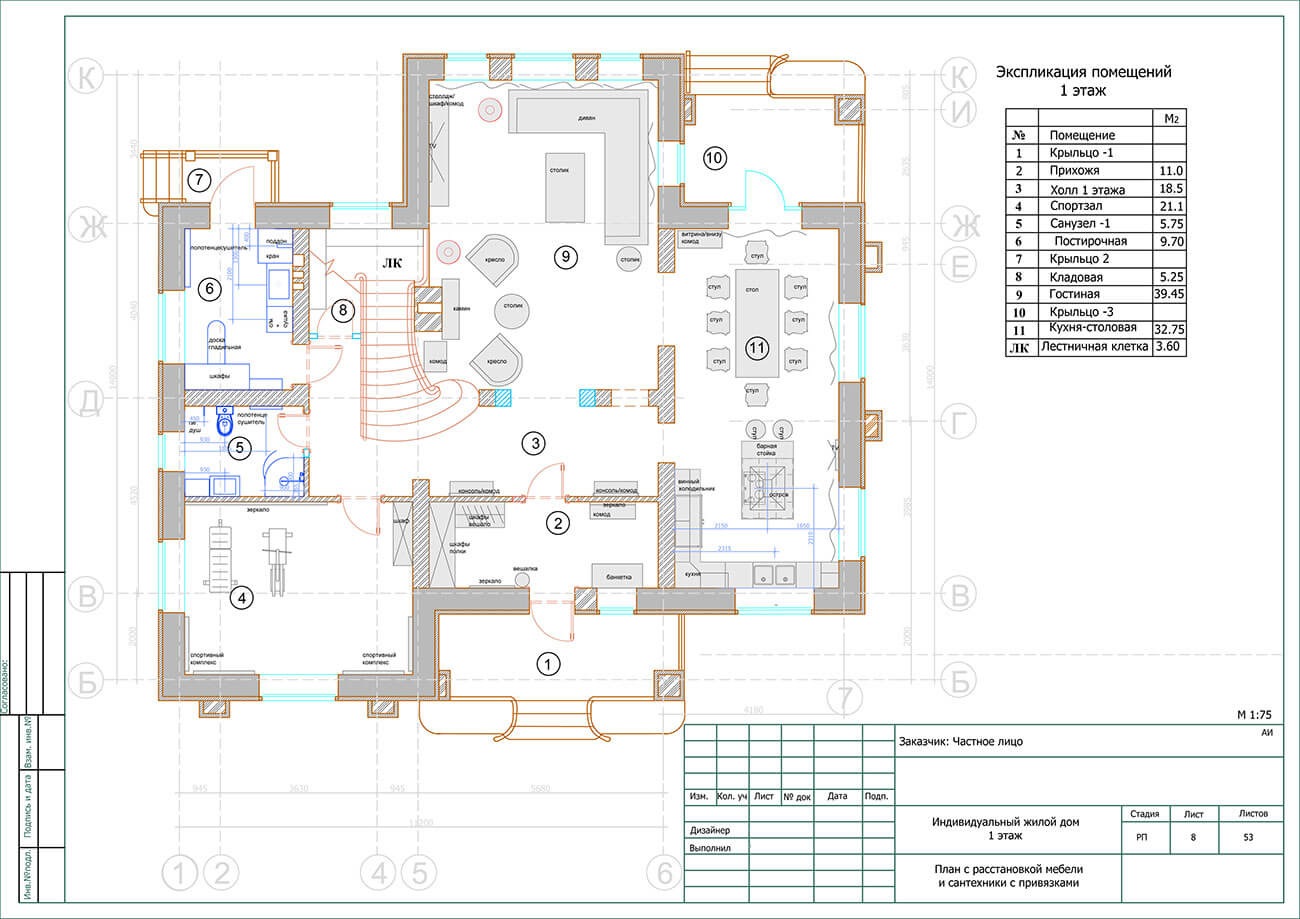На первом этаже также есть гостевой санузел, спортивный зал и постирочная. На втором — приватные помещения: спальня хозяев, ванная комната хозяев, две детские комнаты с санузлом, гостевая спальня и кабинет.
