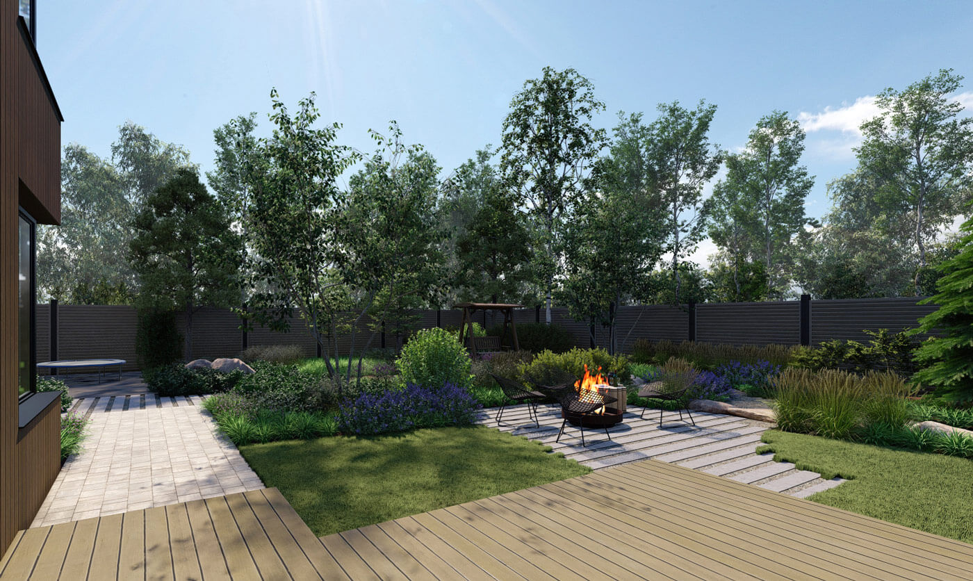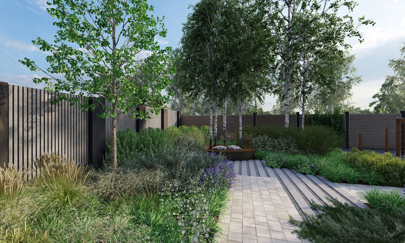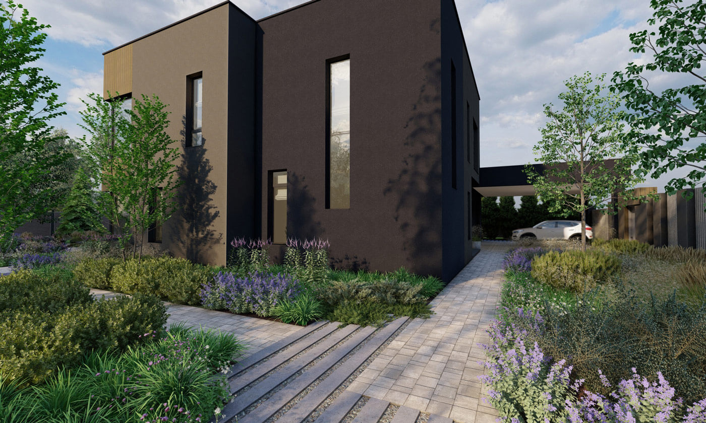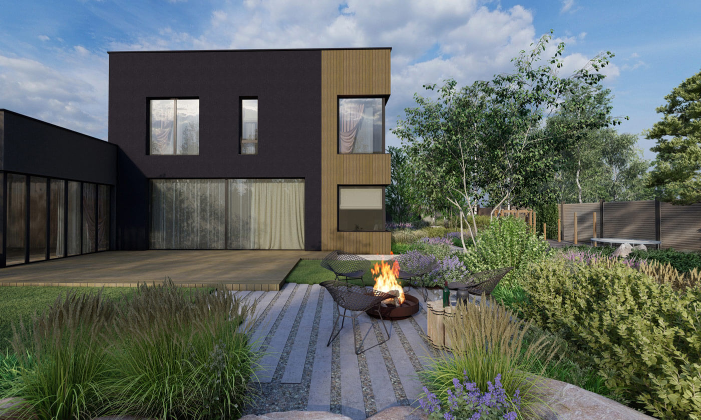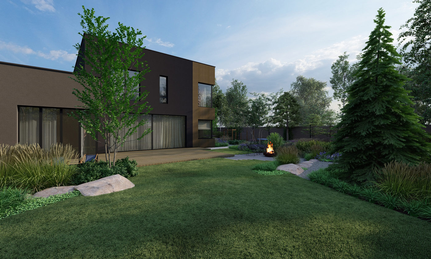 Было принято решение сделать природный сад, в котором натуралистические посадки создадут органичный контраст лаконичной архитектуре дома. Еще одним отсылом к природности сада служит использование крупного камня – это две гряды валунов, которые будут имитировать выход горной породы. В этих частях участка предусмотрен перепад рельефа.