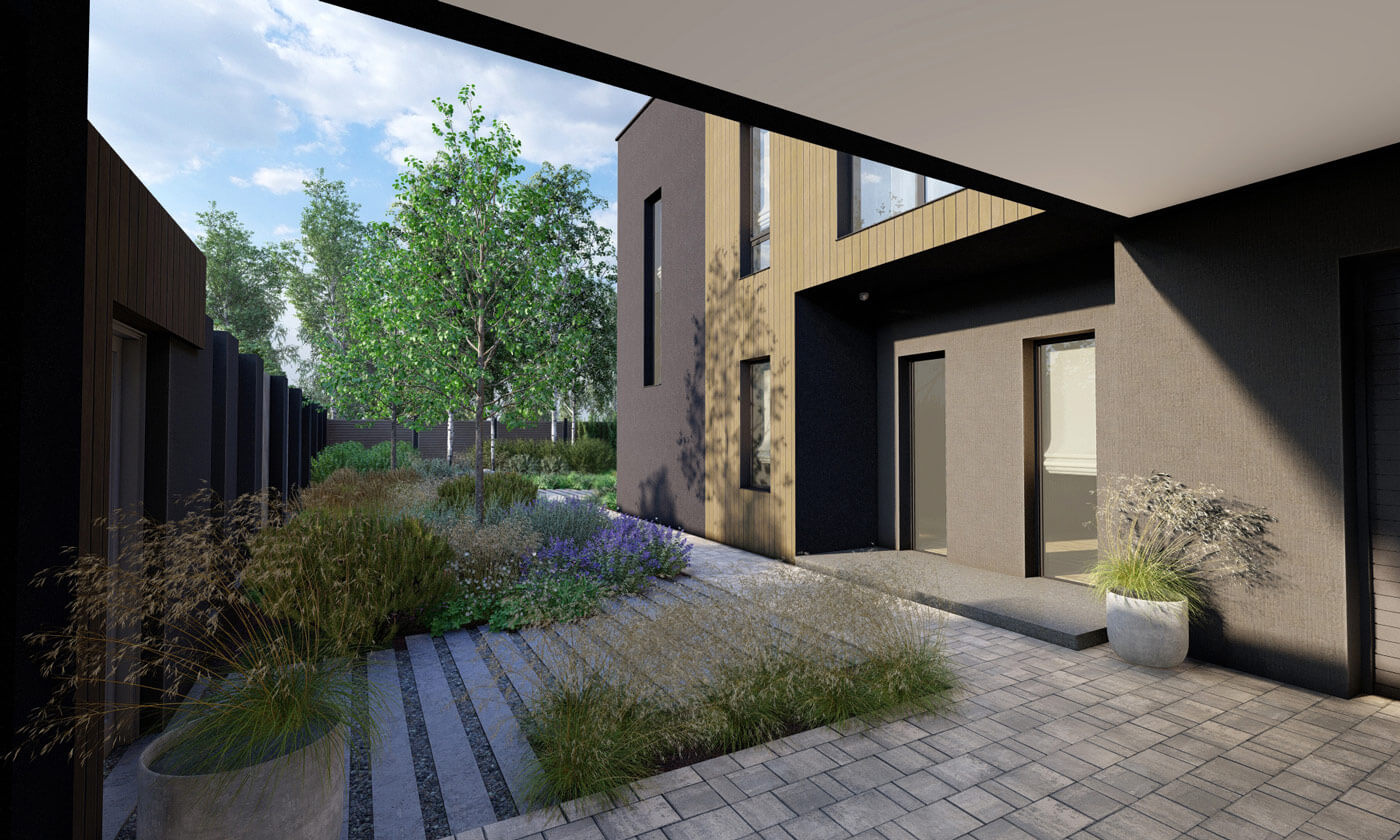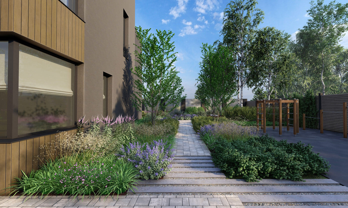 В проекте используются преимущественно природные материалы, камень, дерево, а также бетон. Для дорожек заложено несколько видов мощения – два вида бетонной брусчатки, доска из лиственницы и отсыпка гранитом.