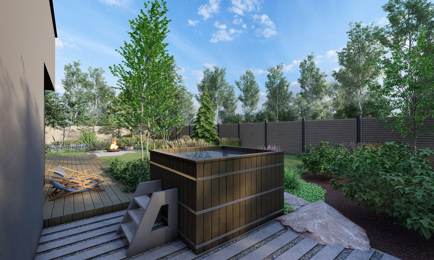 Задачи: создать функциональное, отвечающее нуждам владельцев пространство, не нарушая вид из окон. Из наполнения: детская/спортивная площадка, костровая зона, купель фурако, место для тандыра, небольшой плодовый сад.