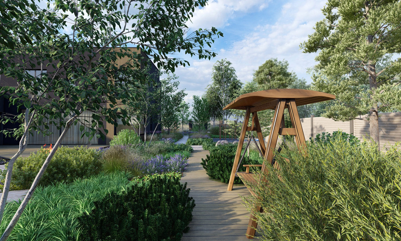 Прогулочных маршрутов по участку не предусмотрено, исключение - дорожка, ведущая к калитке в лес – он и будет местом для прогулок и единения с природой в ее первозданном виде. На пути к калитке расположилась небольшая зона отдыха с диваном-качелями.