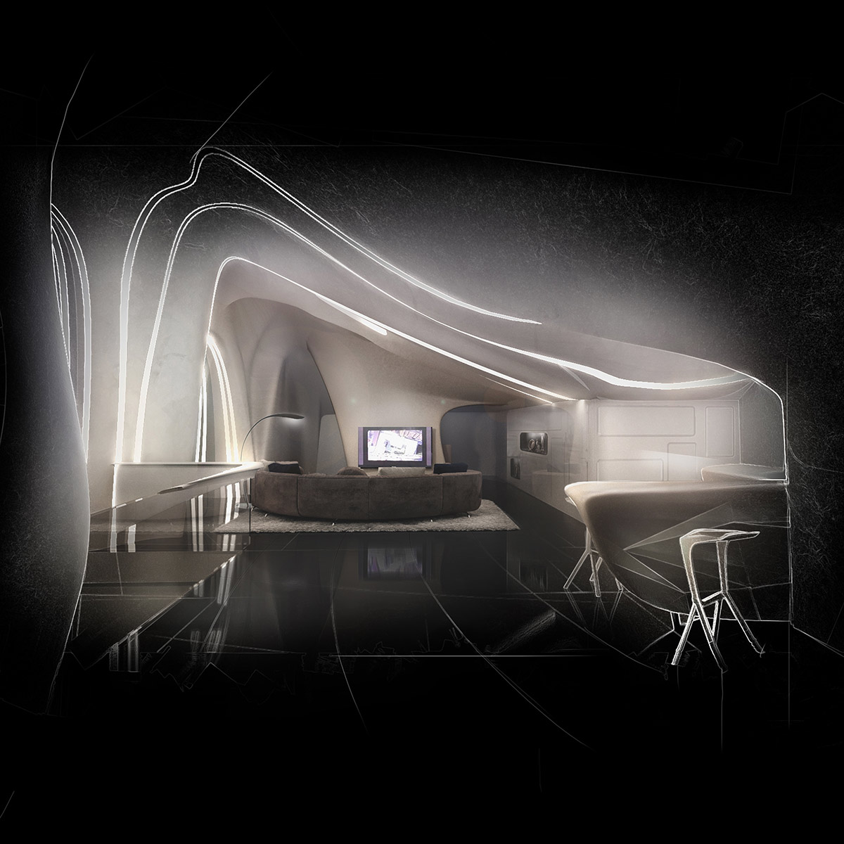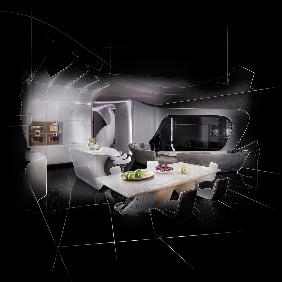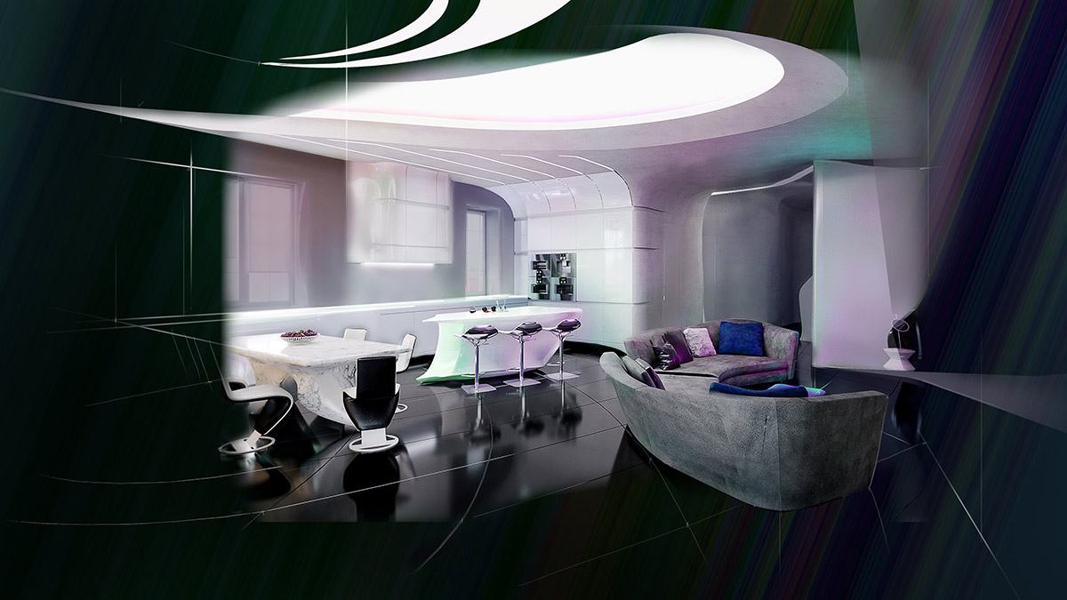 Этот интерьер выражает новейшую концепцию современного футуристического стиля, обладает безукоризненным чувством меры и убедительно презентует стиль жизни владельцев.