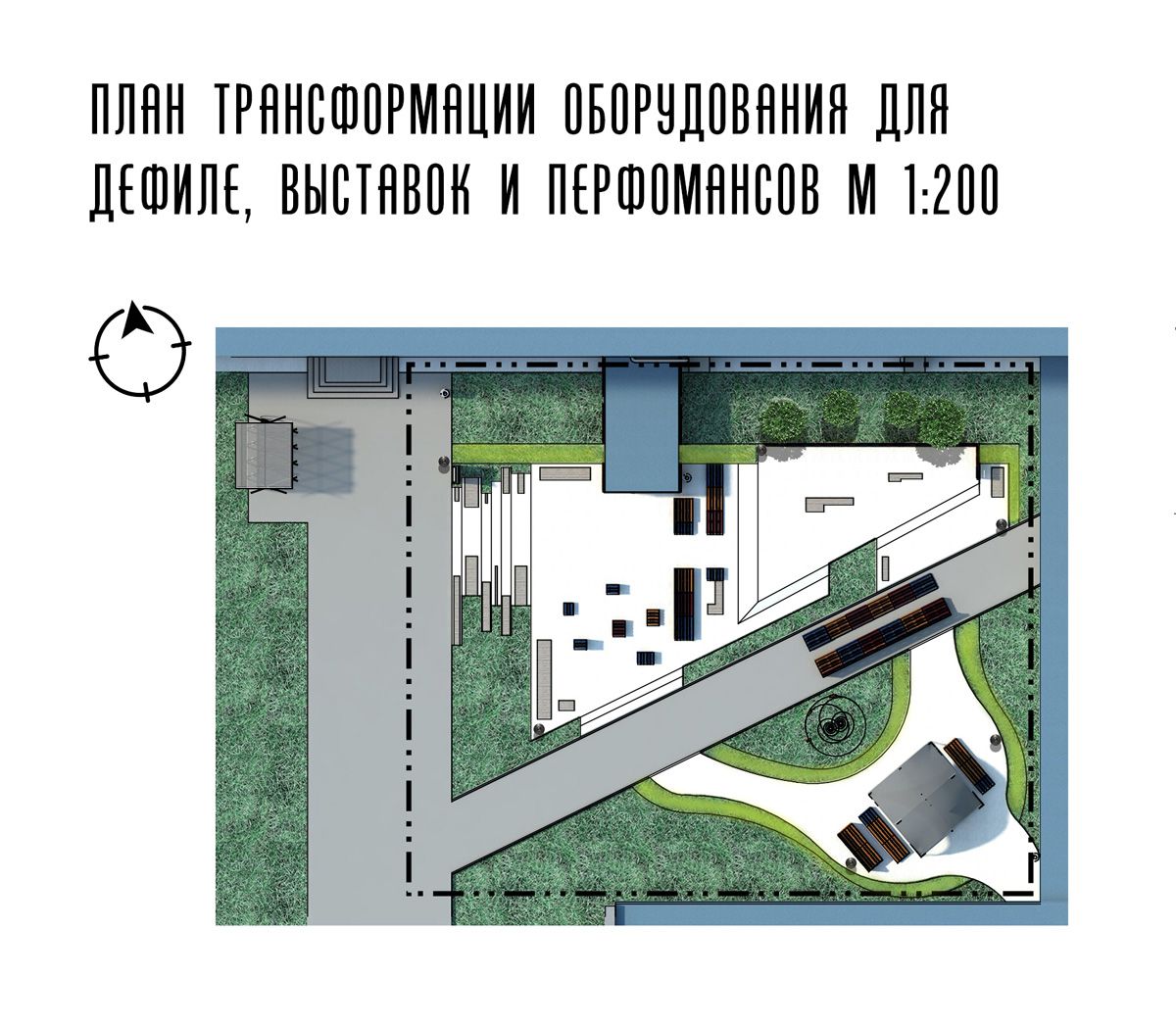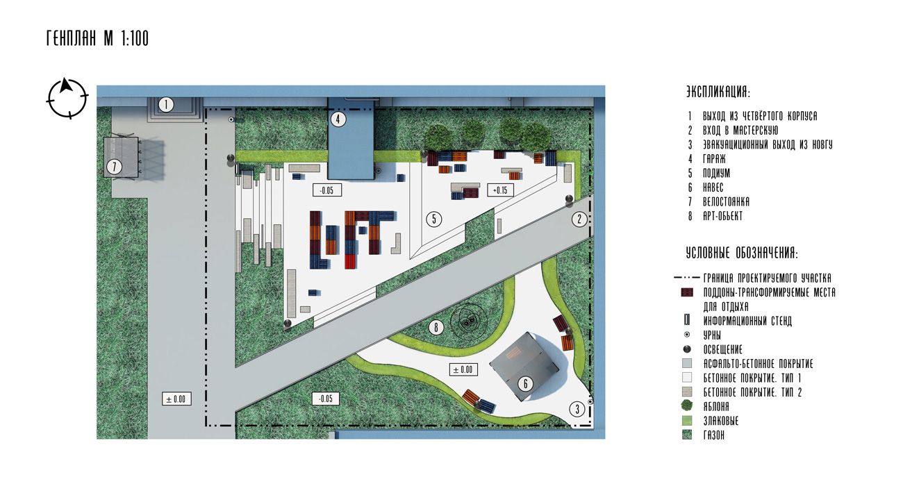 Чтобы подчеркнуть, что ландшафтная организация выполнена для определенного места, на генплане видно, что составленные в центре поддоны образуют силуэт трех букв: И П Т, что дословно означает «Институт политехнический».