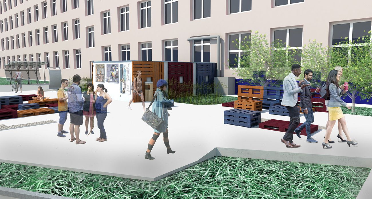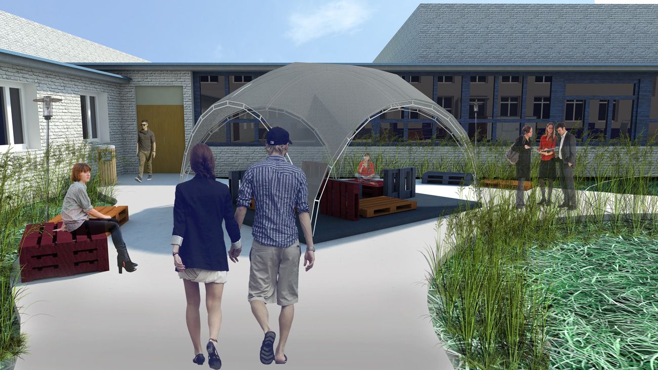 Функционально двор выступает как место отдыха — студенты могут его посещать во время перерывов, перекусывать здесь. Основные используемые элементы — поддоны, которые не закреплены, поэтому пространство трансформируется за счет этого и разнообразия их габаритов и позволяет проводить дефиле и перфомансы; выделено место для подиума; навес позволяет укрыться от дождя. Подиум необходим, так как в университете часто проводят выставки.