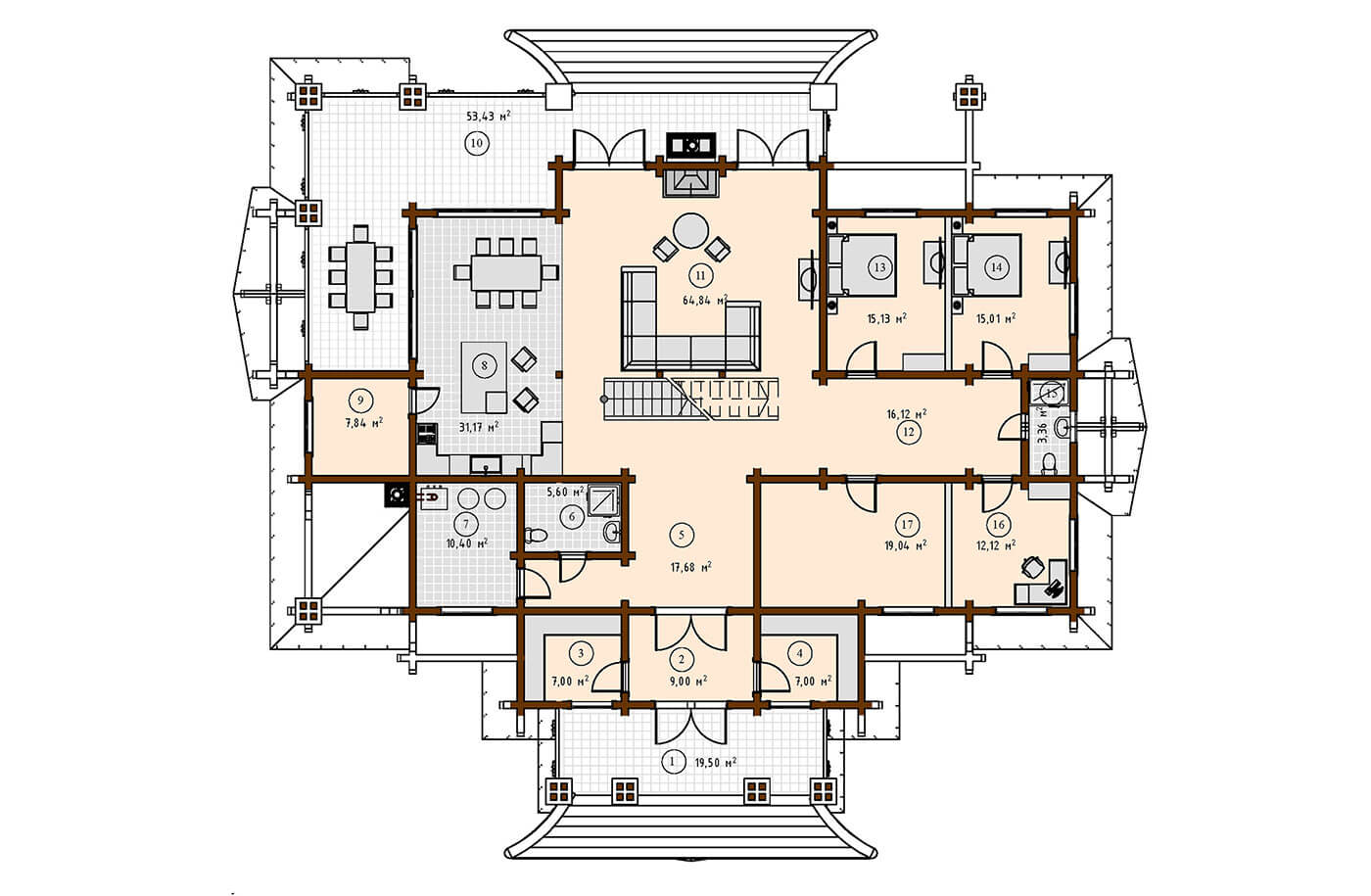 Терраса выходит за пределы периметра дома, за счет этого увеличивается полезная площадь.
