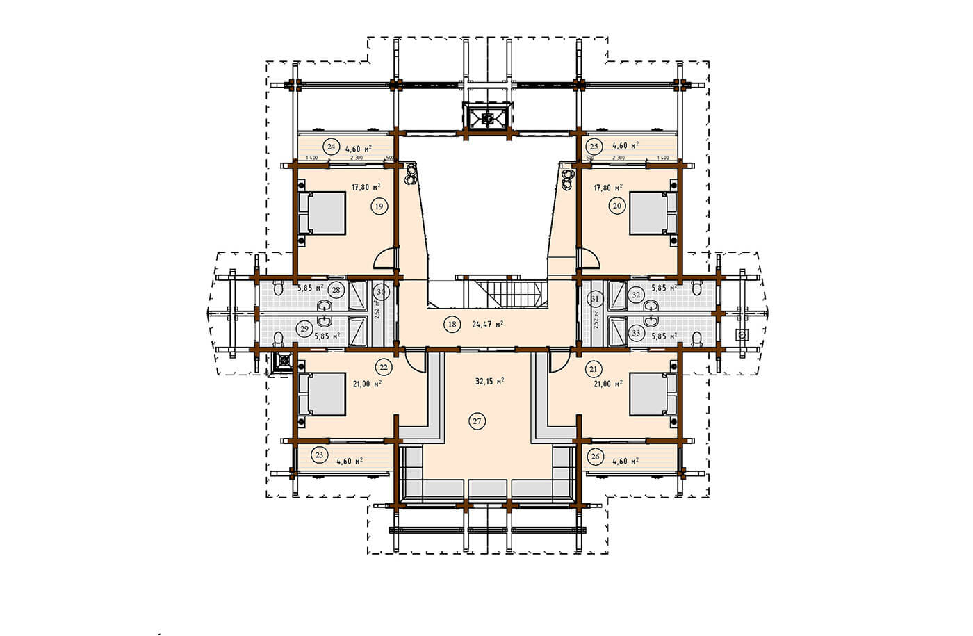 Балконы в мансардном этаже и массивные конструктивные перевязки со столбами на монолитных опорах.