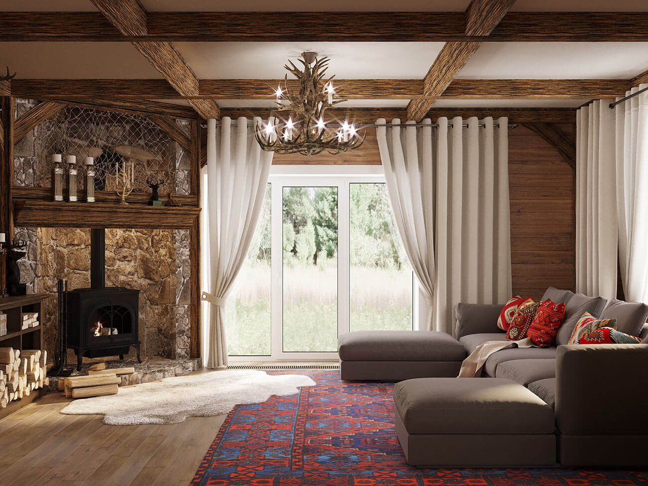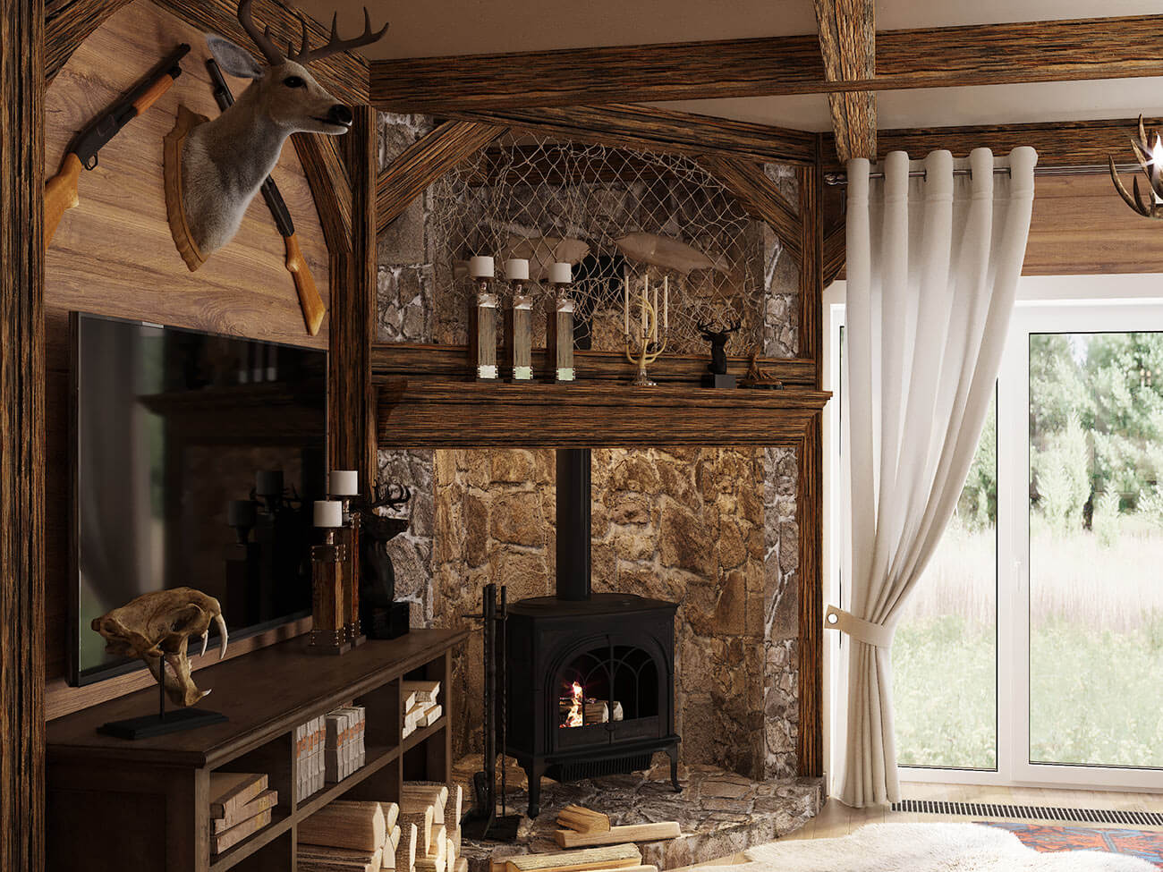 Заказчиком является мужчина, основное увлечение которого — рыбалка и охота, это, а также расположение дома в окружении природы поспособствовало остановиться на рустикальном стиле интерьера. Природная красота, выраженная в натуральных материалах, естественных текстурах, древесных оттенках присутствует во всех помещениях дома, использована как при строительстве, так и в декоре. Деревянные полы благодаря своей простоте и массивности создают основу для характерного стиля, настоящие деревянные балки с сучками и трещинами, дерево в облицовке стен, натуральный камень, грубая штукатурка, мебель и двери грубой обработки, натуральные ткани (лен, хлопок, шерсть), шкуры — все это несет особую энергетику и подчеркивает увлечения и натуру хозяина дома.
