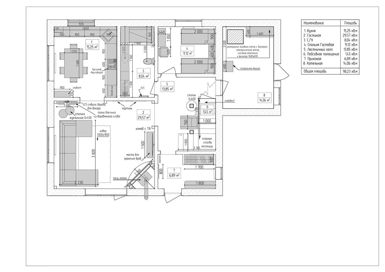 • гостиную — 29,57 кв.м — с большим диваном, печью-камином в качестве главной фокусной точки; из гостиной предусмотреть выход на террасу;