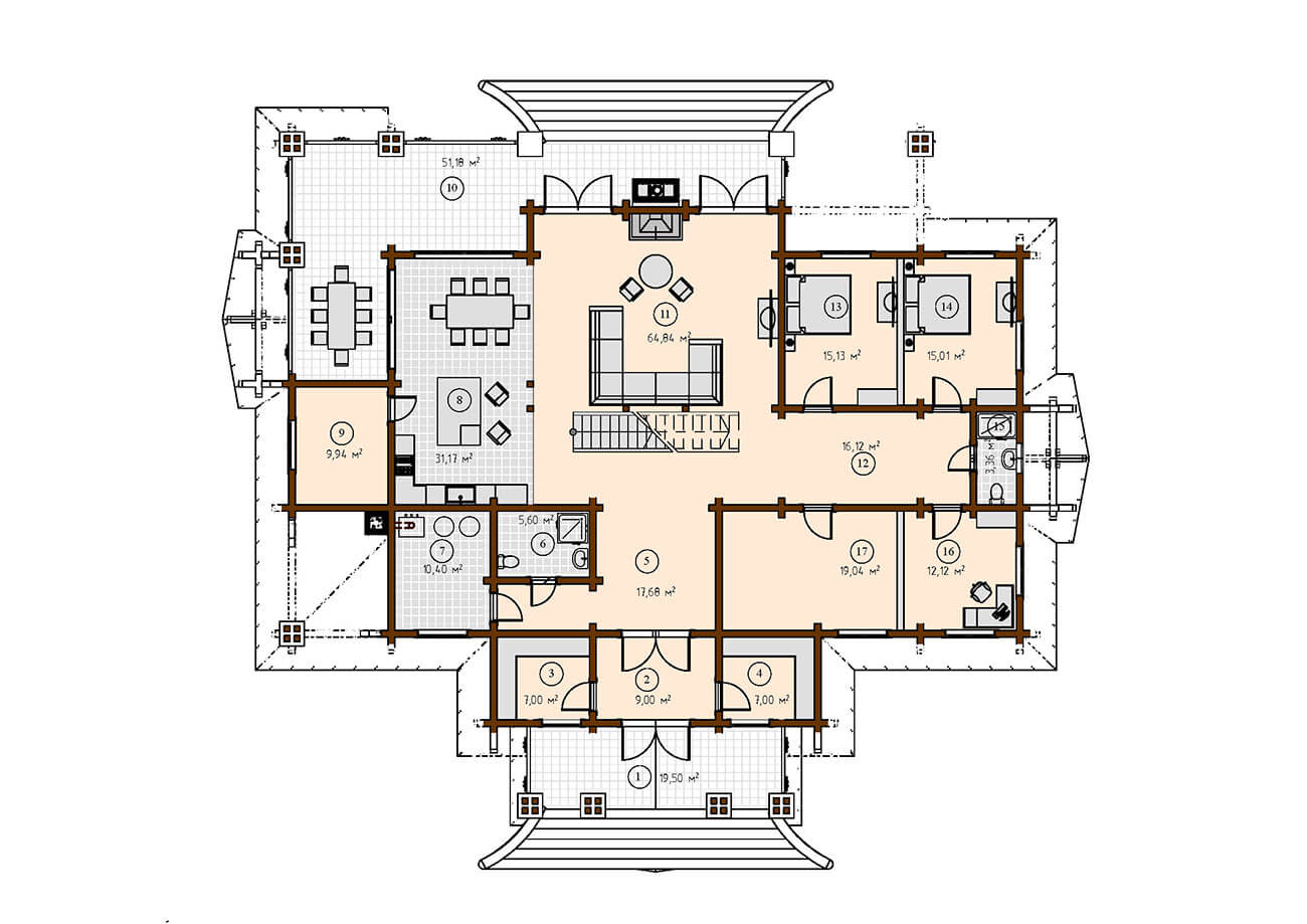 Терраса выходит за пределы периметра дома, за счет этого увеличивается полезная площадь.