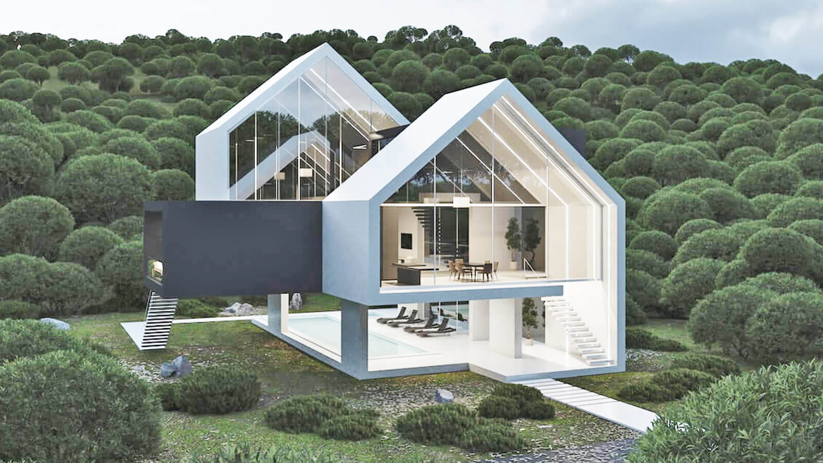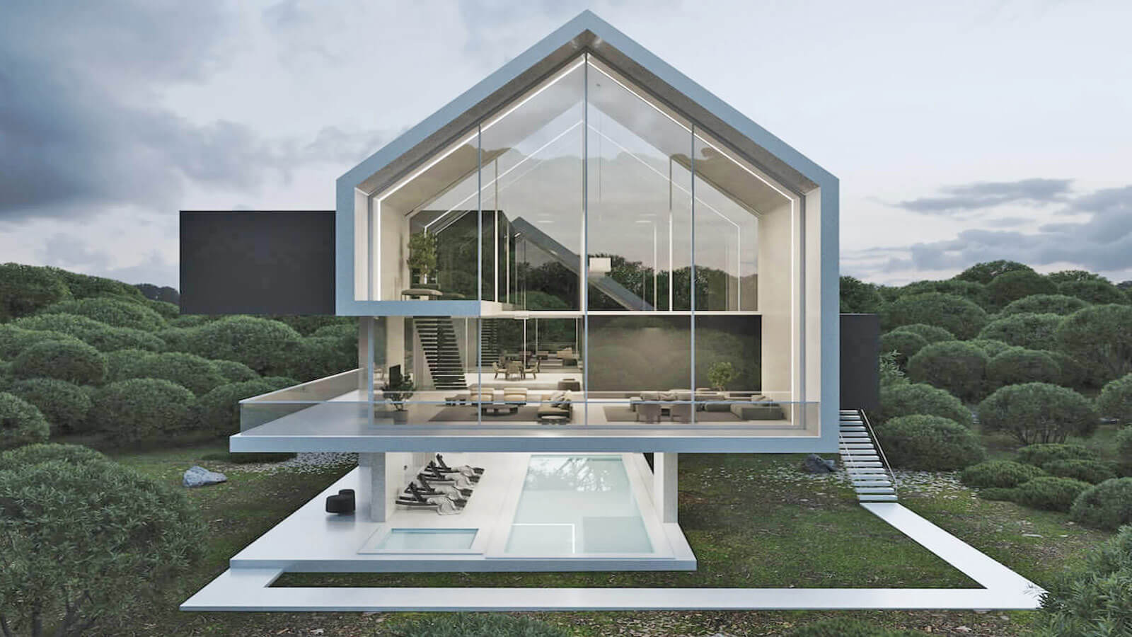 На северной стороне проекта находятся гостиная и телевизионная комната. В южной части проекта находятся кухня и приемная. На первом этаже находятся бассейн и парковка.