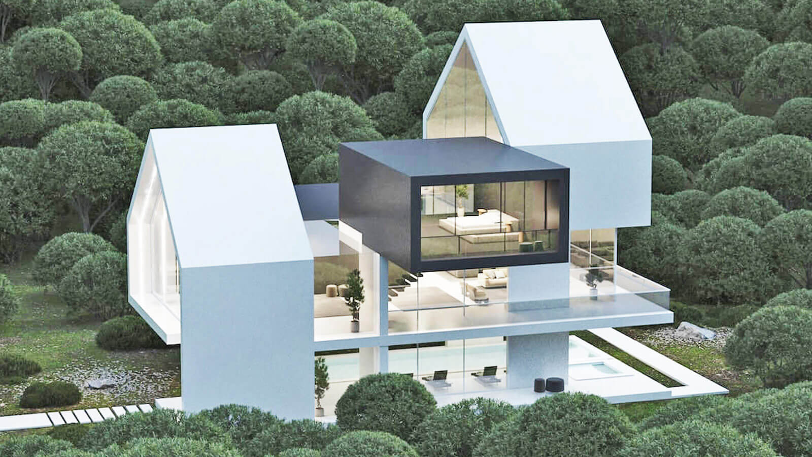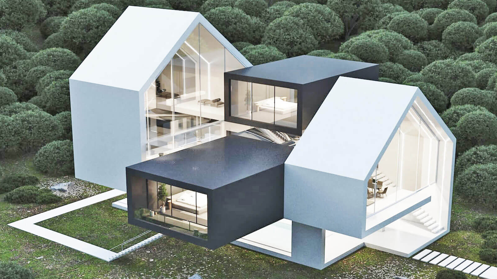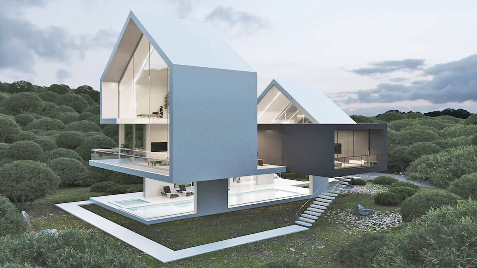 Проект «Две сестры» расположен на земельном участке площадью 500 метров. Процесс проектирования: сначала мы разделили коробку от центра, чтобы создать наклонную крышу, далее разрезали ее в центре коробки, используя две линии, чтобы создать проем в центре.