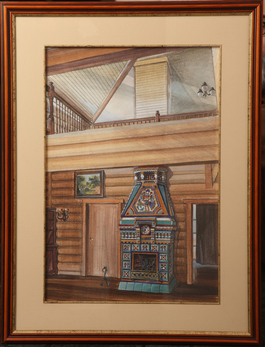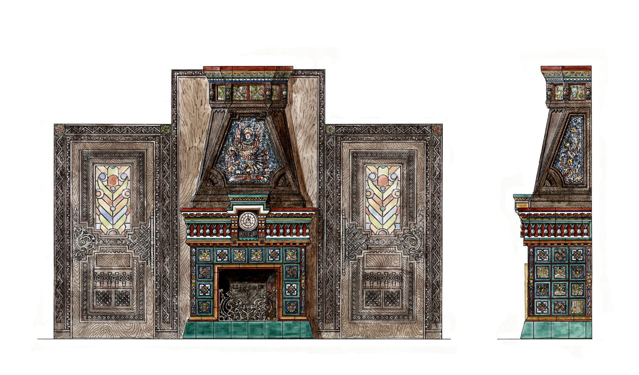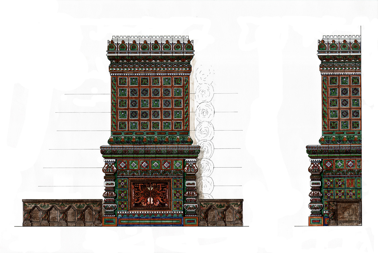 Проект большого изразцового камина сделан на основе литографий с изображением эскизов изразцовой печи в сборнике «Мотивы русской архитектуры» изд. А. Рейнбота, СПб, 1874 г.