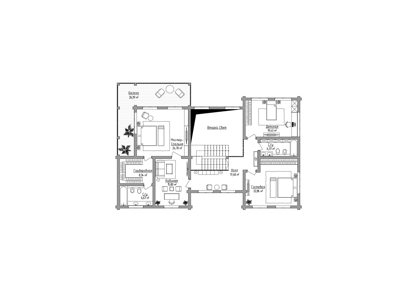 Второй этаж размещает три спальни, санузел, где можно уместить большую ванну и балкон с панорамным видом на участок.
