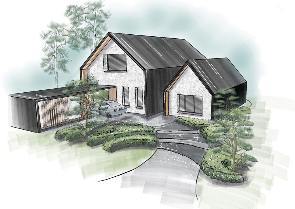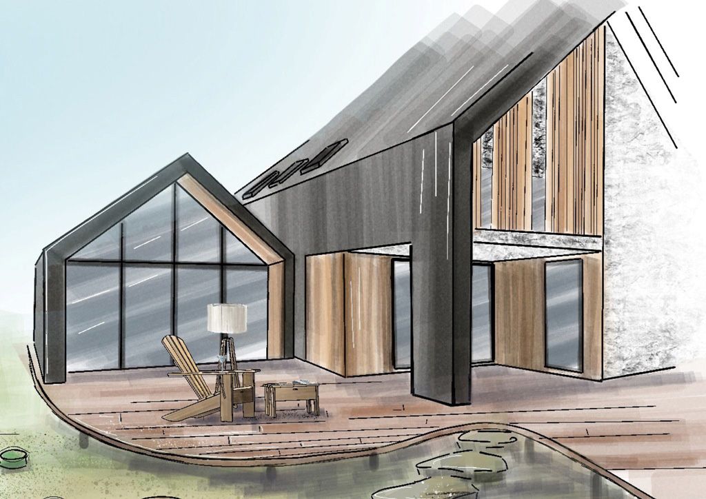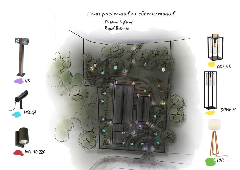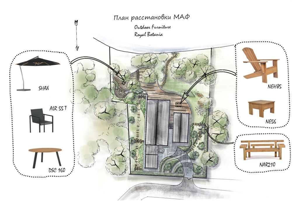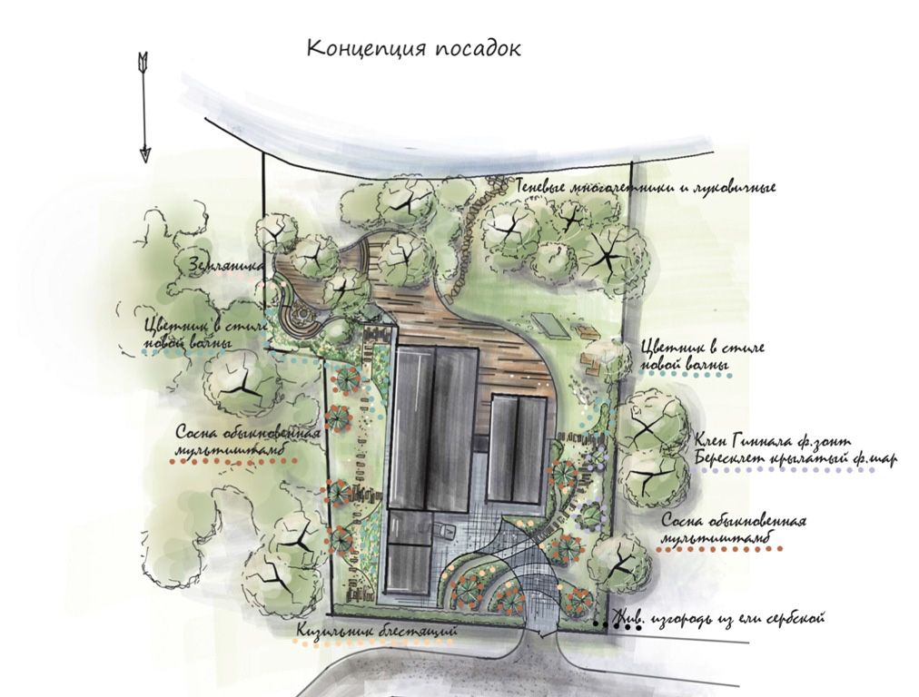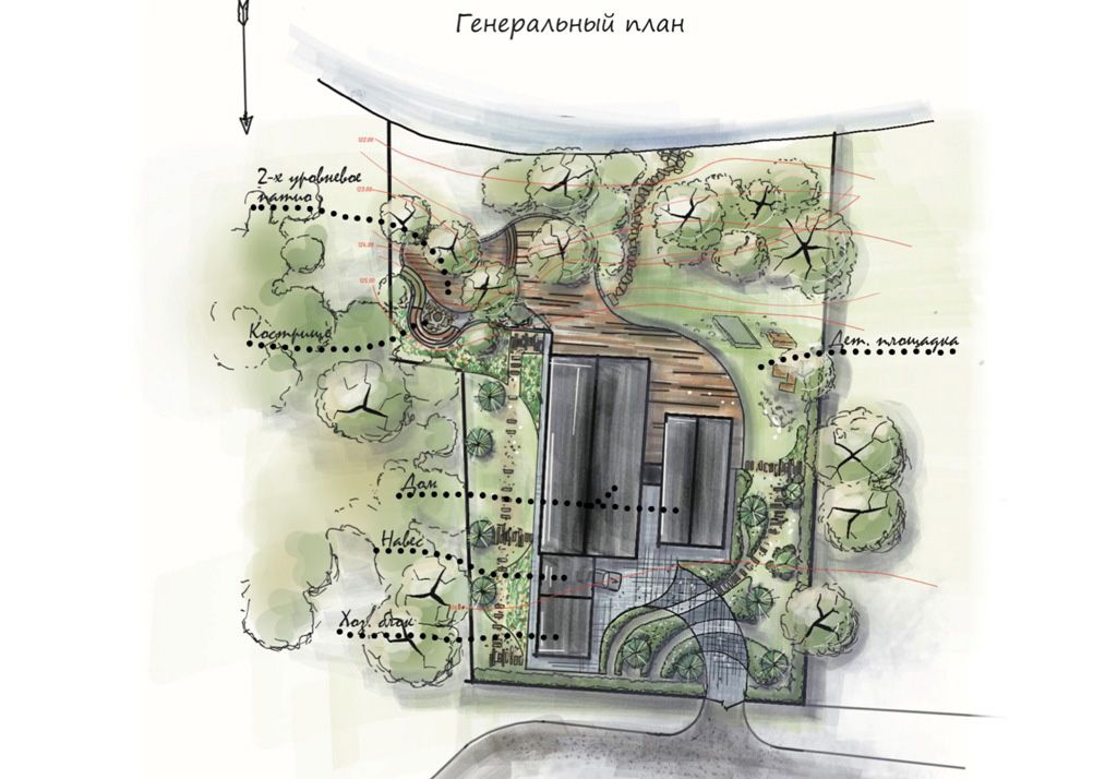 Цель: экологично вписаться в существующий ландшафт с максимальным сохранением растительности, предусмотреть возможность использования склона. Организовать въездную парадную зону, место отдыха для большой компании взрослых и игр детей.