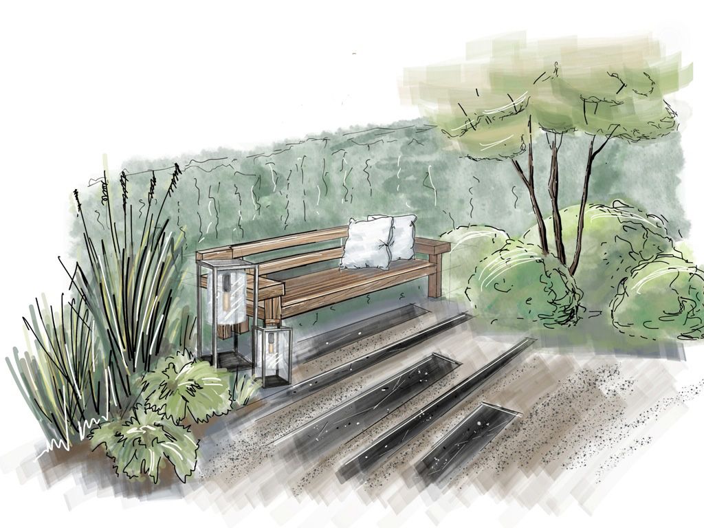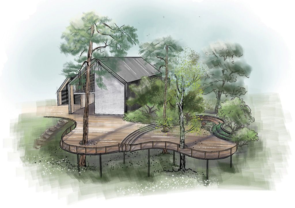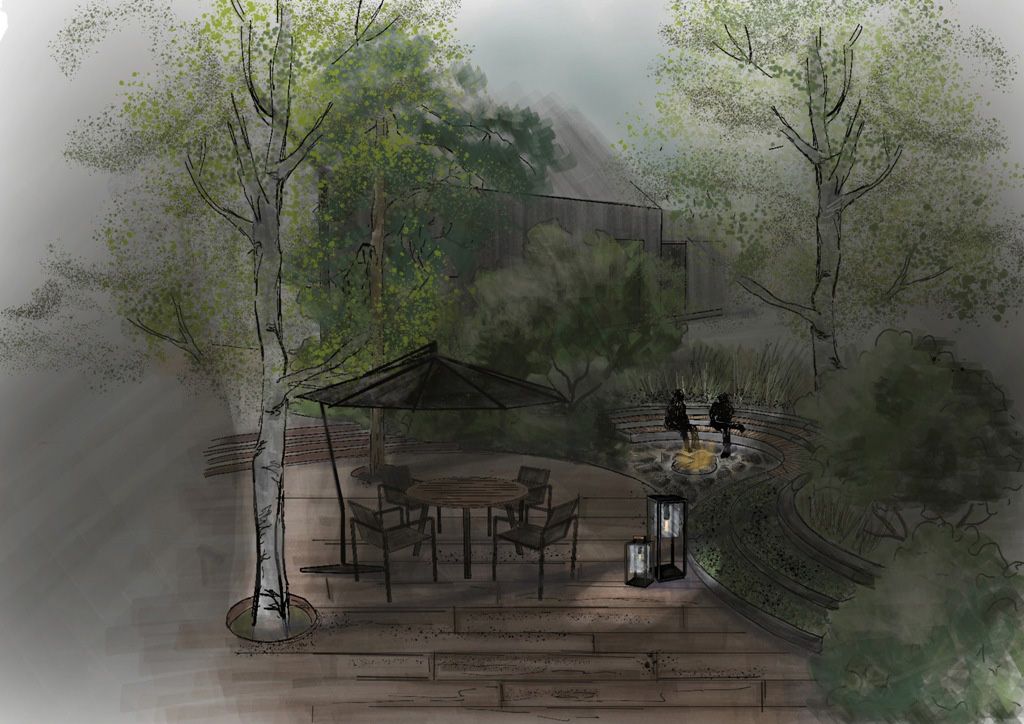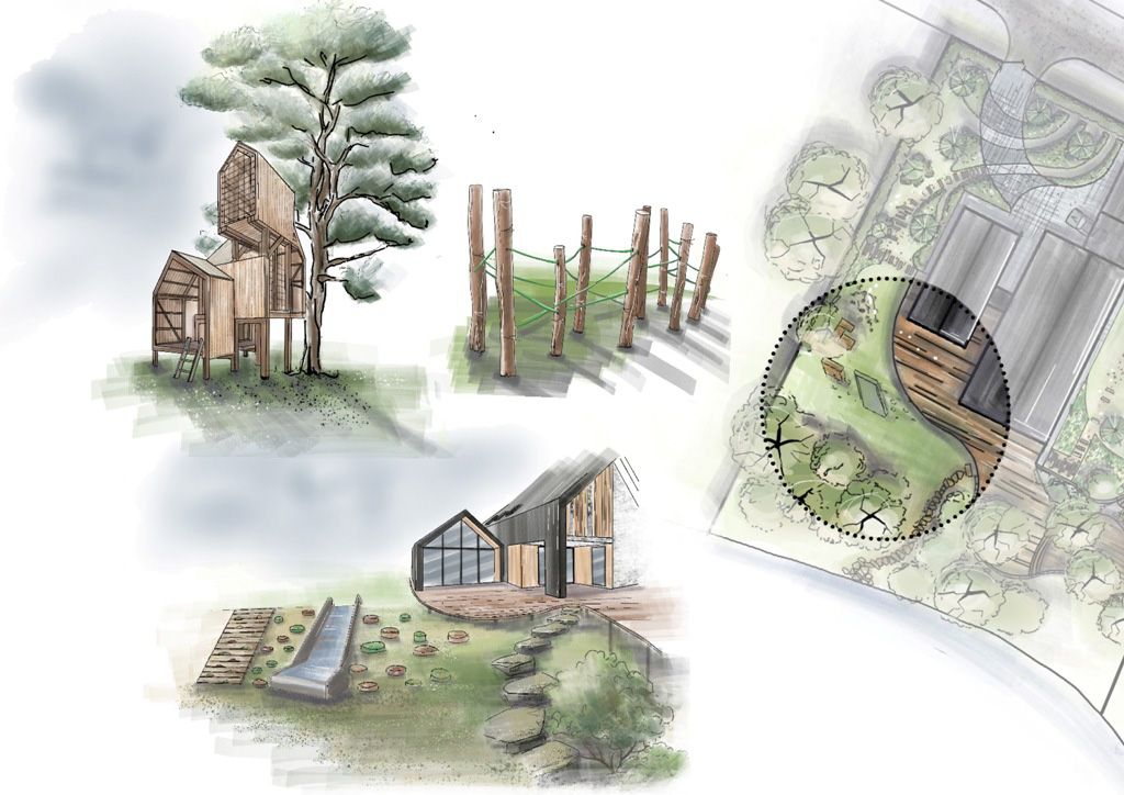 Для сохранения рельефа и возможности использования склона спроектирован двухуровневый настил из лиственницы, начинающийся от террасы дома и проникающий в лес. В местах перепада рельефа запроектировано кострище. Места для сидения спускаются уступами по существующей высоте в виде амфитеатра и в длину продолжаются грядами под землянику. Также на склоне запроектирована игровая зона с горкой и скалодромом. В целом площадка для детей имеет природный характер.