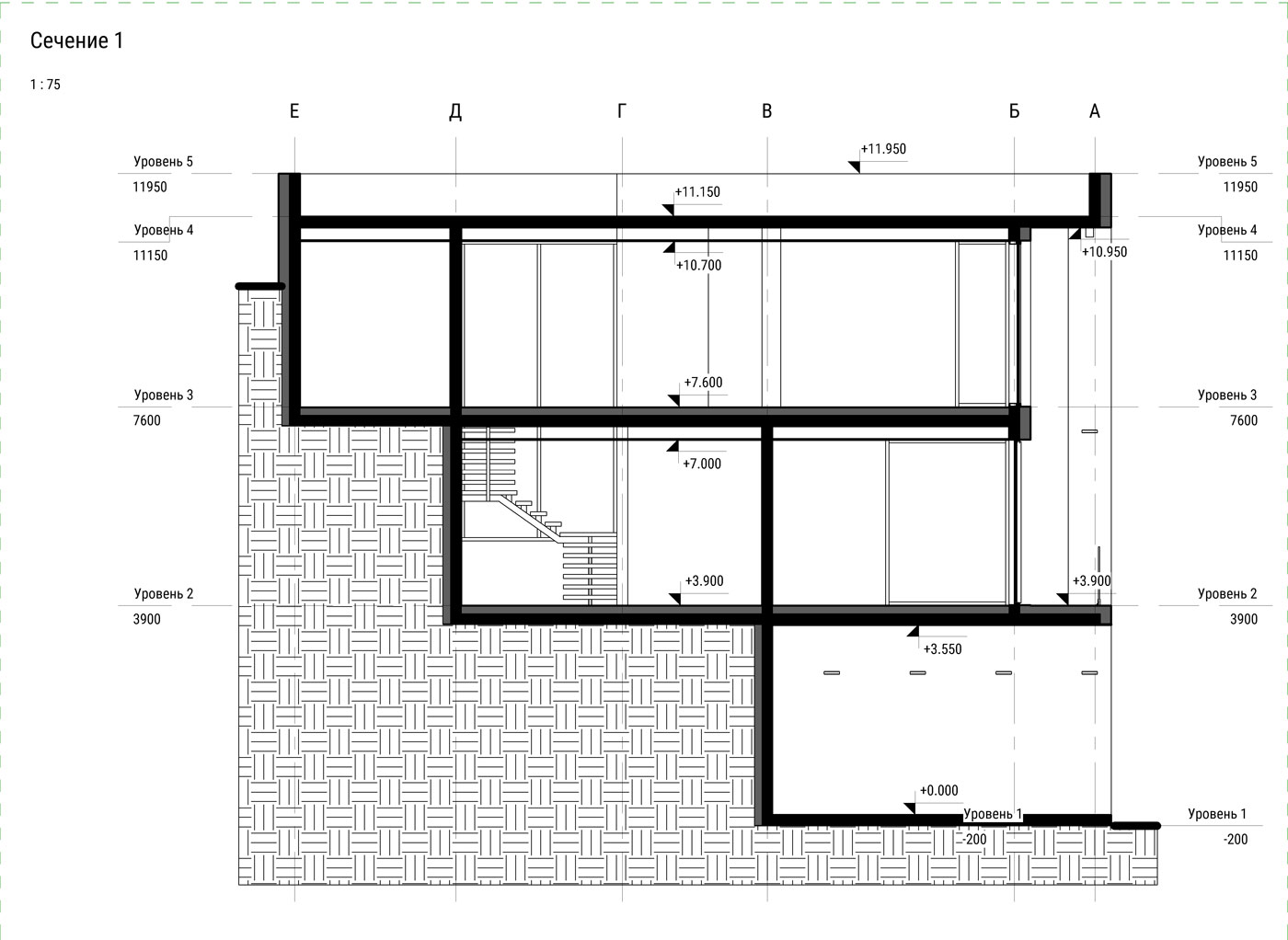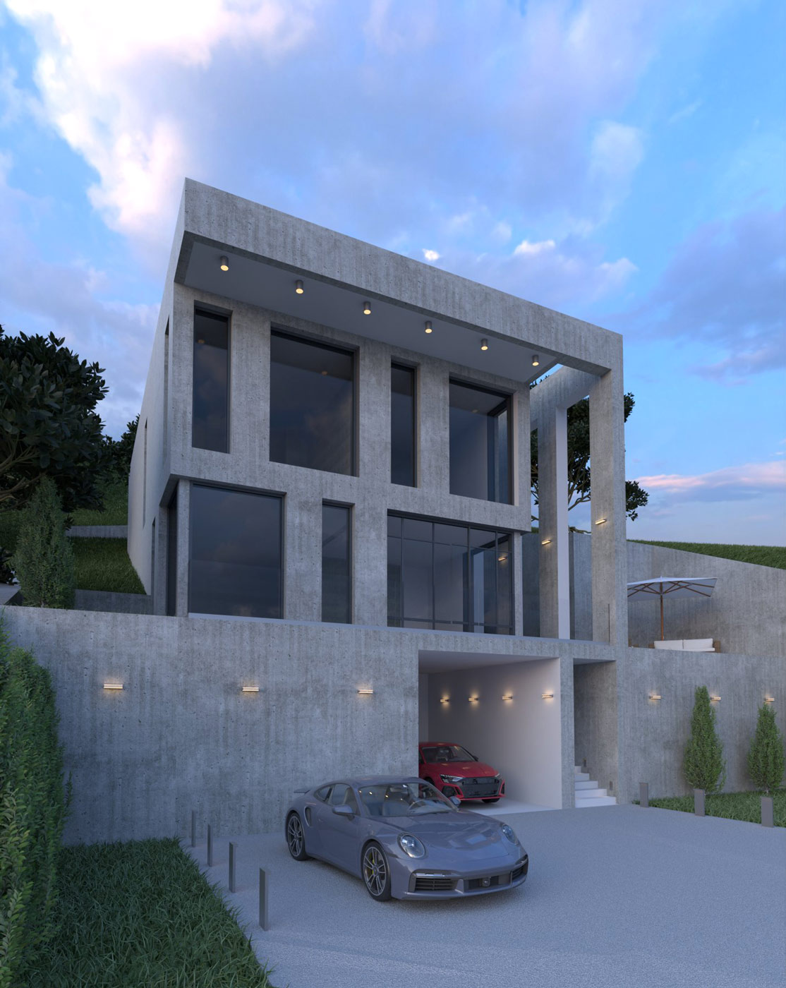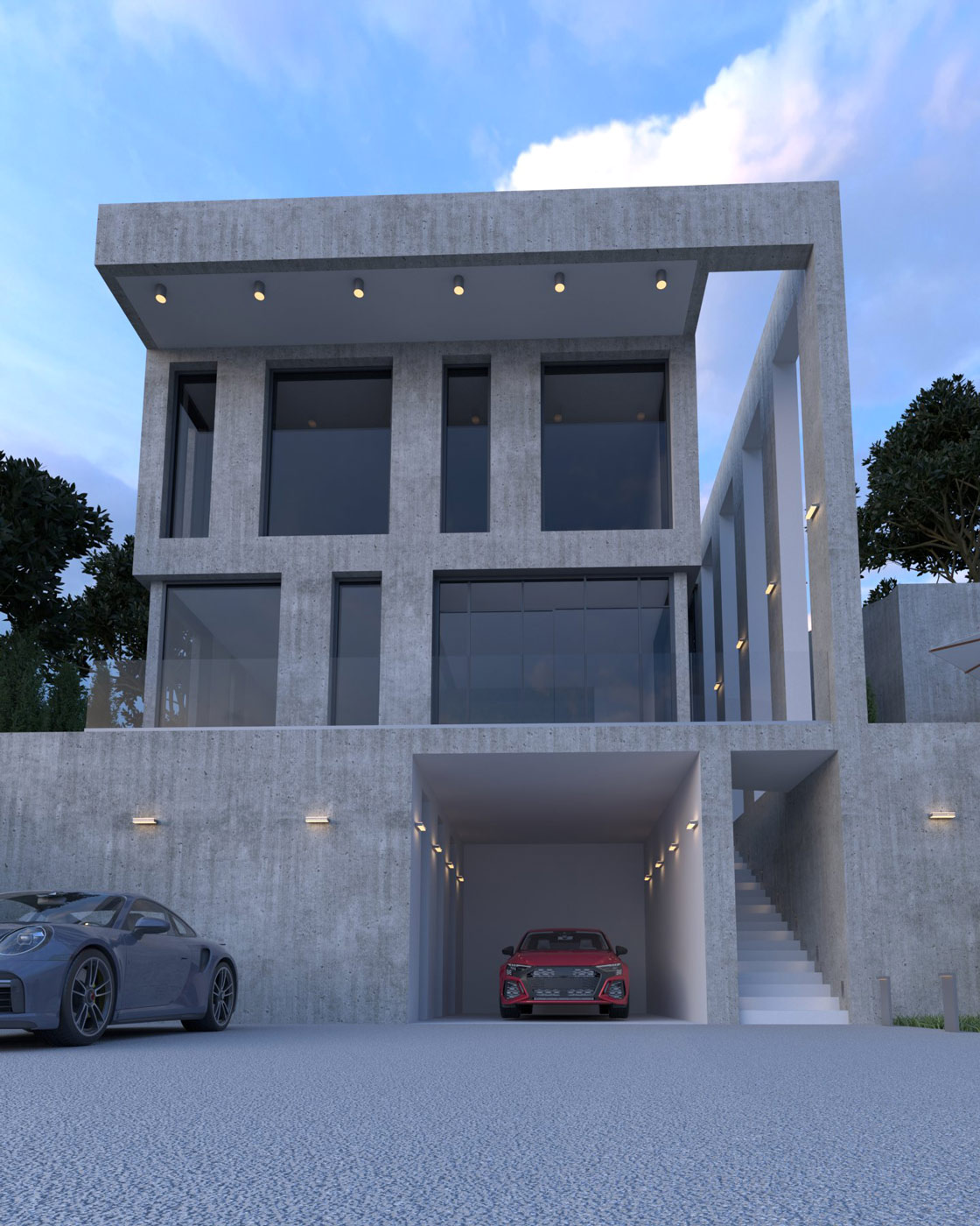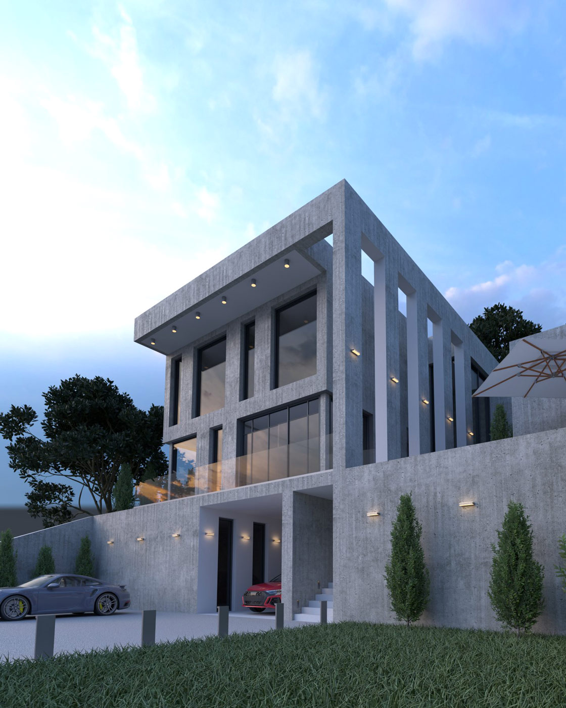 Идея: придать устойчивости и монолитности зданию за счет бетона в экстерьере и придать природную аналогию утесу на крутых берегах. Максимальное проникновение света через панорамное остекление придает комфорт и уют даже в пасмурную погоду. А система «умный дом» с автоматическим регулированием шторне позволит прогревать помещения в моменты максимальной инсоляции.