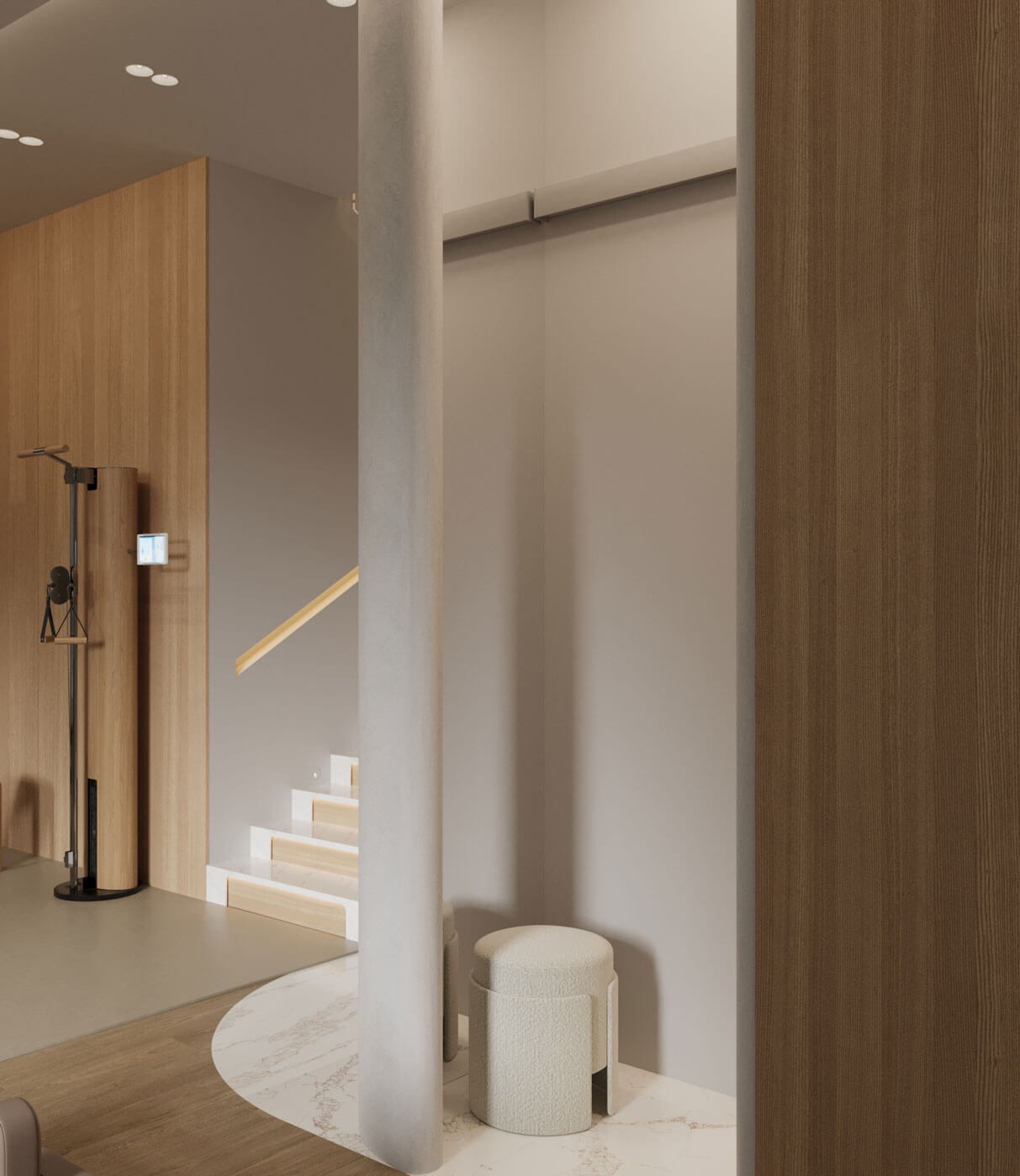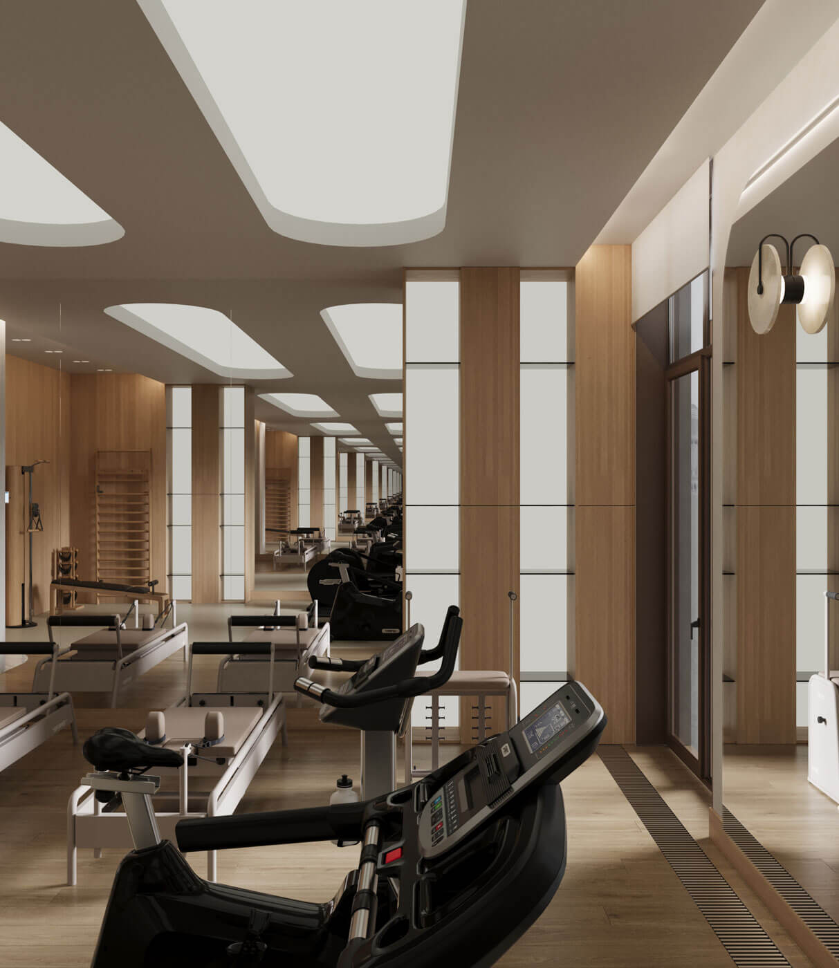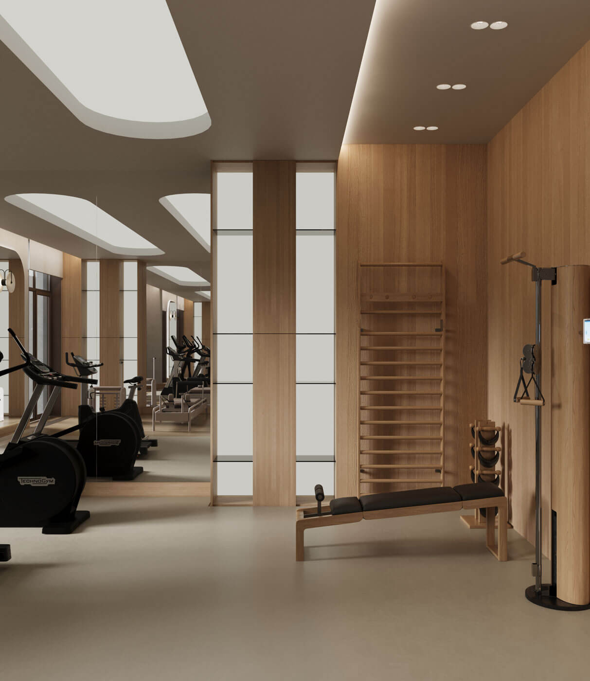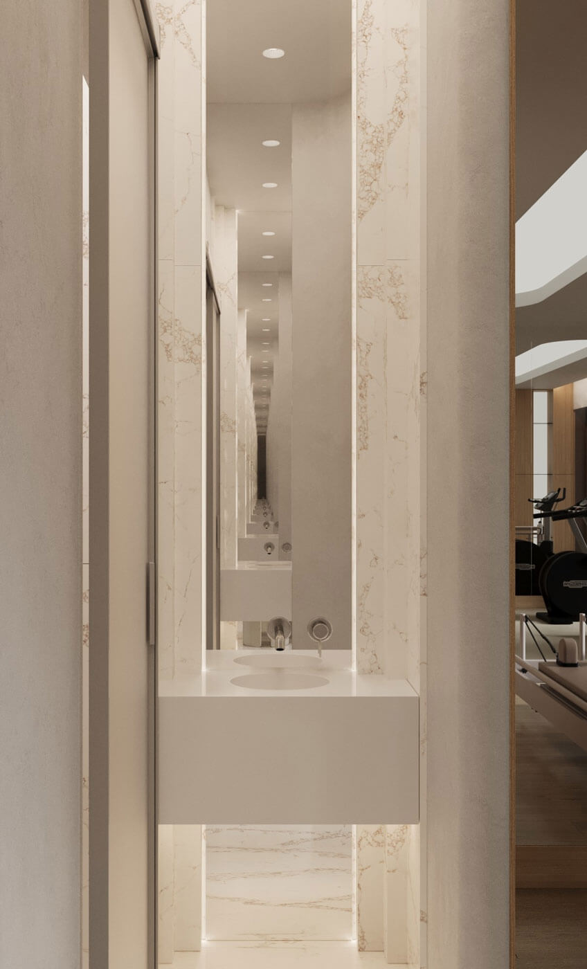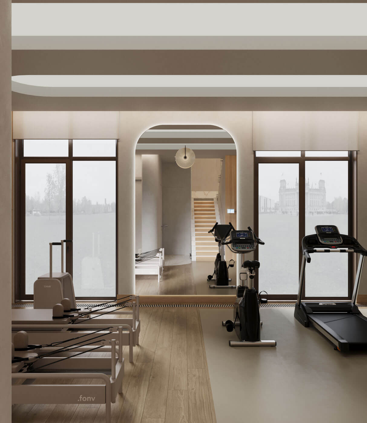 Основное пространство разделено на две части: зона для силовых тренировок и зона для занятий пилатесом. Зонирование зала также отражается в напольном покрытии: резиновое покрытие сочетается со спортивным паркетом и камнем. Небольшая площадь зала компенсируется светлыми тонами в отделке, единой выкладкой камня, окнами в пол и зеркалами, которые визуально расширяют пространство. Монолитная выкладка камнем пола объединяет все вспомогательные помещения, такие как зона раковины, с/у, душевая и коридор в зону массажной, а стеновые панели из шпона наполняют объект теплом. Радиусные элементы в отделки стен, архитектурных элементов, мебели, предметов сантехнического оборудования и освещения образуют единую концепцию.
