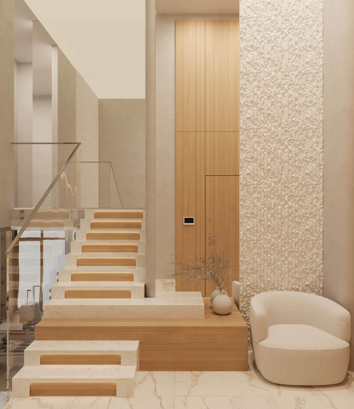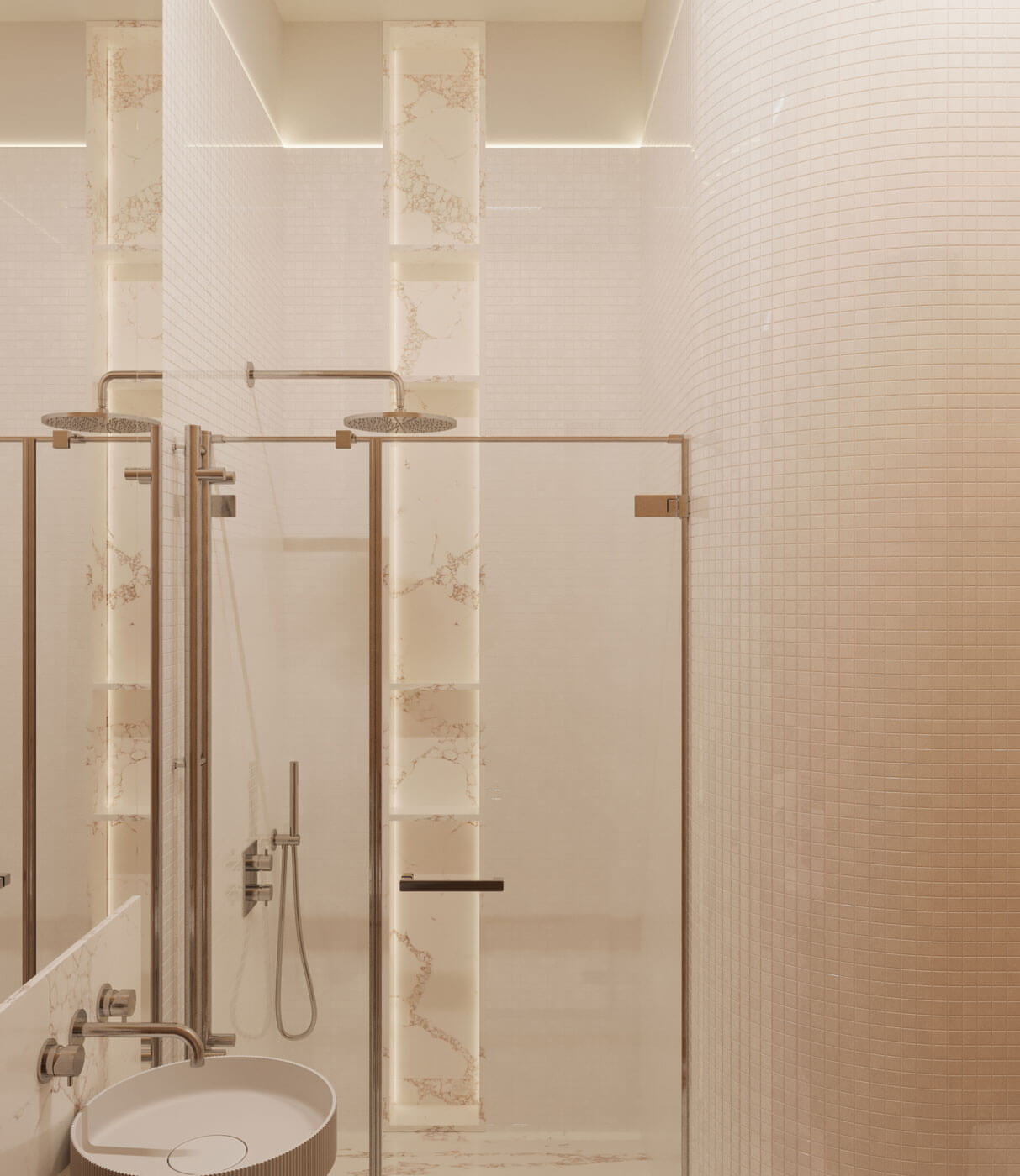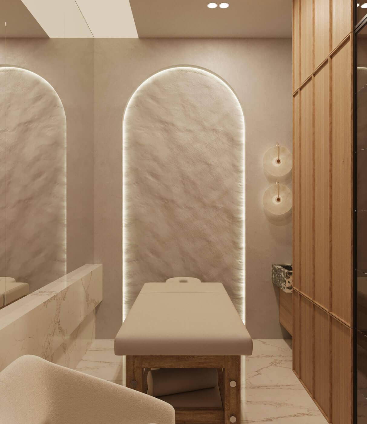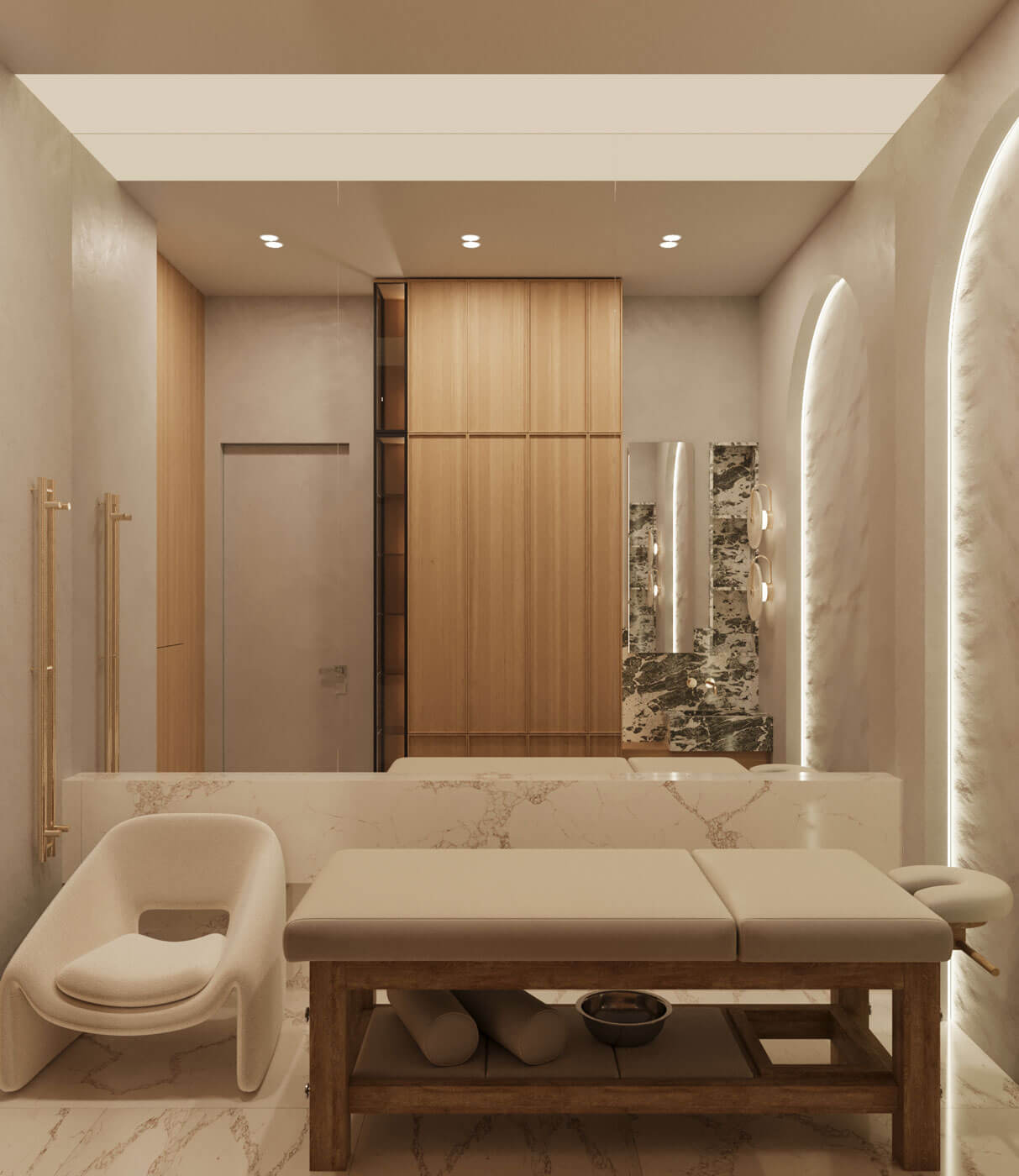 Основное пространство разделено на две части: зона для силовых тренировок и зона для занятий пилатесом. Зонирование зала также отражается в напольном покрытии: резиновое покрытие сочетается со спортивным паркетом и камнем. Небольшая площадь зала компенсируется светлыми тонами в отделке, единой выкладкой камня, окнами в пол и зеркалами, которые визуально расширяют пространство. Монолитная выкладка камнем пола объединяет все вспомогательные помещения, такие как зона раковины, с/у, душевая и коридор в зону массажной, а стеновые панели из шпона наполняют объект теплом. Радиусные элементы в отделки стен, архитектурных элементов, мебели, предметов сантехнического оборудования и освещения образуют единую концепцию.