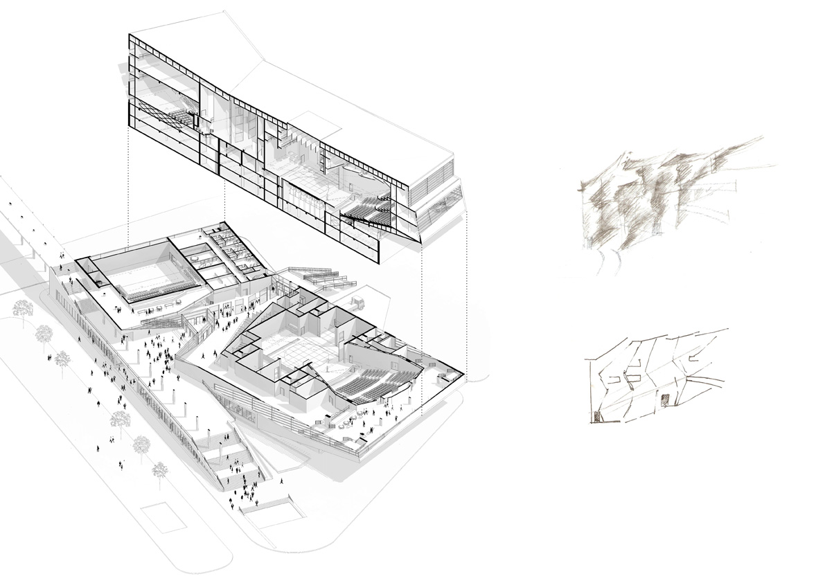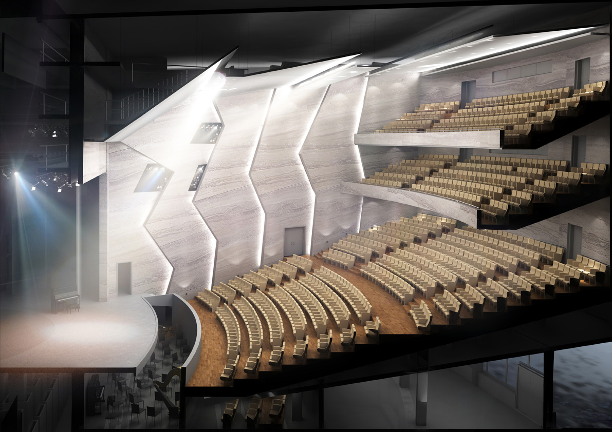 Чтобы подчеркнуть разное функциональное значение этих залов был использован такой прием, как «разлом» формы. Выразить идею помогают натуральные каменные материалы.