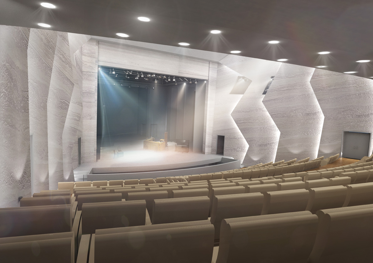 В зале все внимание зрителей направлено на сцену. Сам интерьер своей «сосредоточенной» архитектурой призывает к размышлению.