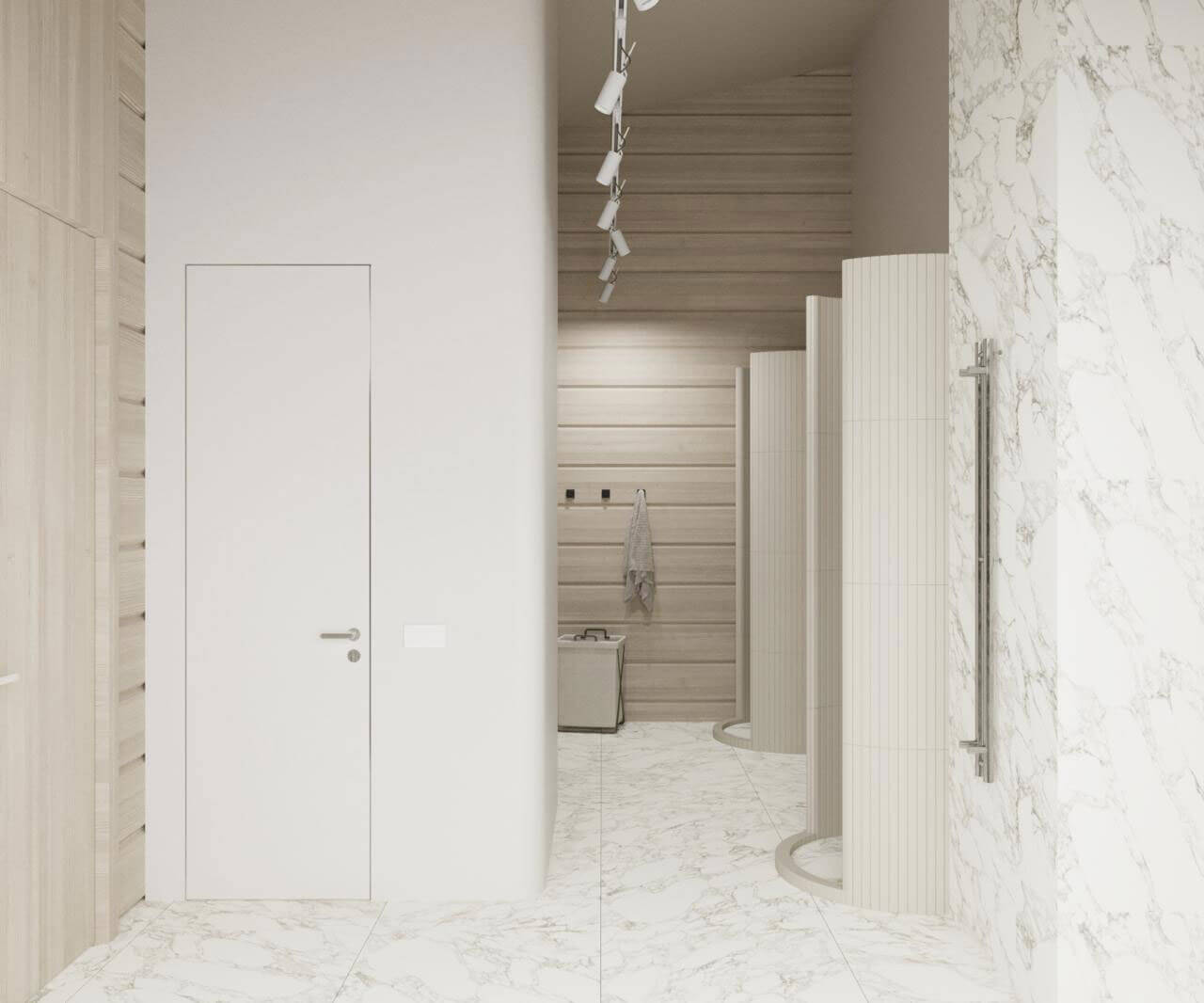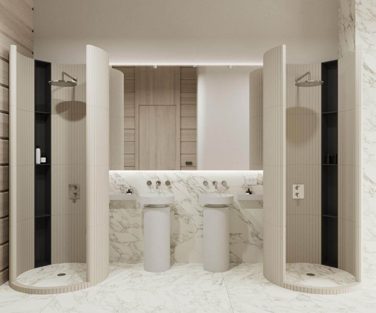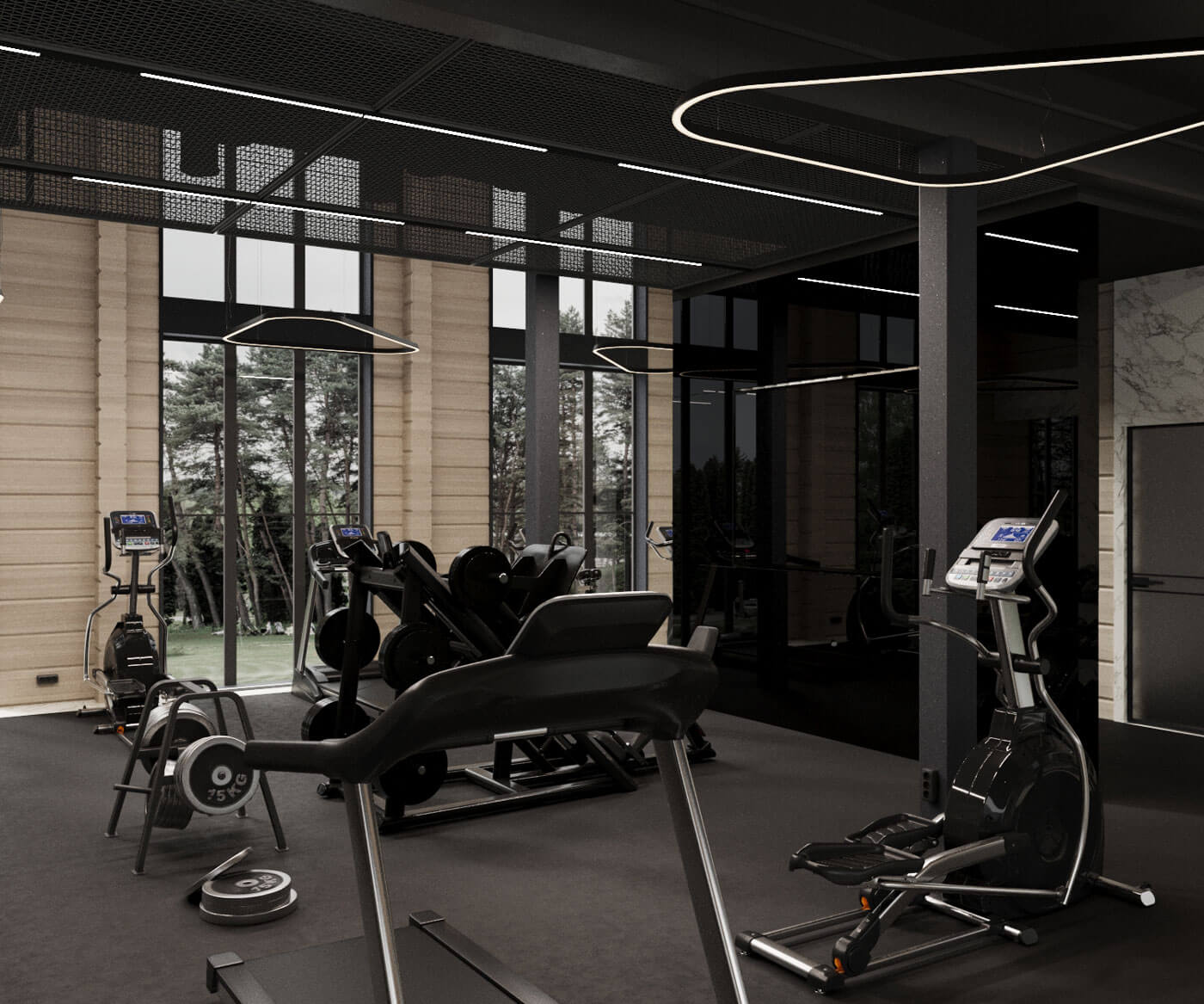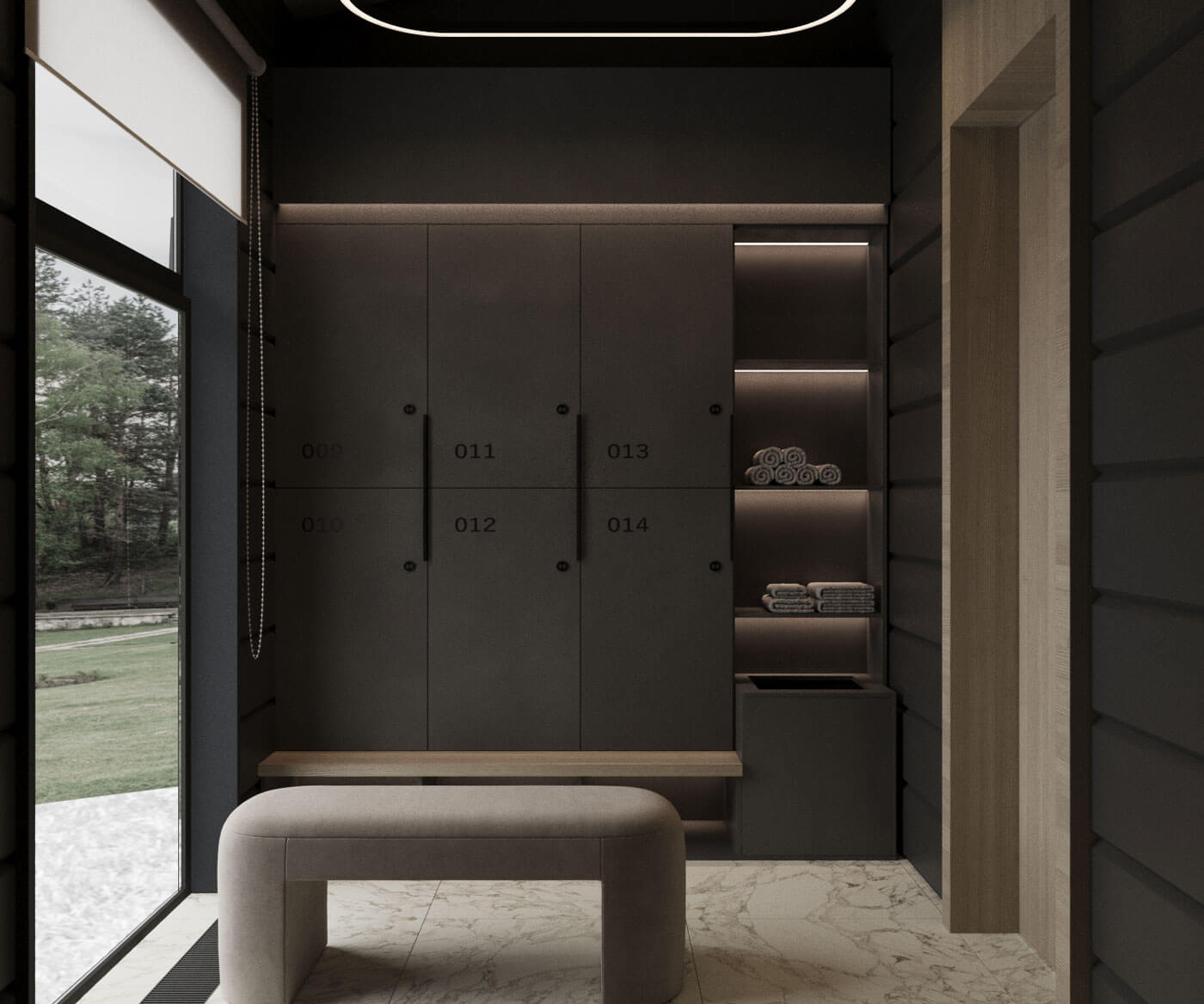 Создание пространства основного тренажерного зала с отдельных выходом на уличный воркаут задало окружение- абсолютно дикий лес, в основном березовая роща. Именно поэтому мы объединили графитовые элементы отделки и естественный цвет дерева. Раздвижная система стеклопакетов дает нам открытое пространство в теплый период времени, а панорамный проем между входной группой и тренажерным объединяют использованные материалы. Игра с преломлением света и искажения пространства создают свои почерк. Открытые душевые округлой формы продолжаются в радиусных формах с/у, мебели и элементов. Техническое помещение объединено с раздевалкой сквозных шкафом для удобства эксплуатации и так же имеет отдельный вход с улицы.
