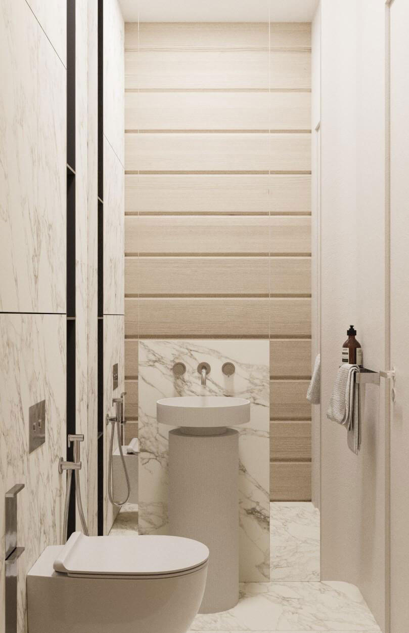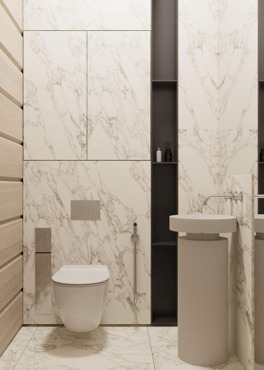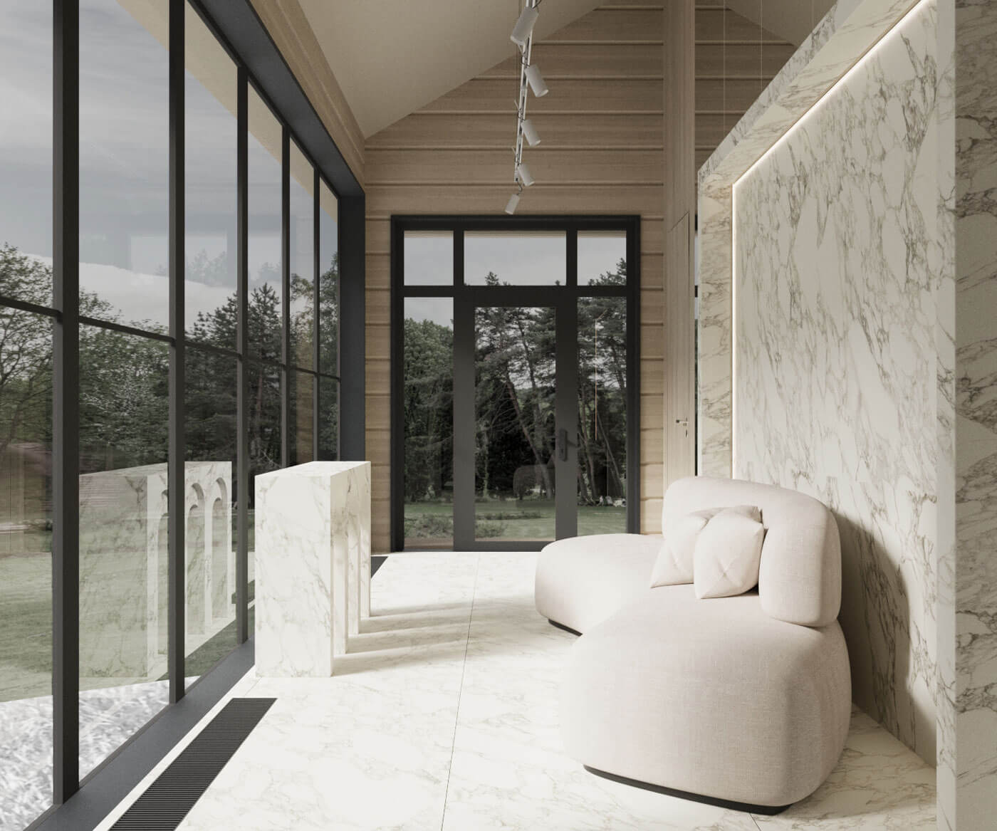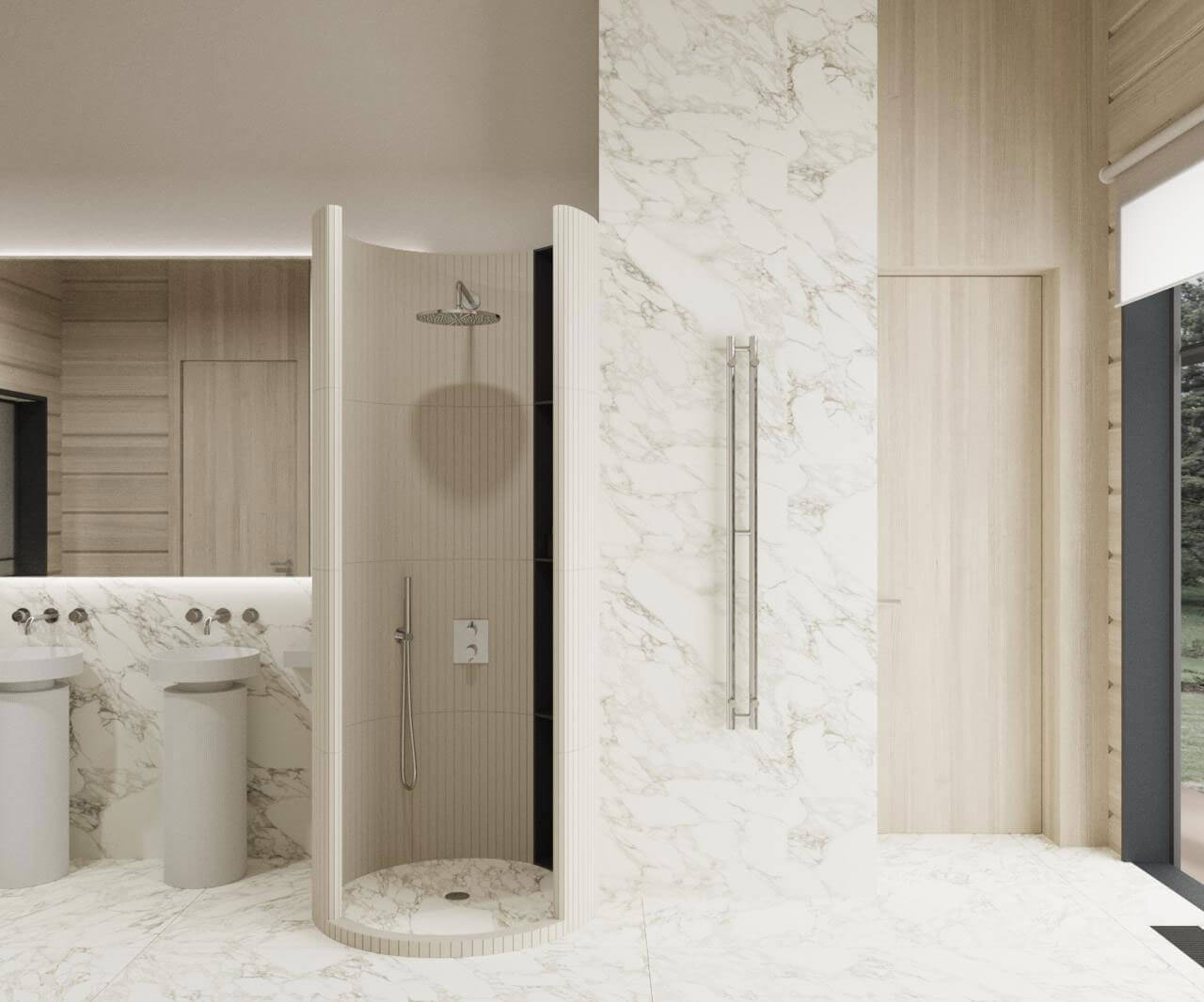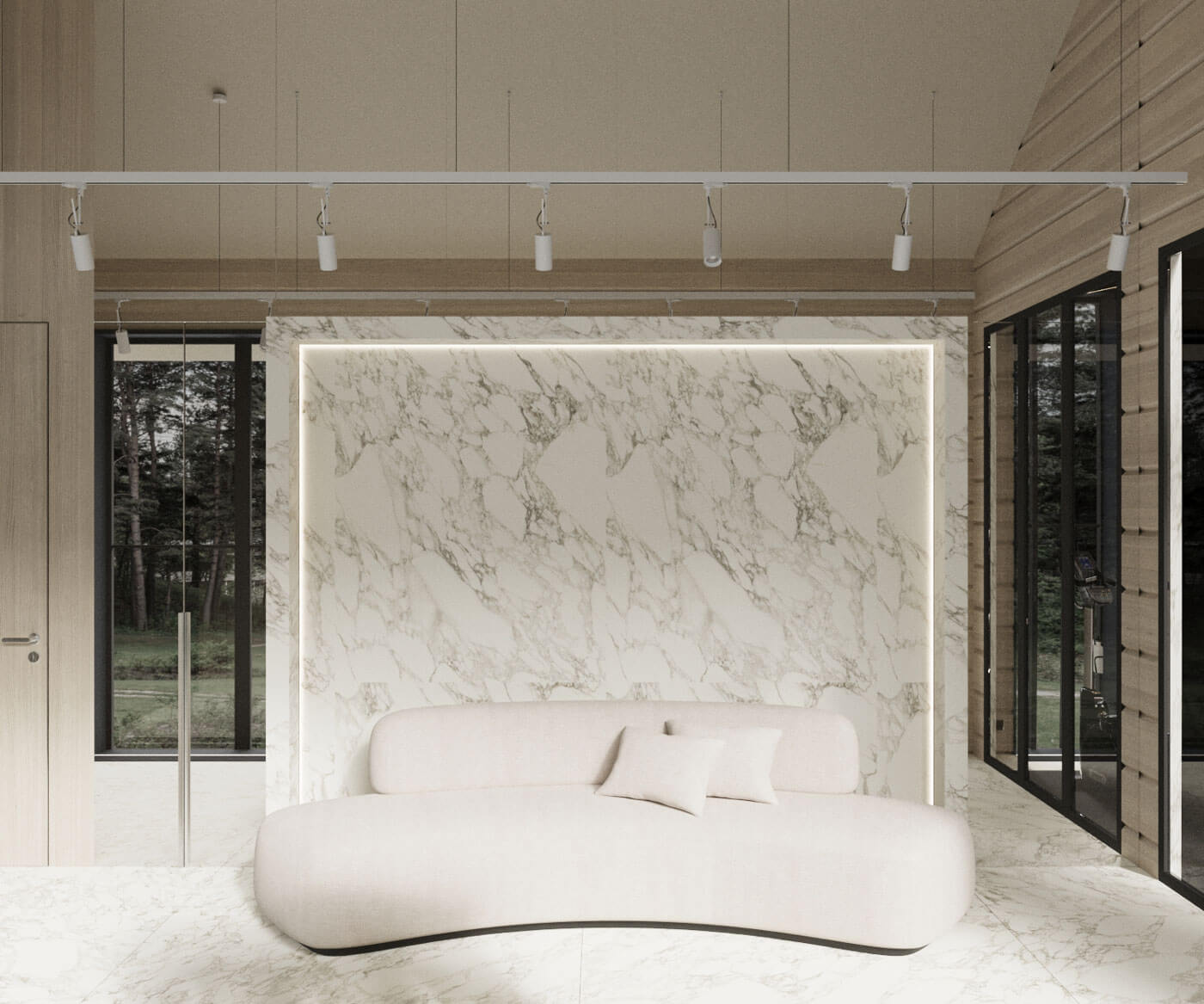 Создание пространства основного тренажерного зала с отдельных выходом на уличный воркаут задало окружение- абсолютно дикий лес, в основном березовая роща. Именно поэтому мы объединили графитовые элементы отделки и естественный цвет дерева. Раздвижная система стеклопакетов дает нам открытое пространство в теплый период времени, а панорамный проем между входной группой и тренажерным объединяют использованные материалы. Игра с преломлением света и искажения пространства создают свои почерк. Открытые душевые округлой формы продолжаются в радиусных формах с/у, мебели и элементов. Техническое помещение объединено с раздевалкой сквозных шкафом для удобства эксплуатации и так же имеет отдельный вход с улицы.