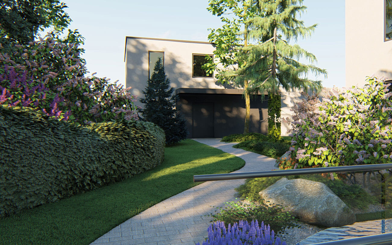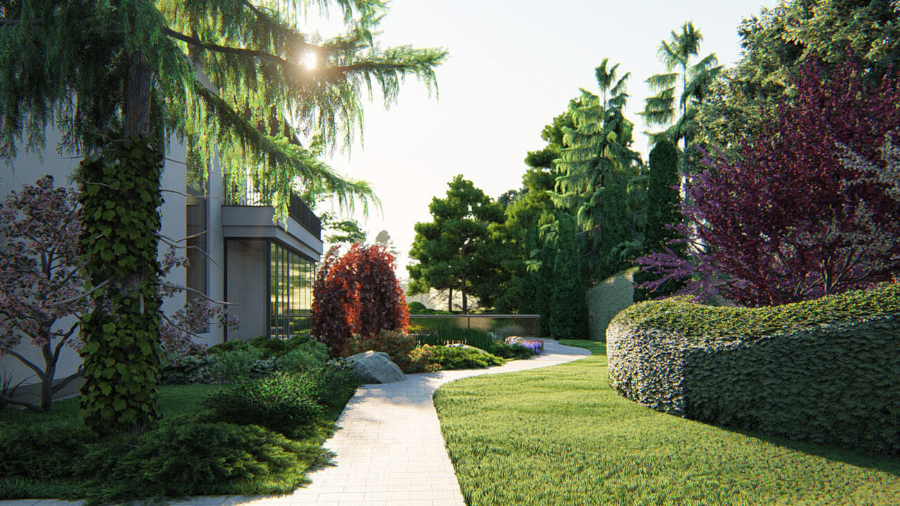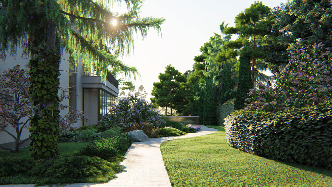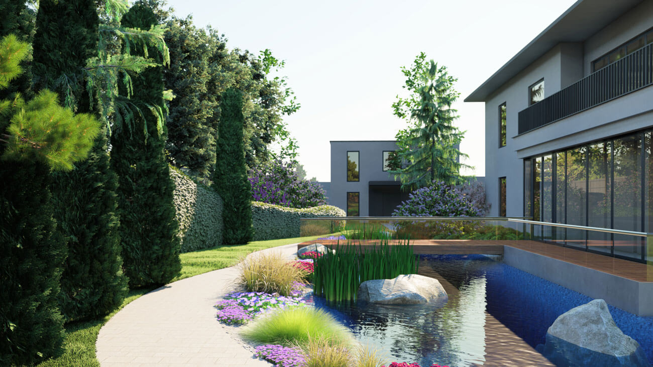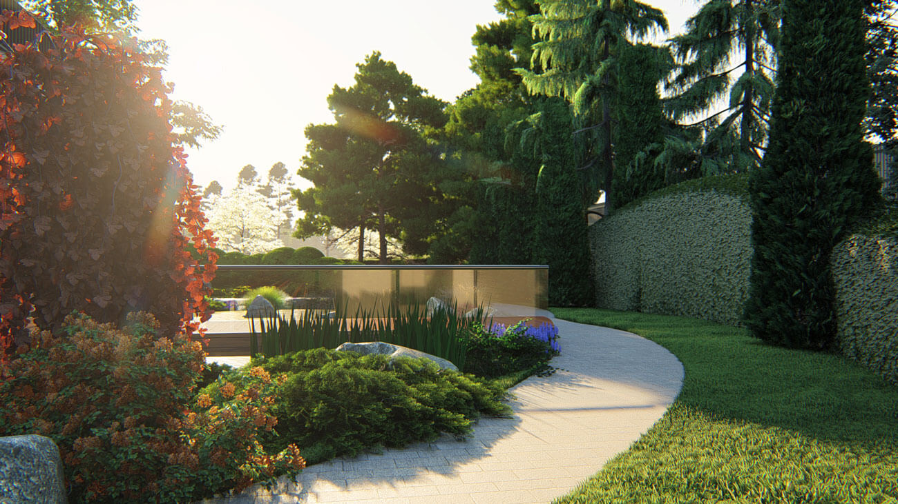 Самой большой задачей, которую необходимо было решить в процессе создания этого проекта, был узкий проход вдоль красивого водоема, примыкающего к дому. В «прогулочное настроение» никак не вписывалась непрезентабельная соседская ограда, за которой находилась очень красивая группа взрослых деревьев — так любимый дизайнером «заимствованный пейзаж».