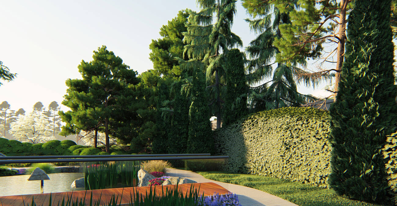 И в этом проекте наиболее яркая деталь — волнистые линии стриженной хвойной стены. Они сходятся, расходятся, становятся выше или ниже, толще или тоньше, и даже играют переливами цвета, так как задуманы из разных сортов туи.