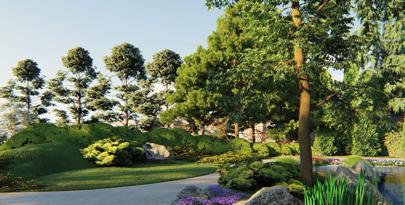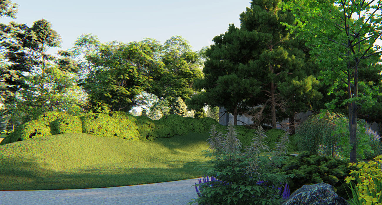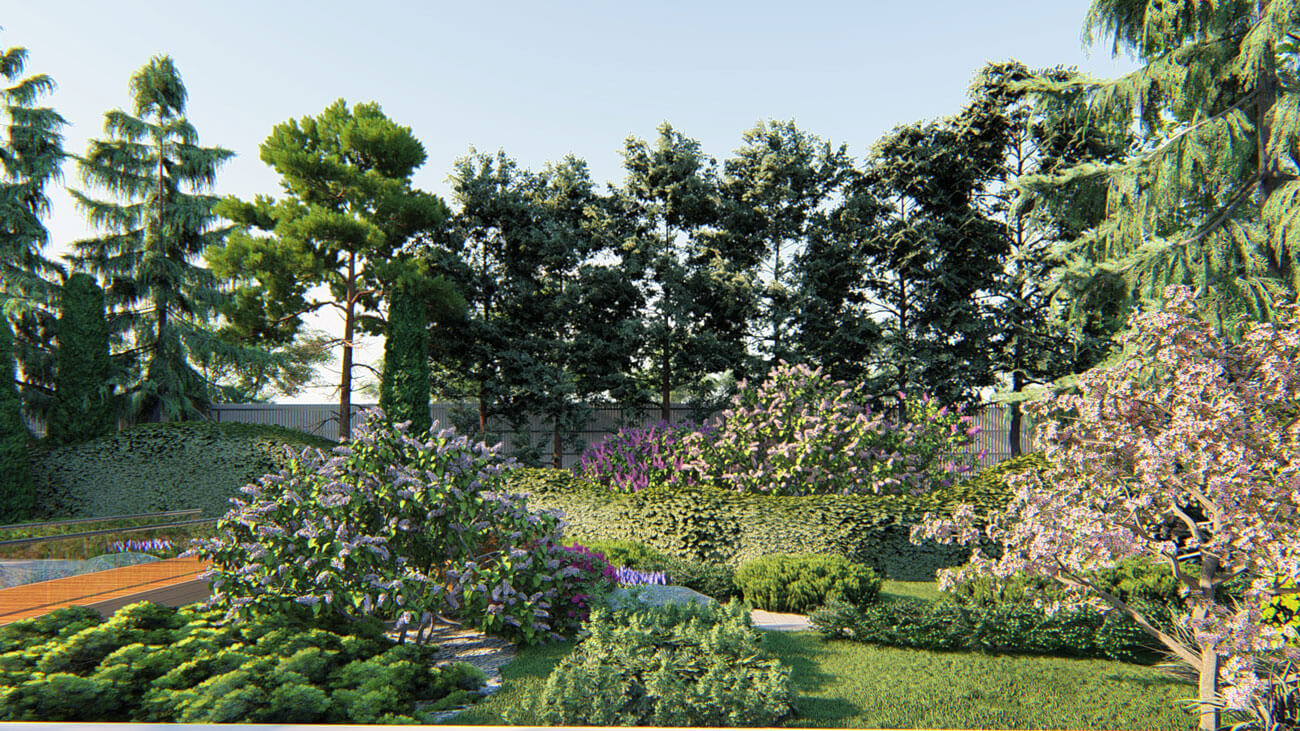 Стена идет вдоль высаженного заказчицей ряда сосен у ограды (которые уже начали оголяться снизу), то приближаясь к соснам, то отдаляясь, образуя внушительные карманы. В эти карманы изнутри посажены разные декоративные деревья: багрянник, сирени или яблони (визуализация показывает 2 разных варианта). На фоне стены можно посадить что-то низкое, например, рододендроны и гортензии. А завершает эту трехрядную посадку «заимствованный» у соседей пейзаж, делая неприглядную ранее узкую зону очень привлекательной, тем более, что именно на нее падает взгляд из окон гостиной.