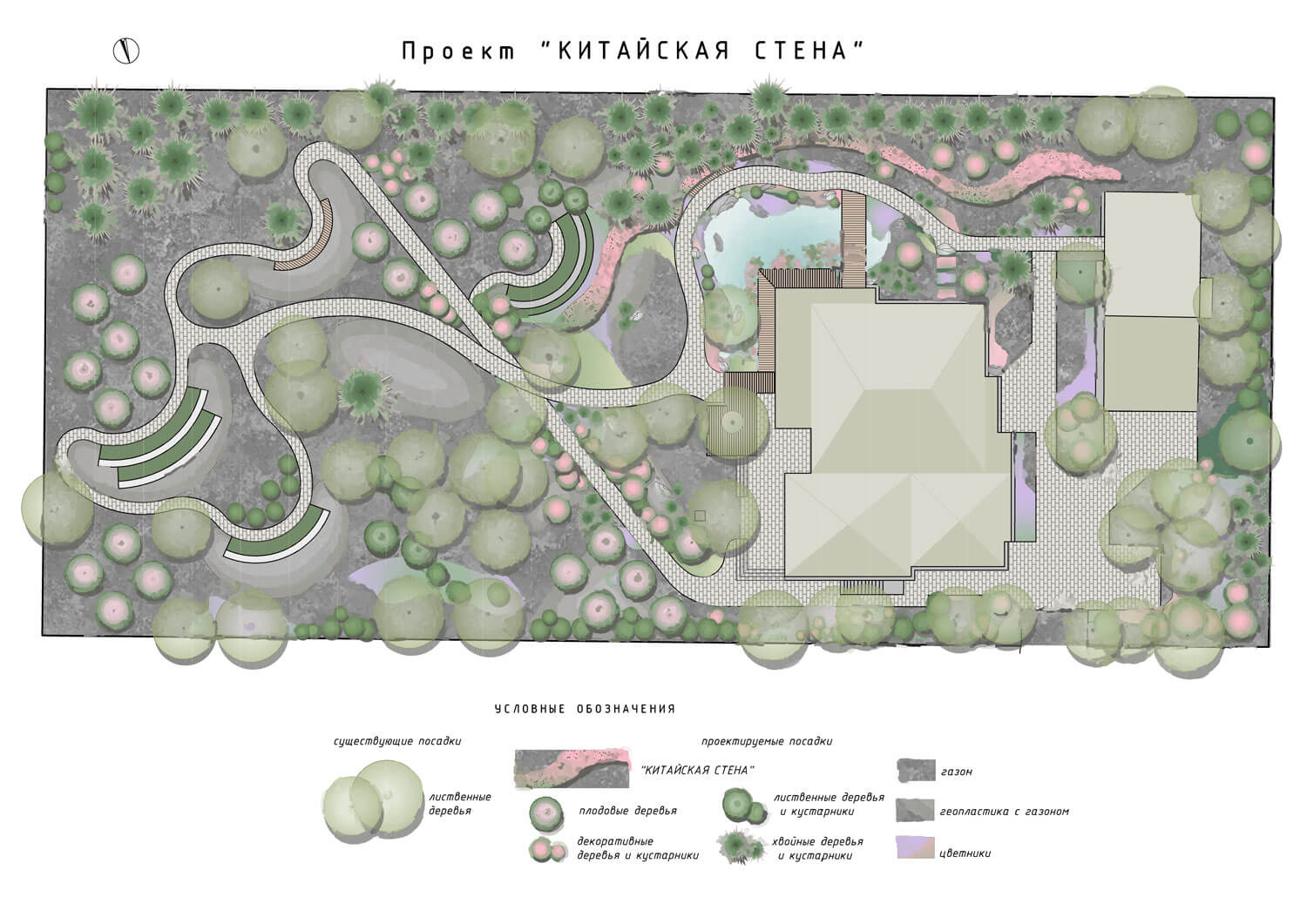 Другими словами, перед дизайнером стояла задача — скрыть эту самую ограду. Так и родилась идея «китайской стены». В свое время, увидев это сугубо практичное сооружение, автор была под впечатлением: как же «по-дизайнерски» смотрится эта извивающаяся полоса на фоне зелени; тогда она и решила для себя, что дизайн — это в первую очередь линия.