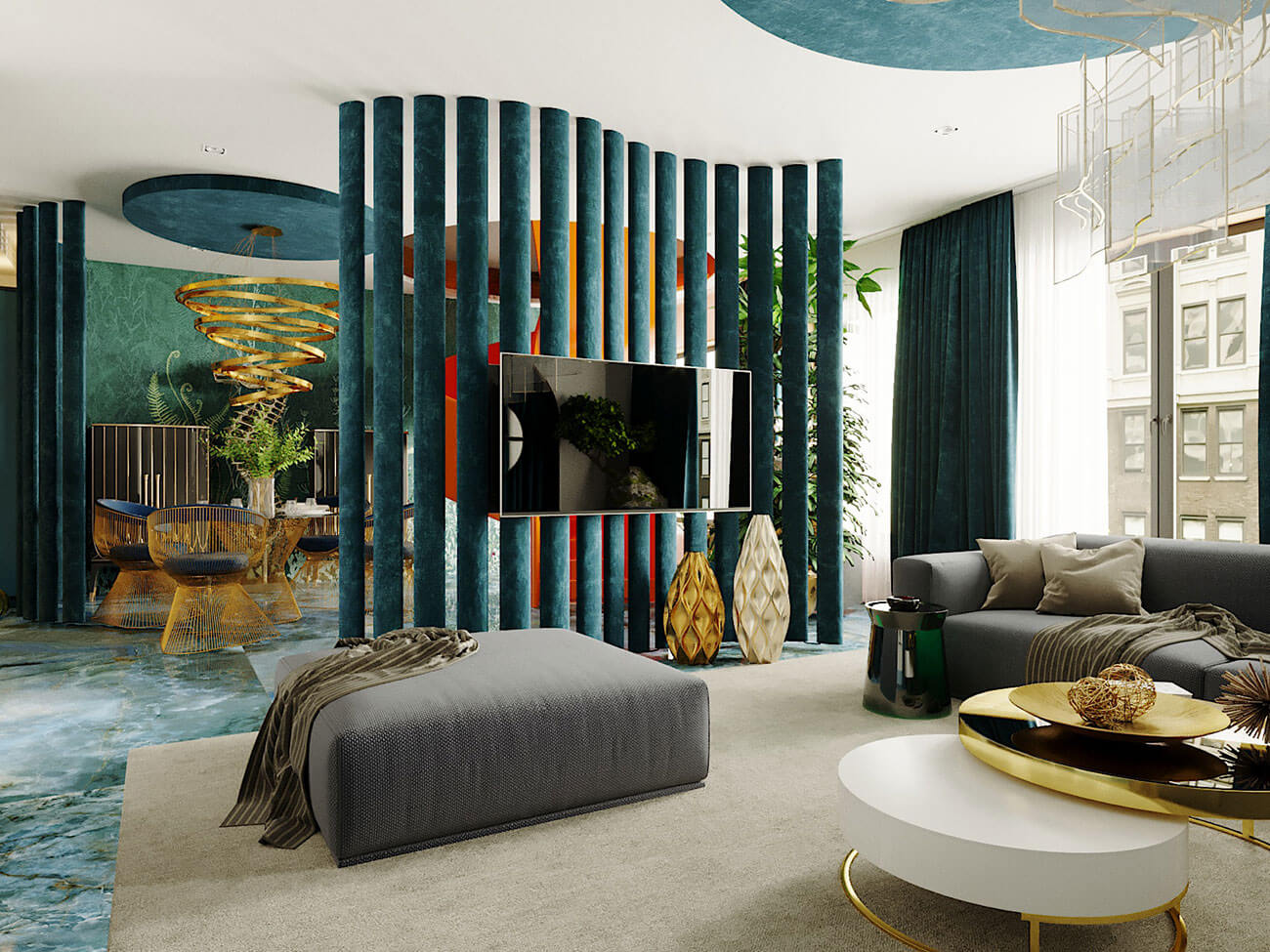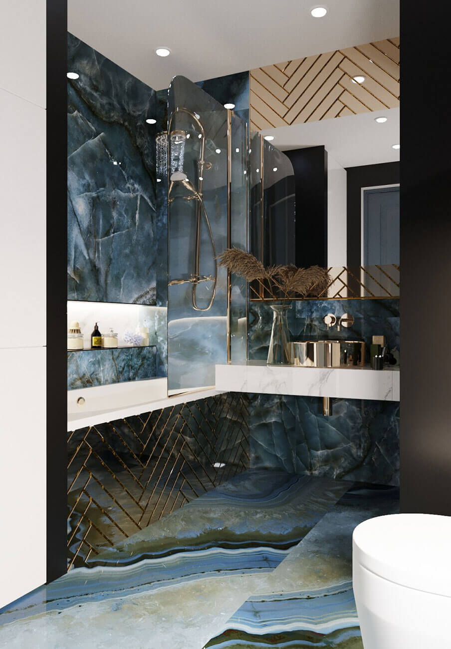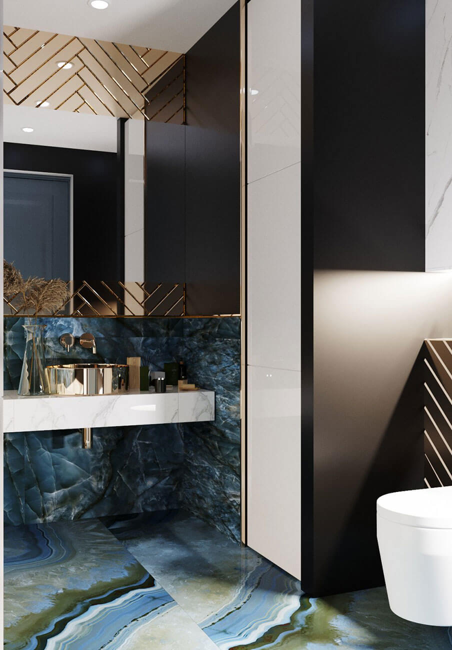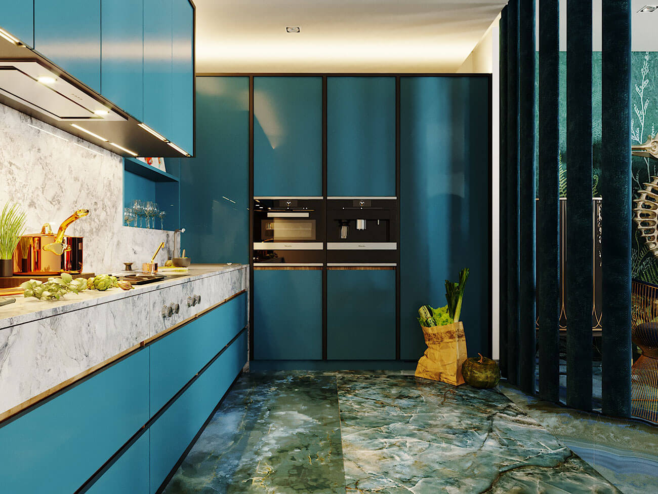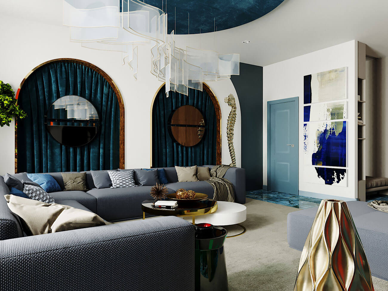 Символом интерьера выступает стихия воды. Этот символ был выбран неслучайно, ведь хозяева квартиры владельцы школы дайвинга. В силу своей занятости, хозяева проводят немного времени дома, поэтому приготовлением пищей занимаются редко.