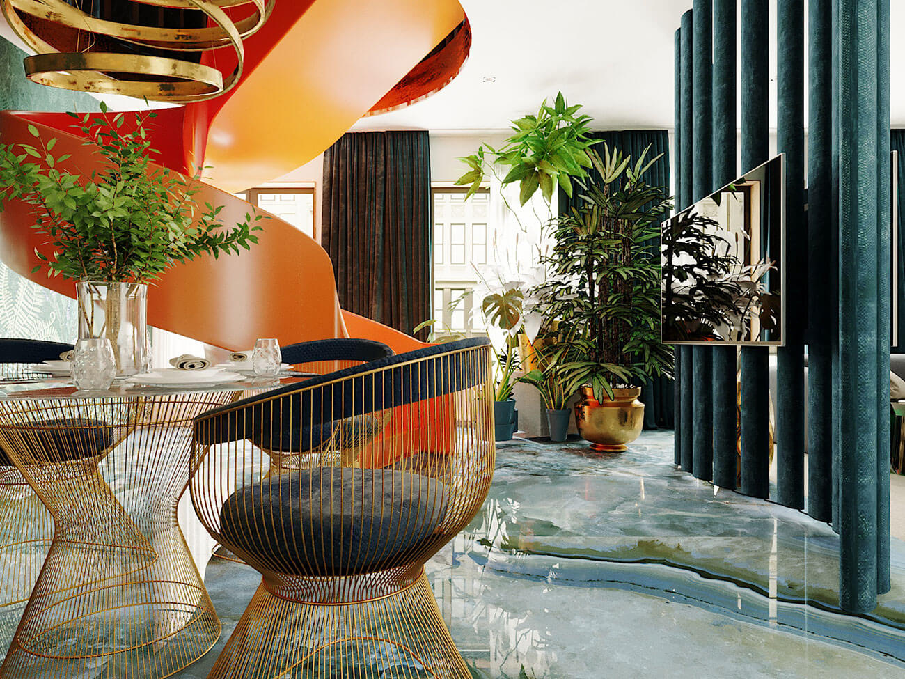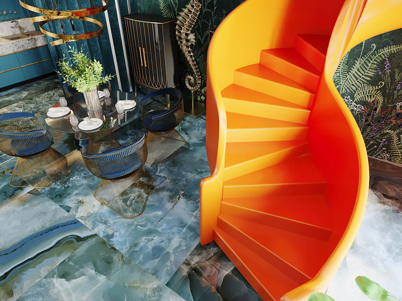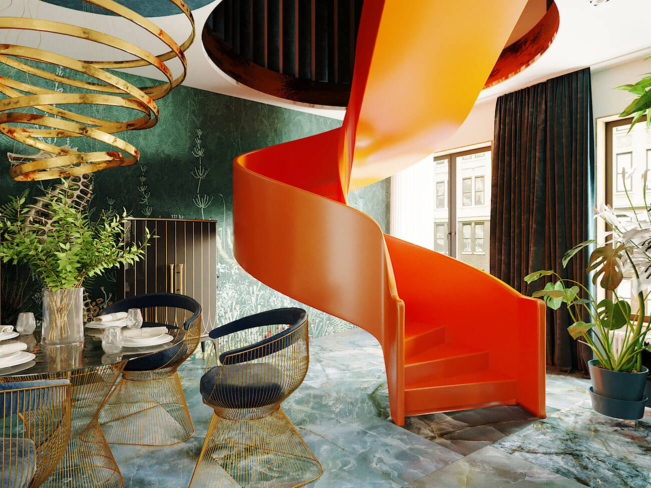 Спокойную цветовую гамму интерьера «взрывает» винтовая лестница «оранжево-кораллового» цвета, привнося в интерьер яркий акцент и контраст восприятия.