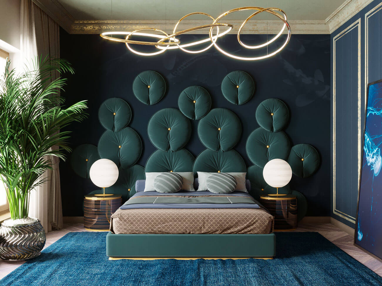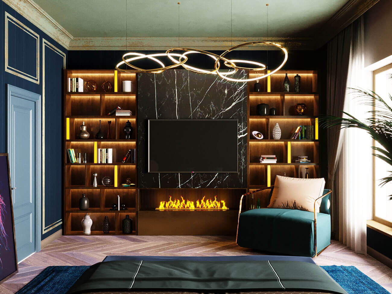 В спальне создана атмосфера уюта и умиротворения. Глубокие темные тона уравновешивает теплое свечение камина.