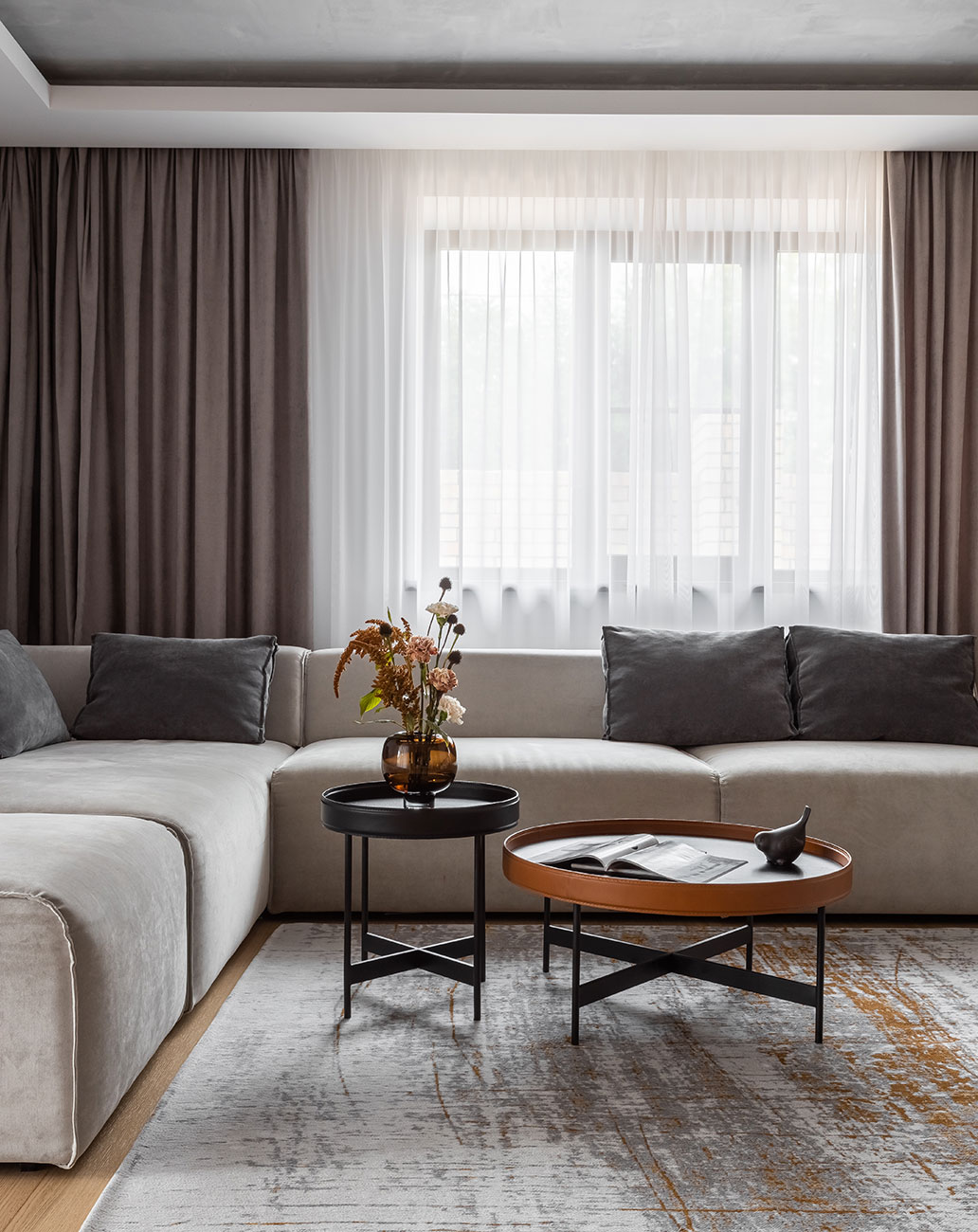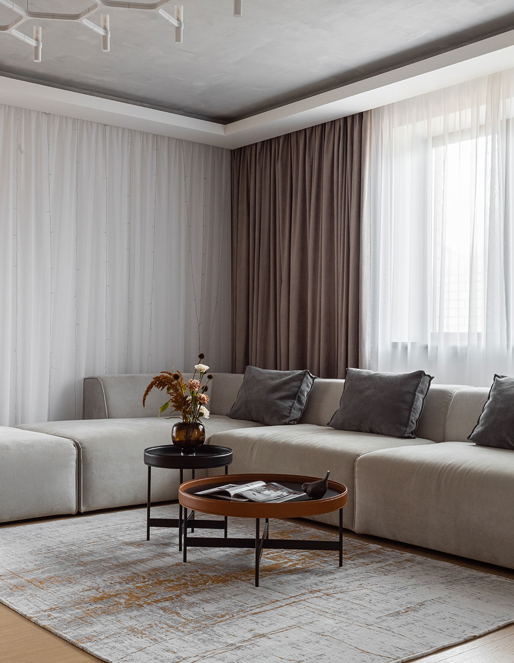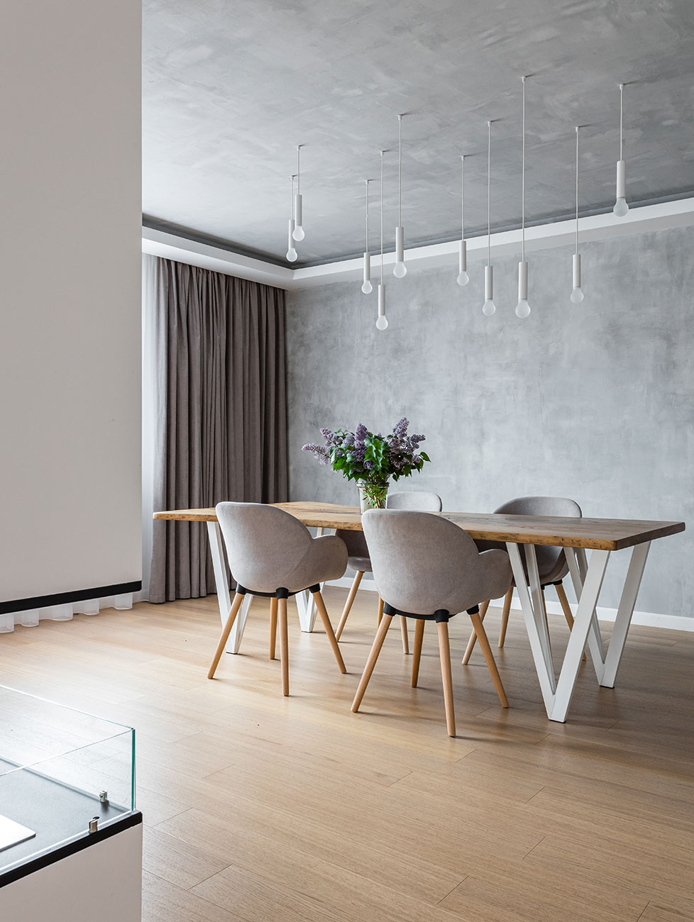 Зона гостиной и столовой были единым пространством, которое мы поделили колонной с встроенным биокамином и потолочными нишами со штукатуркой, имитирующей бетон.