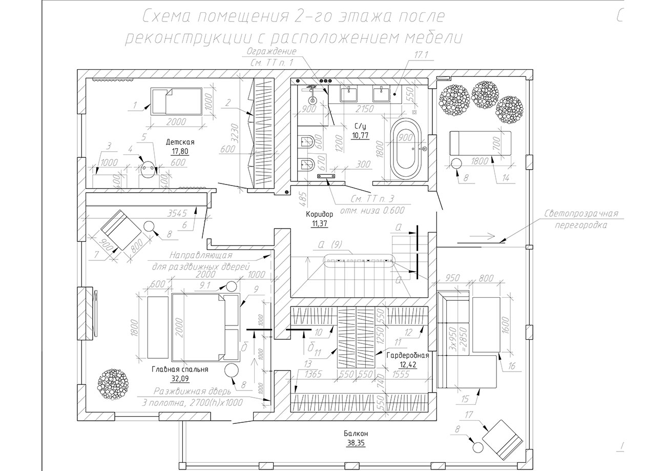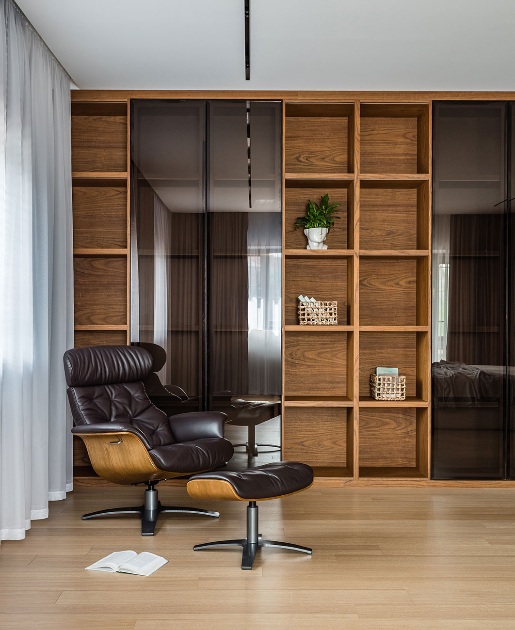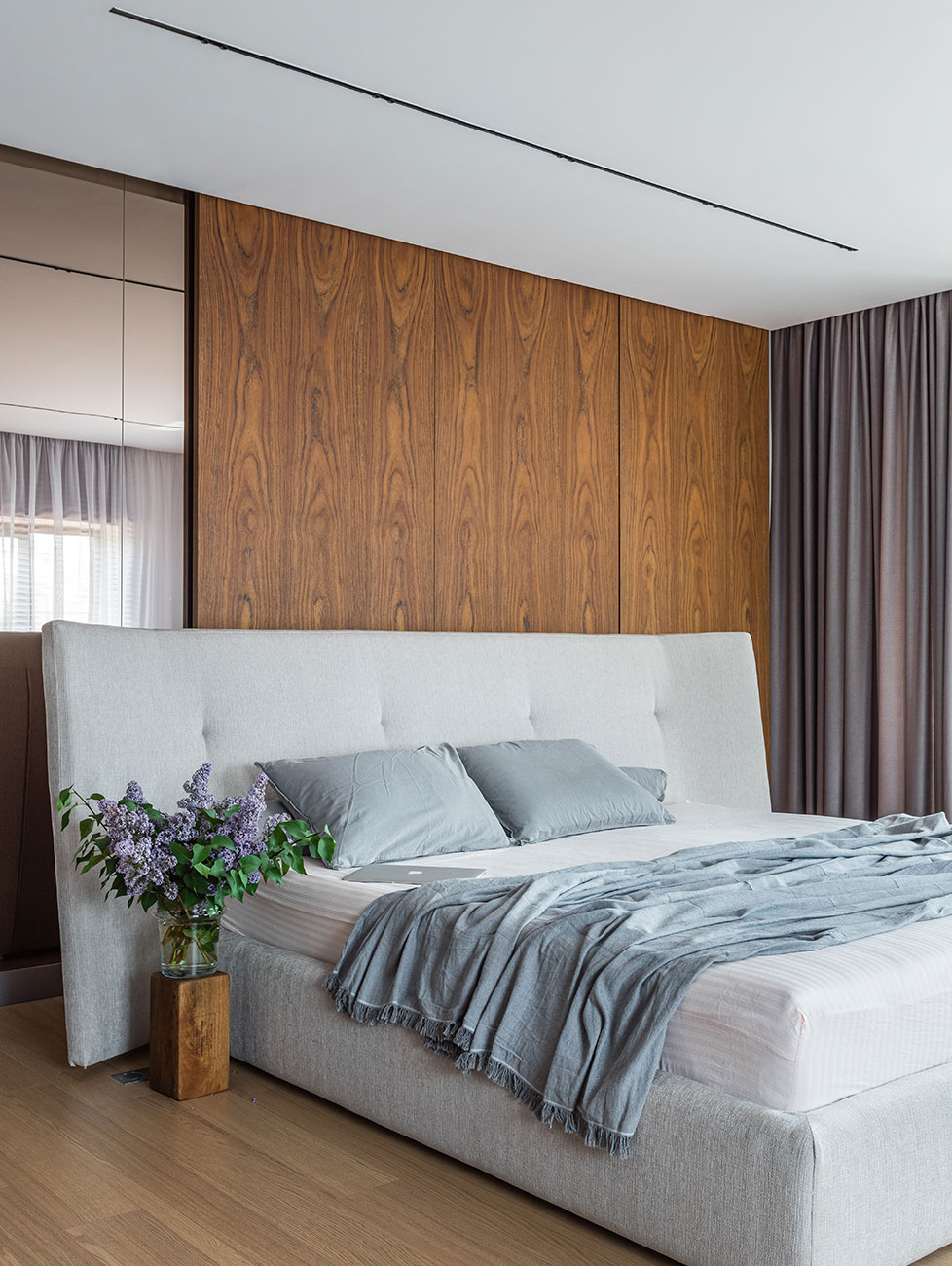 На втором этаже располагаются спальня с гардеробной, вход в которую скрывается за откатной шпонированной дверью, и большая ванная комната.
