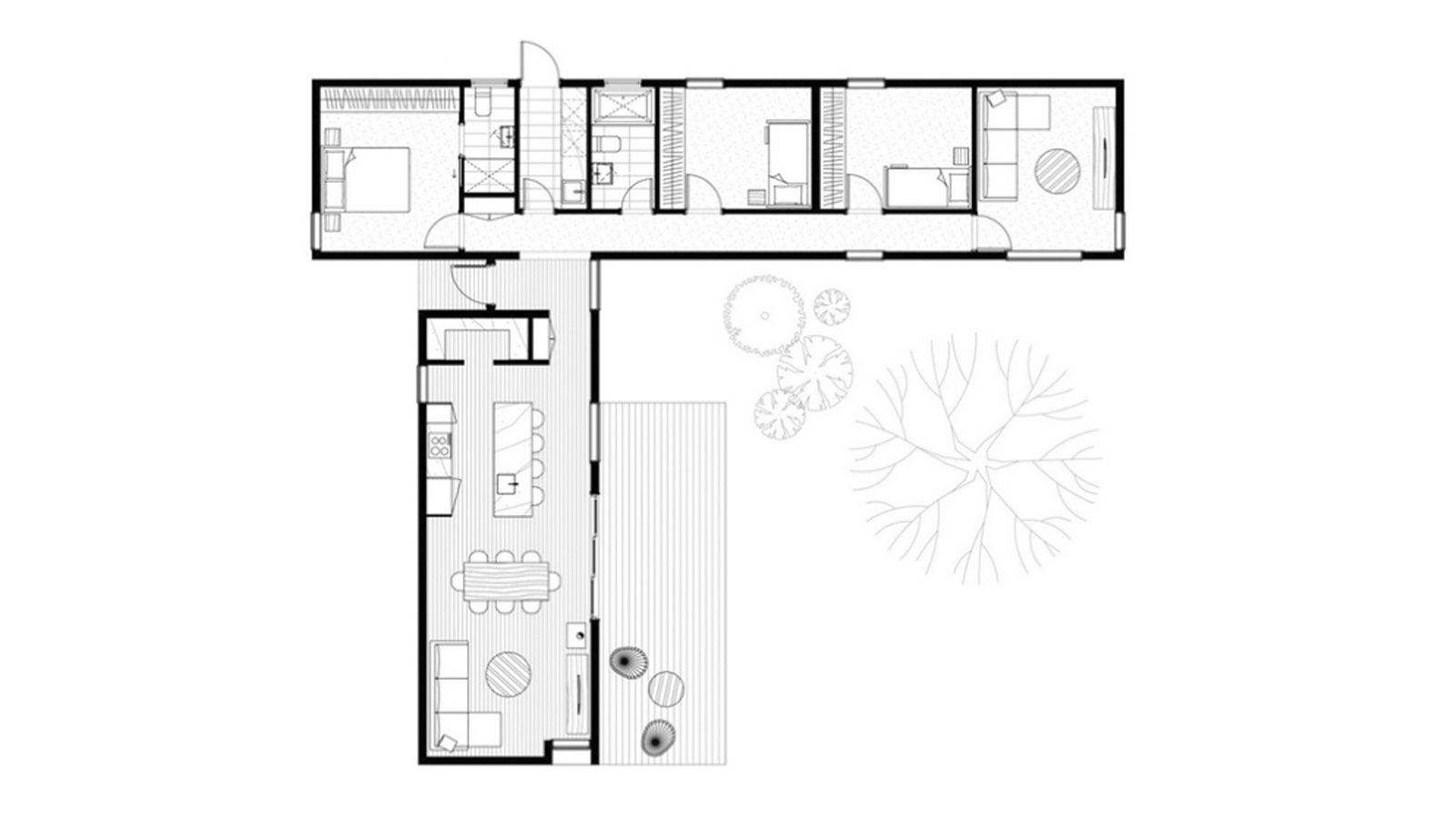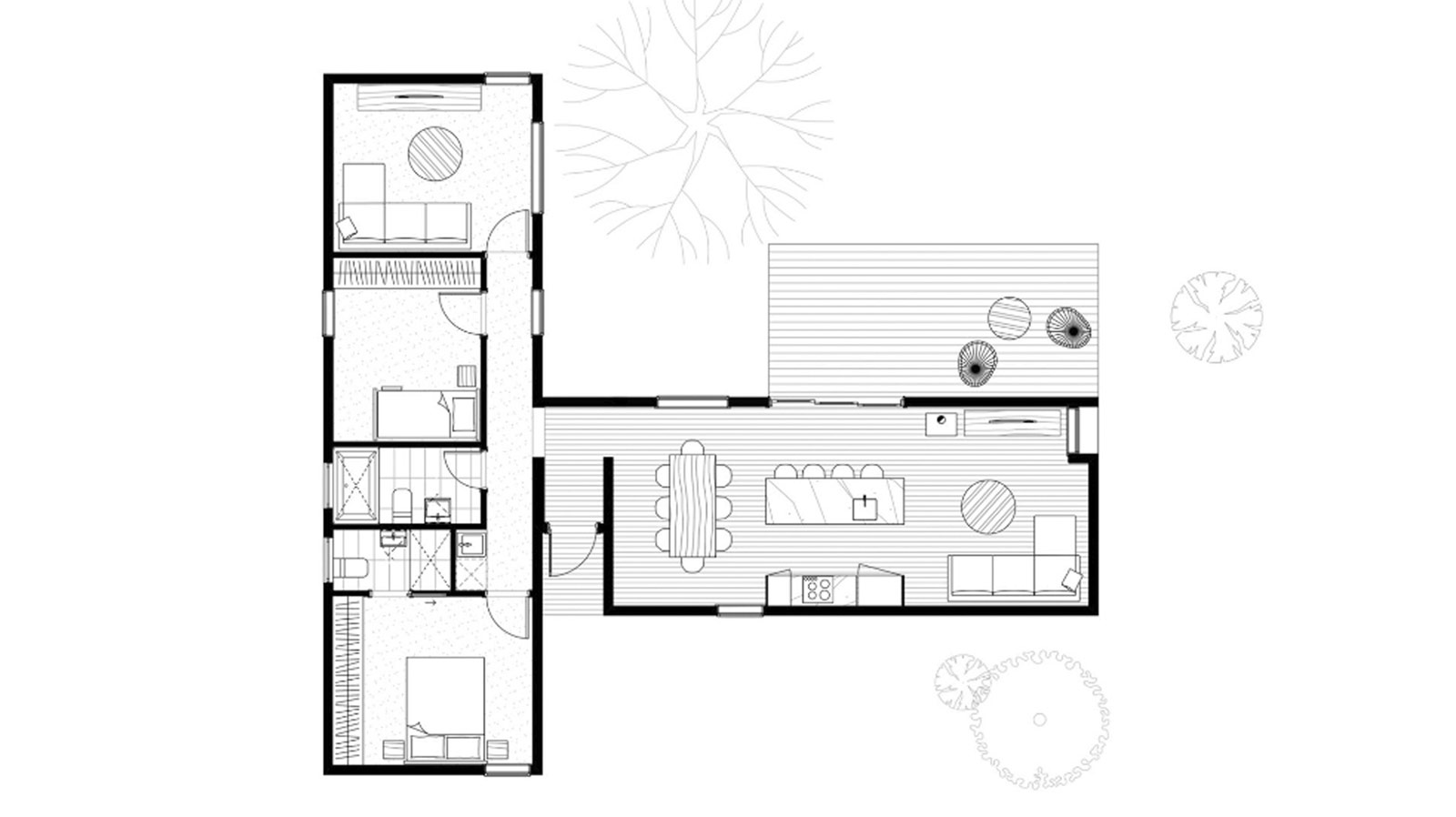 Два взаимосвязанных модуля создают «сустав» — связующий интерфейс, который становится формальным входом между частной и общественной зонами. Щедрая кухня открытой планировки с центральной островной скамьей/гостиной приветствует обилие естественного света и обеспечивает прекрасное пространство для общения за едой и ощущения безопасности, зная, что вы можете присматривать за детьми, играющими на улице. Дополнительная уединенная гостиная или кабинет создают зону отдыха вдали от основной жилой зоны. При правильной ориентации этот дом захватывает разумное пассивное солнечное излучение, чтобы поддерживать комфортную температуру в течение всего года.