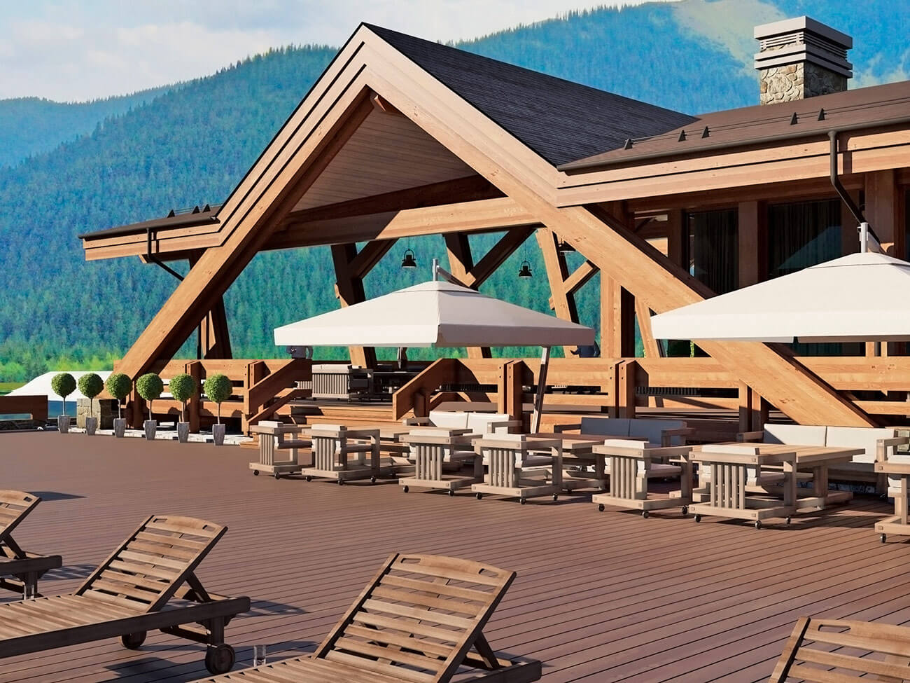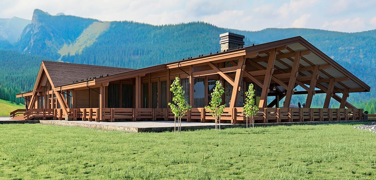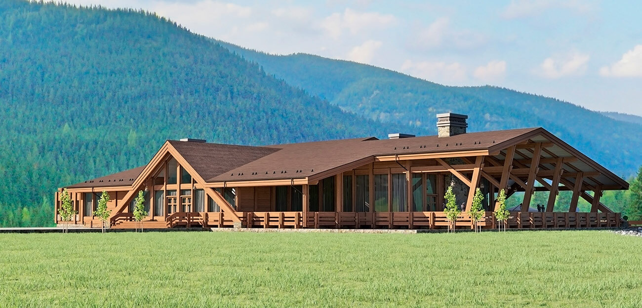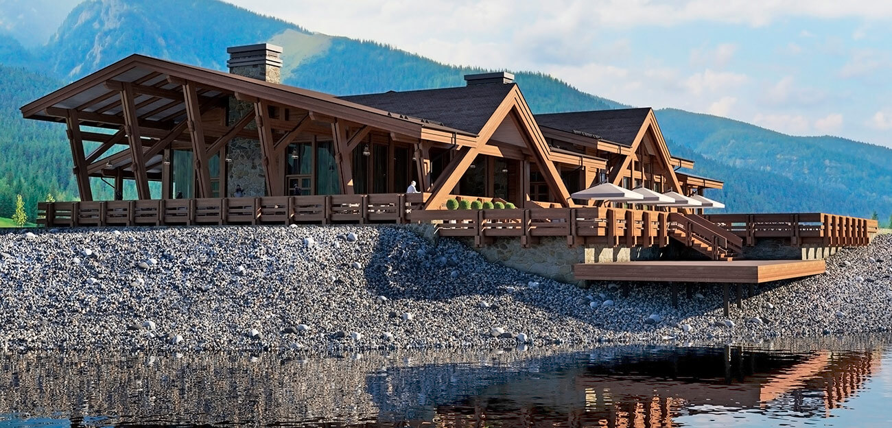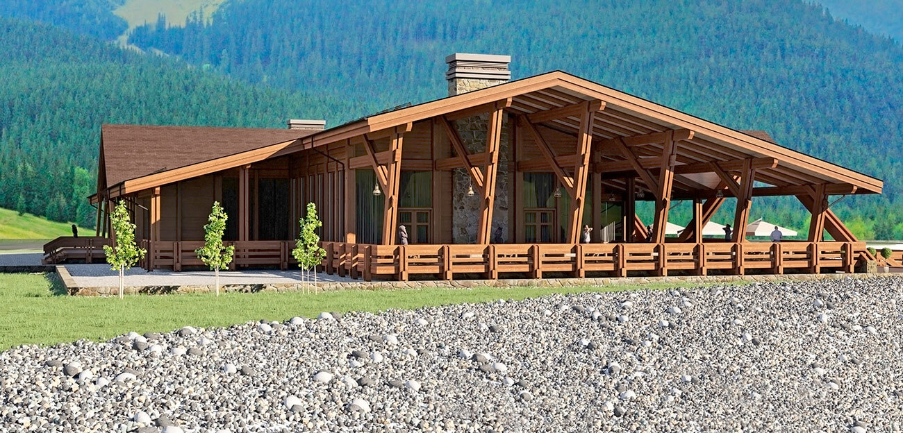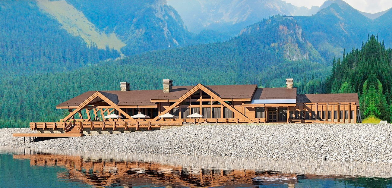 Архитектурный объем сооружения повторяет горные силуэты и спроектирован в современном духе с применением клееной древесины, натурального планкена из лиственницы и натурального камня. Проект выполнен по технологии «фахверк», что подразумевает большое панорамное остекление здания, которое как ничто другое позволяет создать иллюзию перетекающего пространства из внутреннего на многочисленные открытые террасы, стекающие по склону практически к воде.