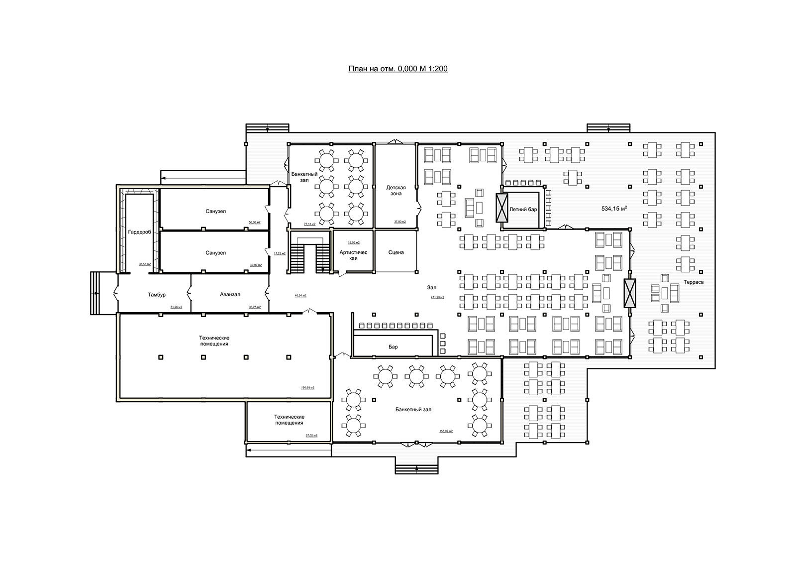 Общая площадь объекта — 1260 кв. м. Ресторан рассчитан на 200 посадочных мест, но потенциал рассчитан и на развитие парковой зоны вокруг здания, и на появление на данной территории других сооружений в едином ансамбле.