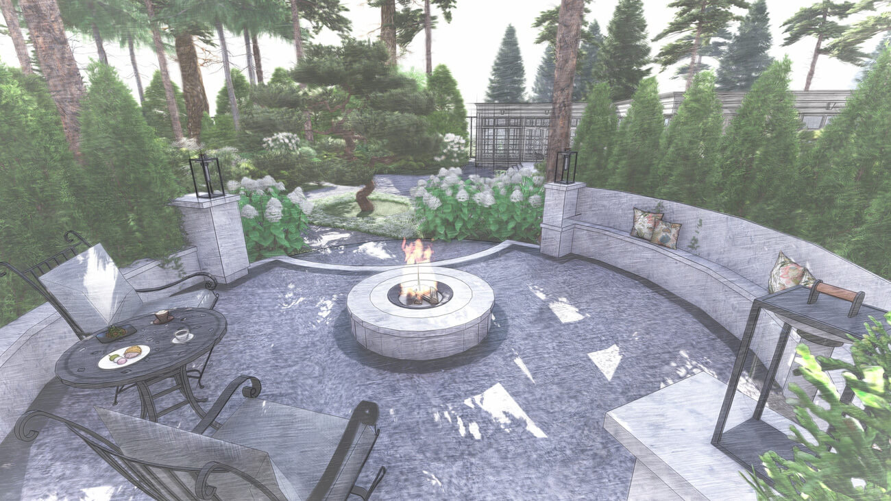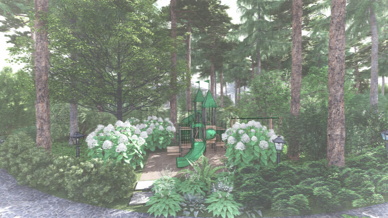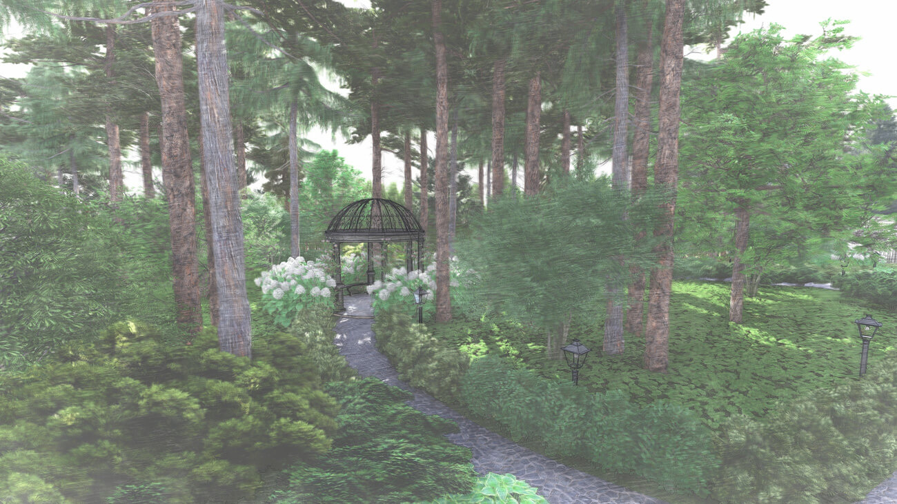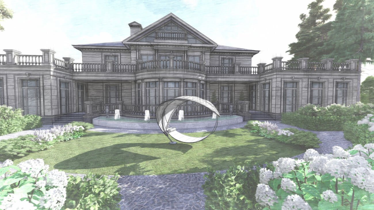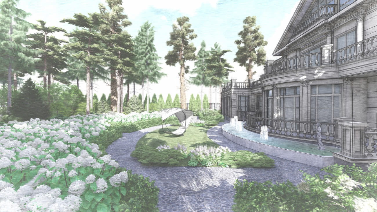 Основной задачей ландшафтного проекта было вписать жилой дом, фасад которого выполнен в классическом французском стиле ,в местность, где уже растет около 100 вековых сосен, и соединить два, казалось бы, несовместимых стиля — регулярный французский и природный (пейзажный), учитывая особенности почвы и освещения на участке.