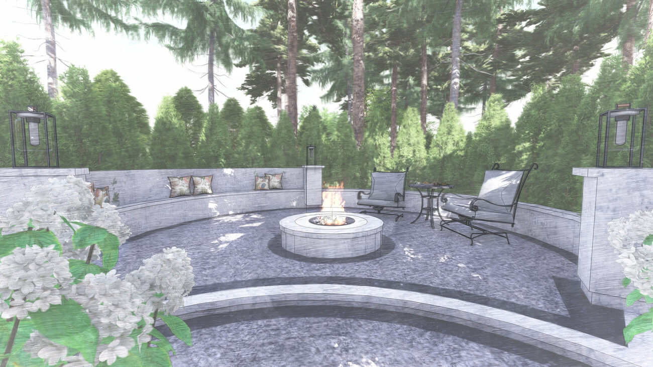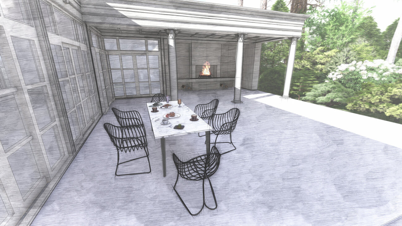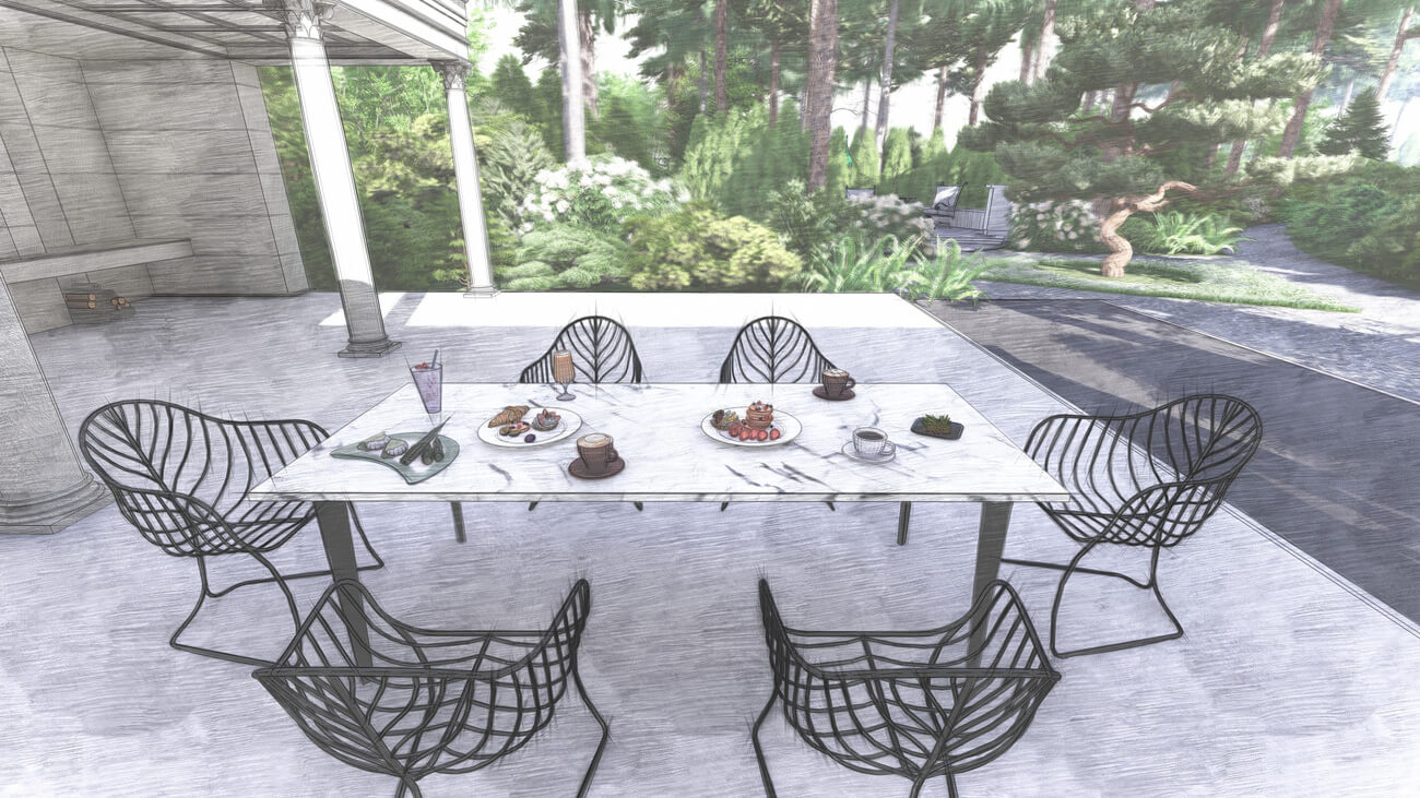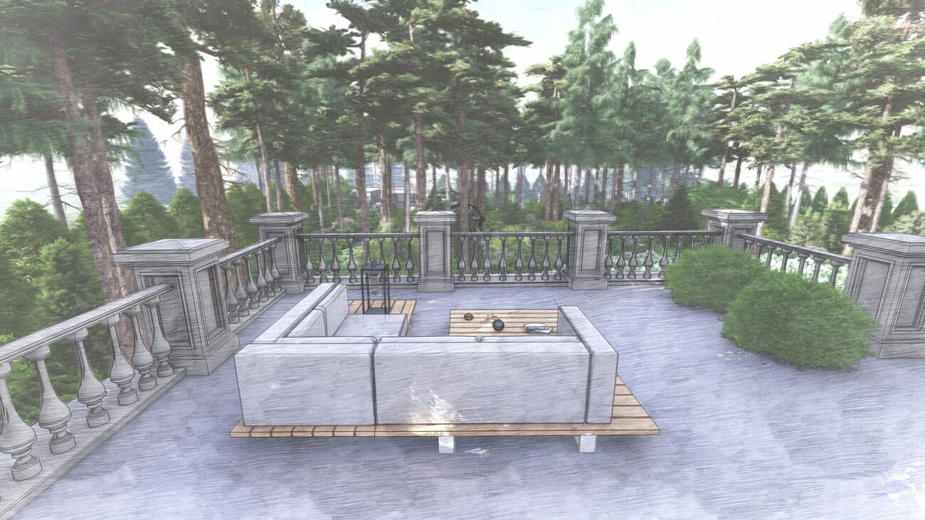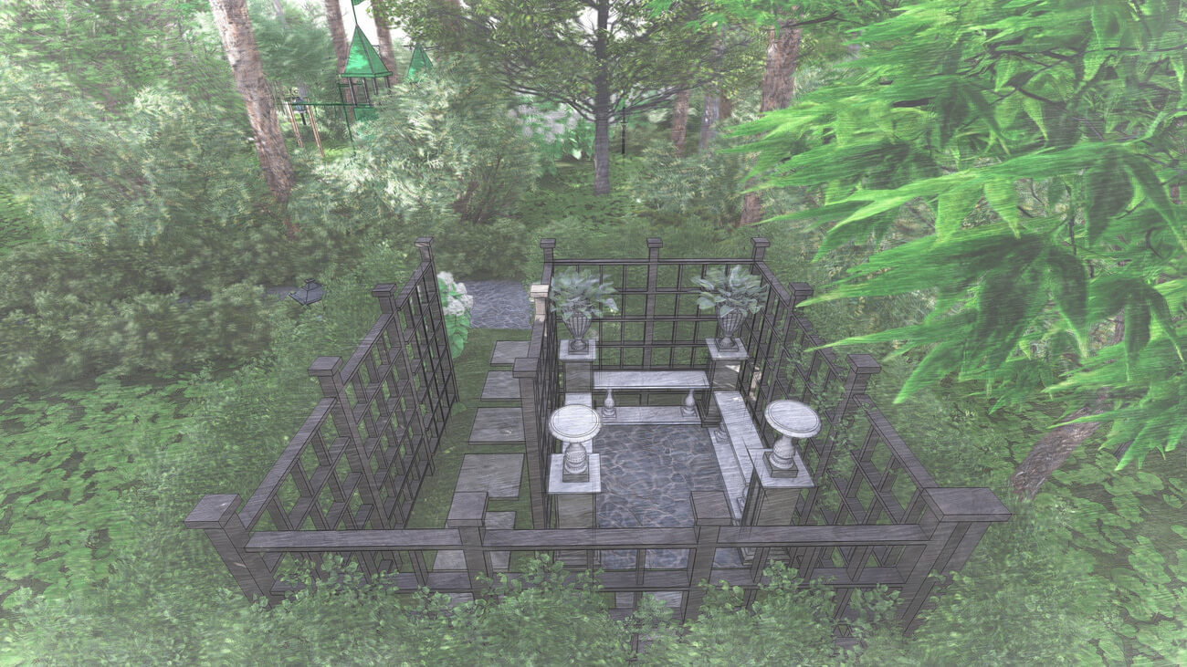Основной задачей ландшафтного проекта было вписать жилой дом, фасад которого выполнен в классическом французском стиле ,в местность, где уже растет около 100 вековых сосен, и соединить два, казалось бы, несовместимых стиля — регулярный французский и природный (пейзажный), учитывая особенности почвы и освещения на участке.