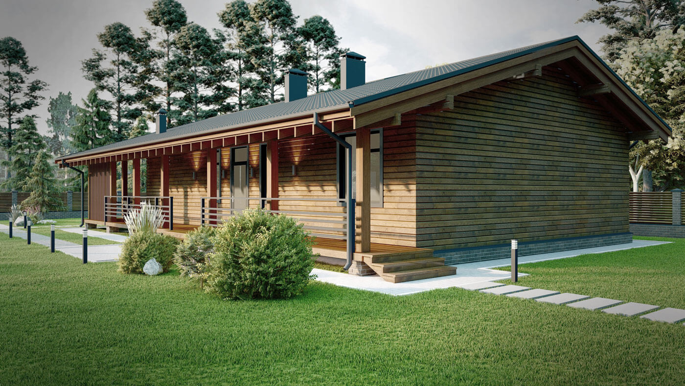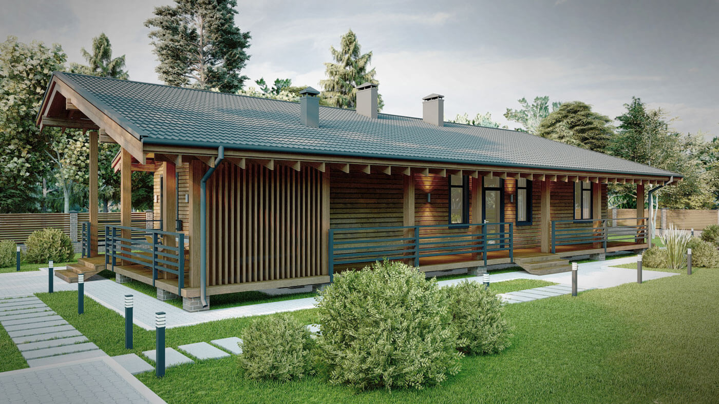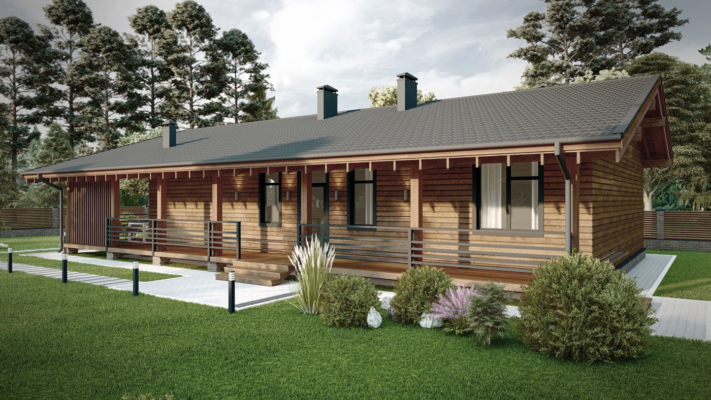 Проект одноэтажного дома в стиле «Шале» рассчитанный на семью из 4-х человек. Это просторный дом с большой крытой террасой, светлой уютной кухней-гостиной с панорамными окнами и видом на благоустроенный участок. Помимо трех спален в доме есть кабинет, который может быть использован как гостевая спальня. Гардеробная при входе в дом, отдельный гостевой санузел, кладовая при кухне и постирочная, совмещенная с топочной, сделают жизнь в этом доме комфортной и эргономичной. Пропорции фасадов, высота помещений и угол кровли выверены и гармоничны. Теплый цвет натурального дерева в отделке в сочетании с благородной текстурой дуба и подсветка фасадов на террасе в вечернее время создают дополнительный уют. А декоративный элемент из вертикальных реек и лаконичные ограждения придают дому современный образ.