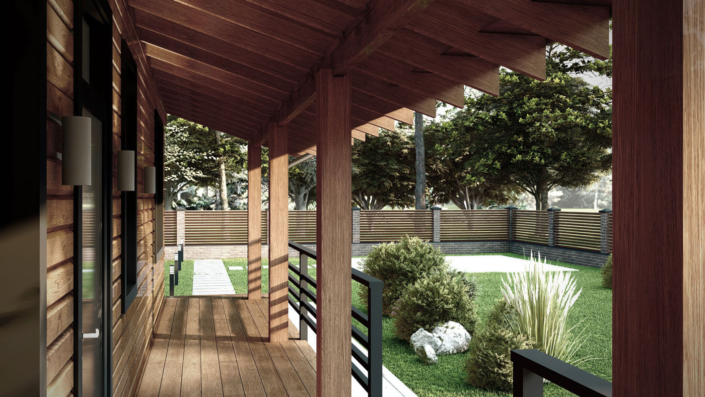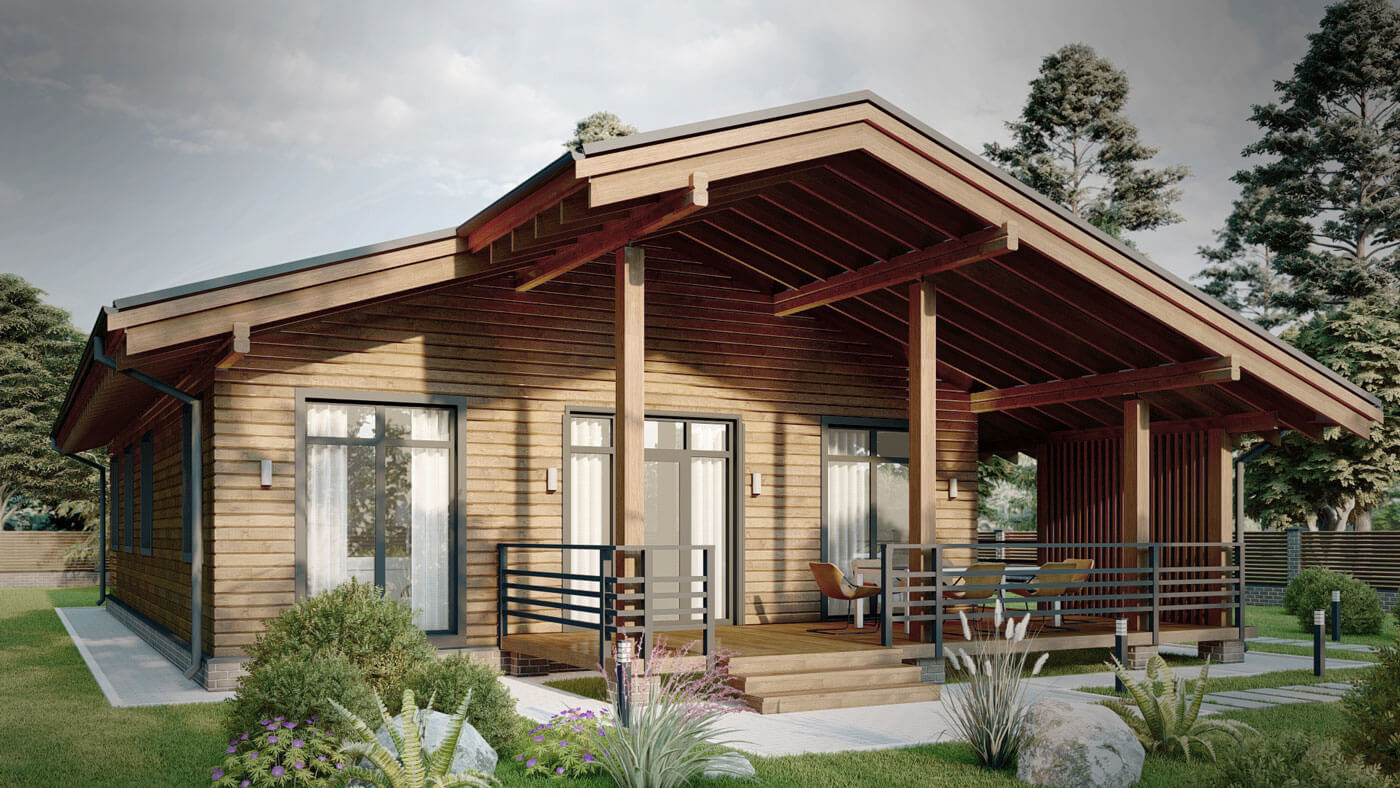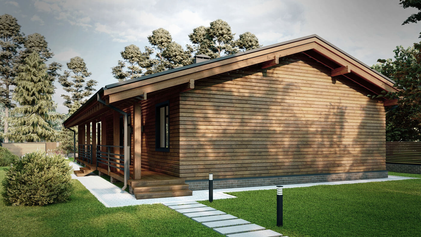 Проект одноэтажного дома в стиле «Шале» рассчитанный на семью из 4-х человек. Это просторный дом с большой крытой террасой, светлой уютной кухней-гостиной с панорамными окнами и видом на благоустроенный участок. Помимо трех спален в доме есть кабинет, который может быть использован как гостевая спальня. Гардеробная при входе в дом, отдельный гостевой санузел, кладовая при кухне и постирочная, совмещенная с топочной, сделают жизнь в этом доме комфортной и эргономичной. Пропорции фасадов, высота помещений и угол кровли выверены и гармоничны. Теплый цвет натурального дерева в отделке в сочетании с благородной текстурой дуба и подсветка фасадов на террасе в вечернее время создают дополнительный уют. А декоративный элемент из вертикальных реек и лаконичные ограждения придают дому современный образ.