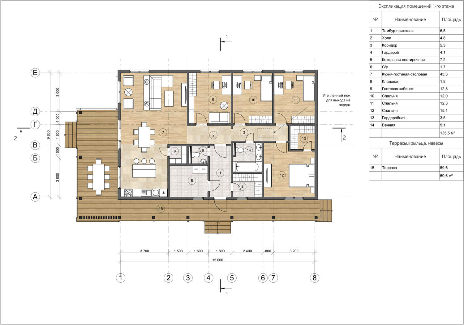 Общая площадь (без учета террасы, крыльца и навеса) – 135,5 м²