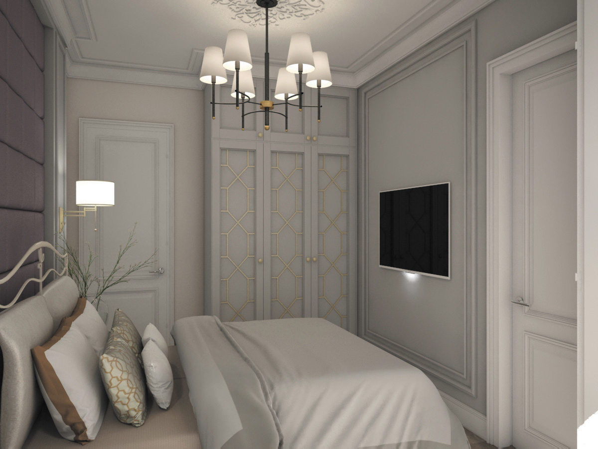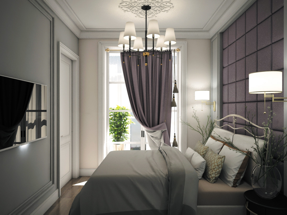 Дизайн спальни в стиле современной классики разработан для семейной пары. Интерьер выполнен в сдержанных серо-бежевых тонах. Мягкость и уют помещению придает декор из стеновых панелей серо-фиолетового оттенка.