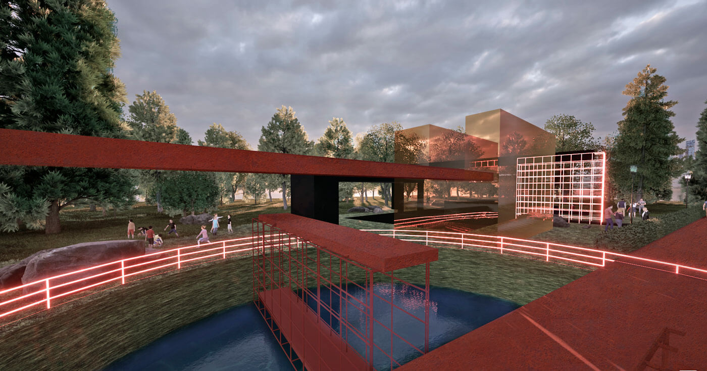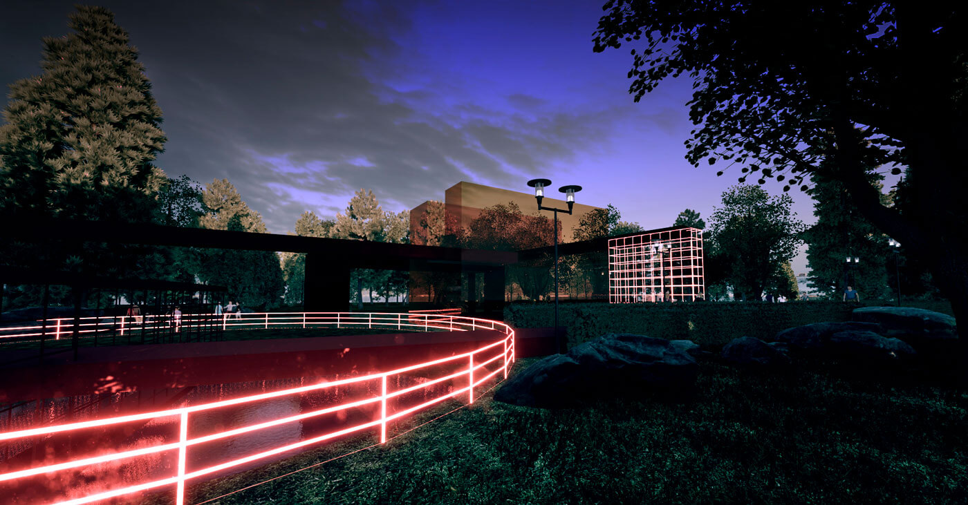 <Наша парковая композиция – это определенно точка притяжения для посетителей, которая позволяет взрослым насладится созерцанием водных элементов, детям организовать подвижные игры с элементами исследования окружающей природной среды. Множество различных элементов: площадки, мостики, стилизованные скамейки выполнены из самых разных традиционных и современных материалов - все это располагает посетителей к комфортному пребыванию в парковой зоне. Ночная подсветка элементов дополнительно подчеркивает общую композиционную идею. В качестве озеленения площадки максимально используются дикорастущие виды местных растений без специального ухода.